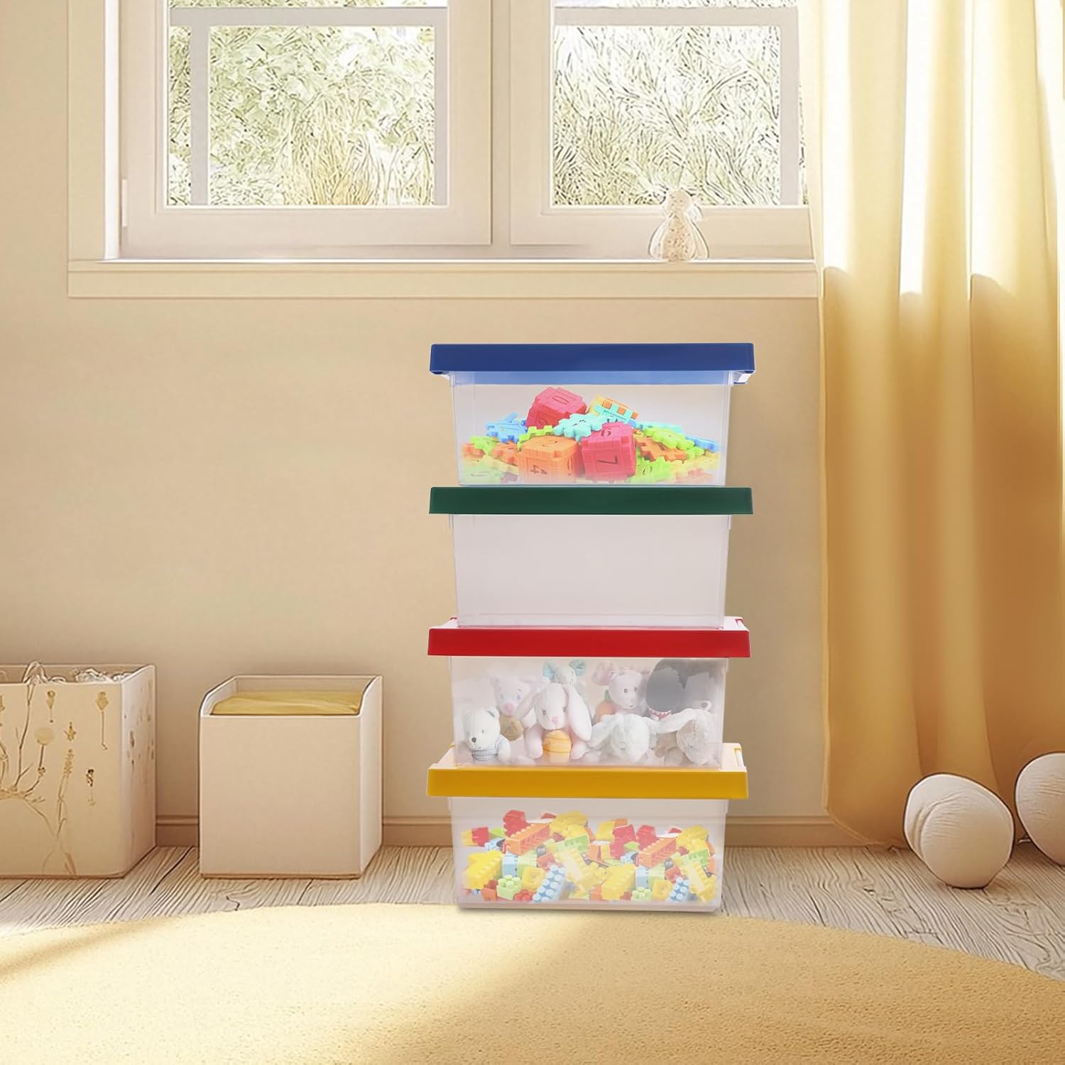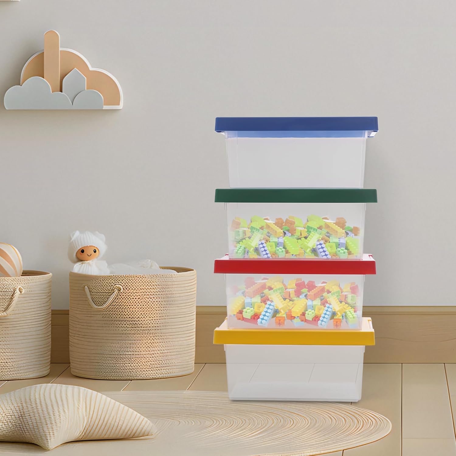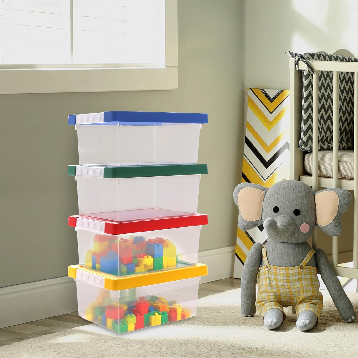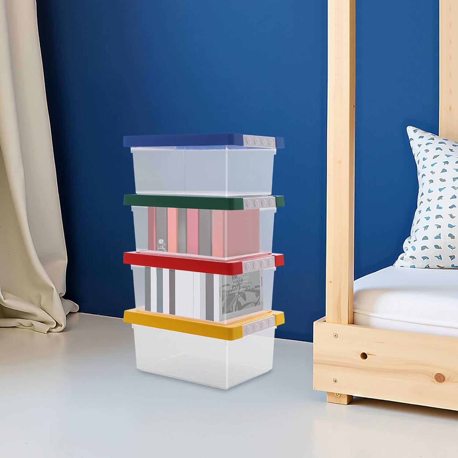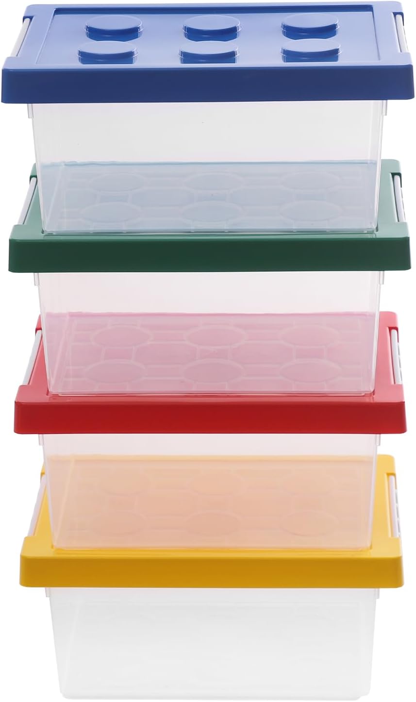 Made to Last: il materiale PP è leggero, anticorrosione, antigraffio e durevole, che garantisce una lunga durata. Design impilabile: la parte inferiore di questi costi di stoccaggio è progettata con scanalature, che consentono loro di essere impilati in modo stabile e salvaspazio senza ribaltarsi. Set da 4 pezzi: questo prodotto contiene 4 scatole di stoccaggio che possono soddisfare le vostre maggiori esigenze di stoccaggio. Nel frattempo, i 4 diversi colori mettono in risalto il divertimento dei bambini e sono in armonia con l'ambiente della stanza dei bambini. Grande capacità: la capacità di una singola scatola di immagazzinaggio è di 5 l, il che ti dà abbastanza spazio per riporre giocattoli di mattoncini da costruzione, giocattoli di peluche o altri piccoli giocattoli del tuo bambino e mantenere la stanza pulita e ordinata. Usi versatili: perfetti per riporre mattoncini da costruzione, peluche, bambole Barbie, trottole o altri giocattoli sciolti che possono essere facilmente persi.Puoi anche usarli per oggetti di uso quotidiano come libri, vestiti, asciugamani, forniture per ufficio, strumenti, ecc.