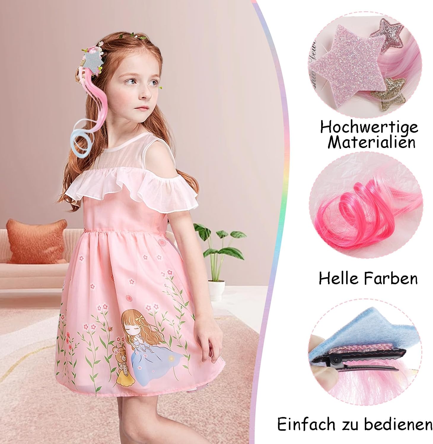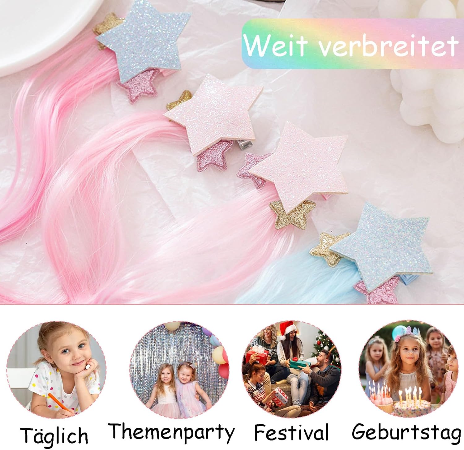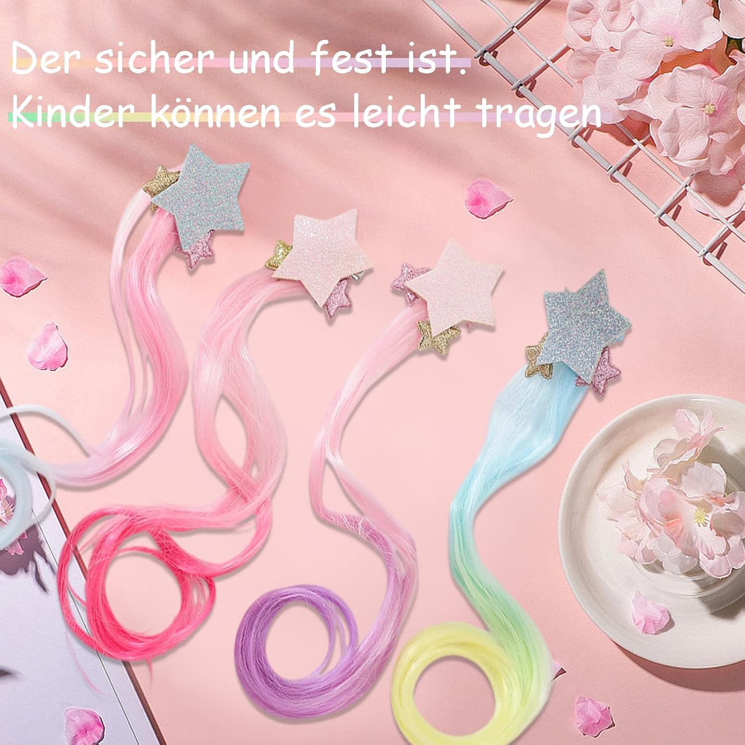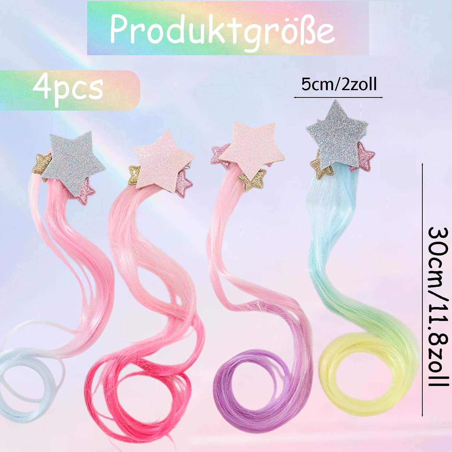 Contenuto della confezione: set di 4 colori diversi di extension per capelli colorate, fantastici fermagli per capelli per ragazze, numero e stili sufficienti, fascia con fermagli per soddisfare le diverse trecce dei capelli della tua principessa e le esigenze delle feste. Materiale di qualità: le extension per capelli sono realizzate in fibra sintetica di alta qualità (seta ad alta temperatura), fermagli in metallo importati, elevata flessibilità e stabilità. Sicuro e solido. I bambini possono indossarlo facilmente. Misura adatta: ogni treccia neon è lunga circa 30 cm con una piccola clip sulla parte superiore, meravigliosi accessori per decorare i tuoi capelli naturali. Adatto per ragazze con i capelli lunghi dai 3 ai 12 anni Design meraviglioso - 4 diversi tipi di fermagli per extension con stella a cinque punte, diversi stili e colori di capelli intrecciati colorati, brillano al sole, glitter e lucentezza, rendendo le tue ragazze più vivaci e belle, facendole risaltare dalla massa Ampiamente usato - Questa extension per capelli con stella a cinque punte per bambini sarà il tuo gioiello preferito per trecce e parrucche per diverse occasioni, come feste di compleanno, viaggi giornalieri, festival musicali, vacanze, feste in maschera, Natale, ecc.