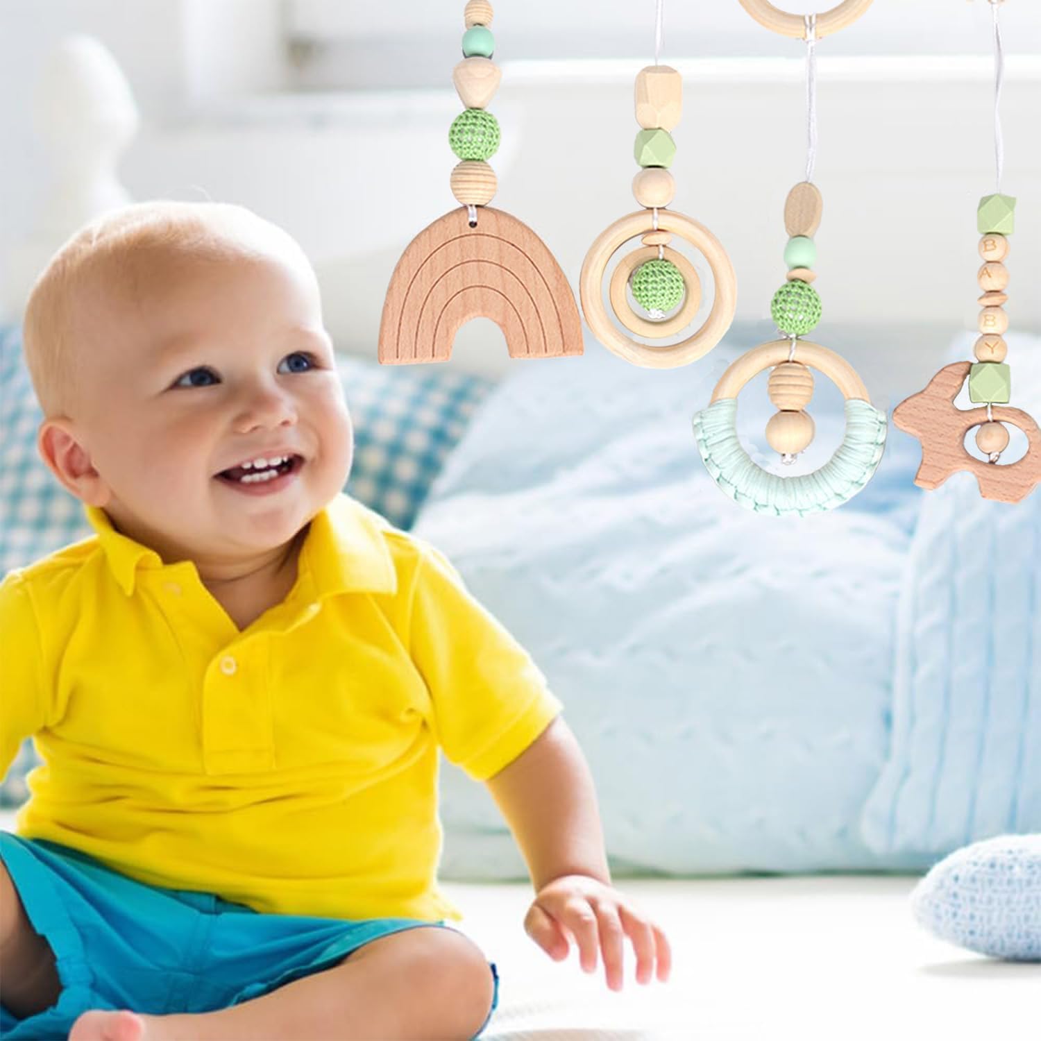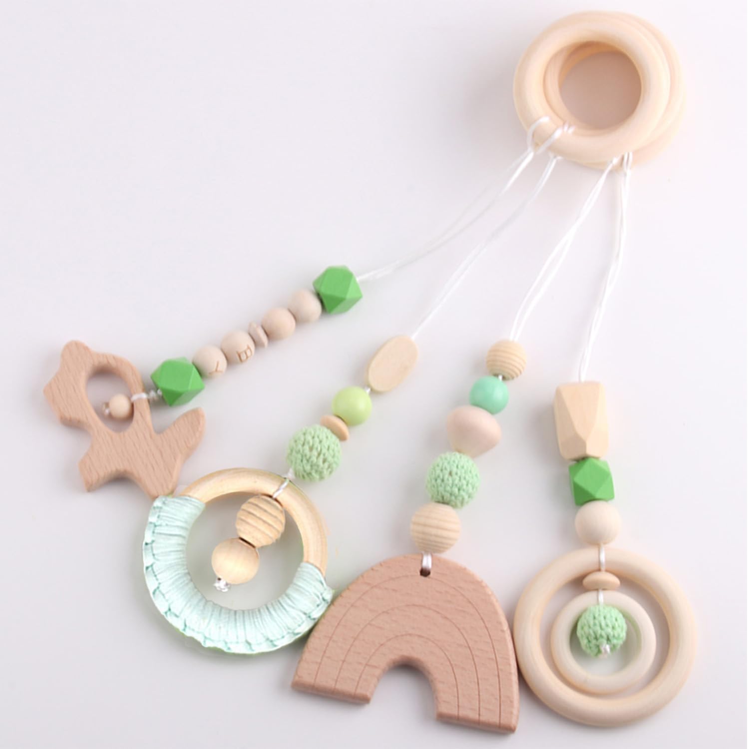 Materiali di Alta Qualità: Il ciondolo è realizzato in legno di alta qualità, privo di bisfenolo A, resistente e durevole, interamente realizzato a mano, con una superficie liscia e priva di sbavature. Tutti gli accessori sono sicuri per la pelle e la salute del vostro bambino. Attira l'Attenzione Del Bambino: La forma carina e i colori vivaci dei giocattoli in legno attirano l'attenzione del bambino e stimolano la vista. Promuove Le Capacità Motorie e Sensoriali: Il ciondolo stimola la capacità di presa delle dita dei bambini, stimola le capacità sensoriali attraverso il contatto con superfici lisce e irregolari e incoraggia il bambino a giocare. Regalo Perfetto: Il ciondolo è perfetto per feste di benvenuto al neonato e feste di compleanno, ed è il regalo ideale per amici, familiari e colleghi in attesa di un neonato. È un regalo perfetto per compleanni, ringraziamento e capodanno, sia per maschietti che per femminucce. Ampia Applicazione: Il giocattoli pendenti neonato è perfetto per auto, passeggini, culle o sedie a dondolo. Attira l'attenzione del bambino e libera le mani delle mamme.