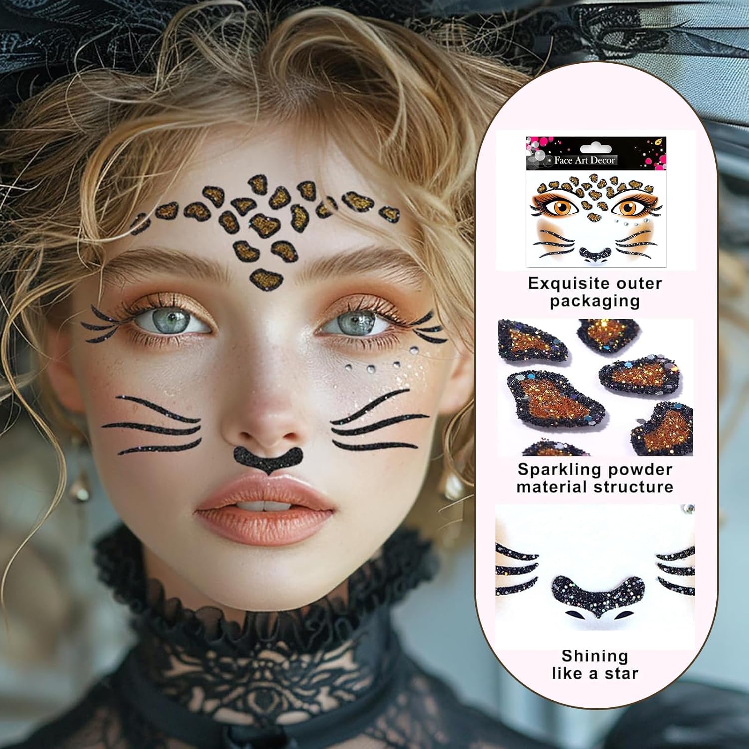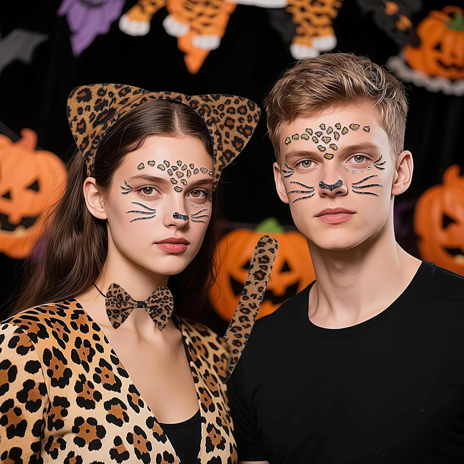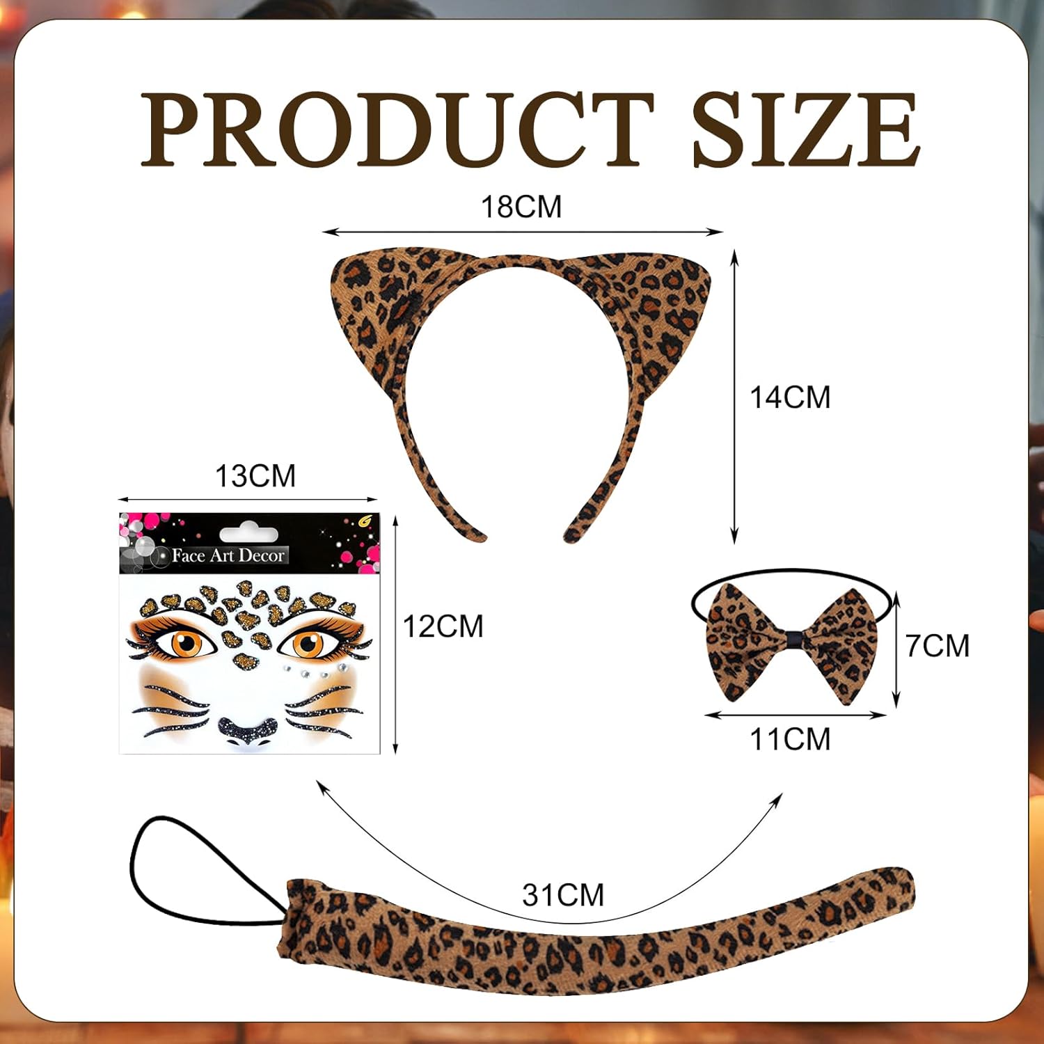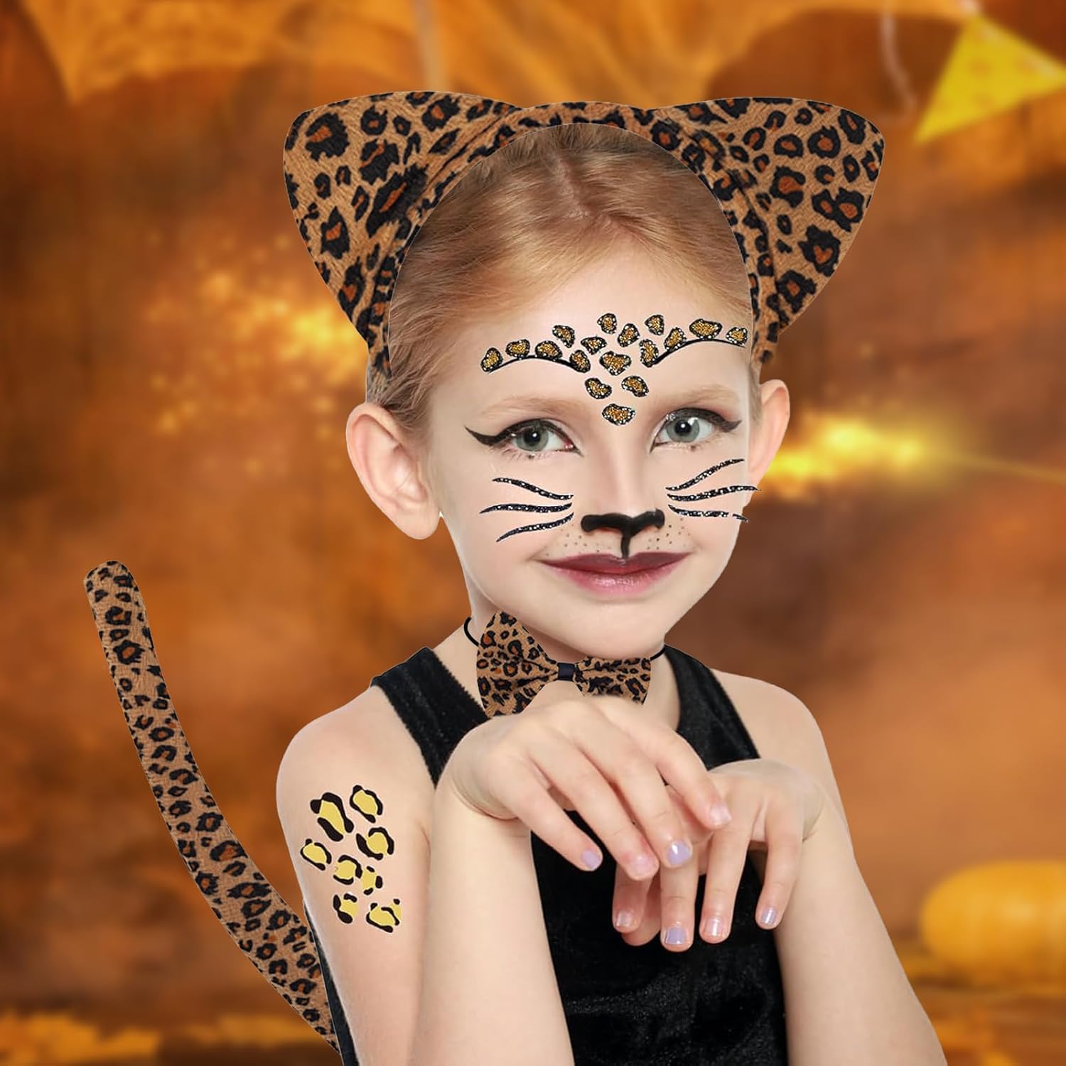 Costume da leopardo per donna: il prodotto contiene 1 fiocco, 1 coda di gatto, 1 adesivo tatuaggio leopardo, 1 cravatta leopardo, per un totale di 4 set. Una varietà di accessori carini ti consentono di creare facilmente uno stile selvaggio e sexy. Set costume leopardo: realizzato in materiale di alta qualità, atossico e inodore, pratico e riutilizzabile. Comodo e morbido da indossare, non si deforma facilmente, facile da indossare e da togliere, per un'esperienza d'uso confortevole. Dimensioni perfette: la fascia con orecchie da leopardo è realizzata in plastica elastica e può essere indossata facilmente e comodamente da adulti e bambini. Il papillon e la coda da leopardo hanno fasce elastiche adatte anche alla maggior parte degli adulti e dei bambini. Adesivi realistici: adesivi diamante e tatuaggi leopardo molto realistici ti conferiscono uno stile unico, perfetto per un classico gioco di ruolo leopardo che ti donerà una presenza scintillante durante il carnevale Ampiamente utilizzato: ideale per carnevale, feste allo zoo, feste nella giungla, travestimenti, Halloween, Natale, giochi di ruolo, eventi scolastici e spettacoli, ecc., un regalo perfetto per bambini e amici di famiglia.