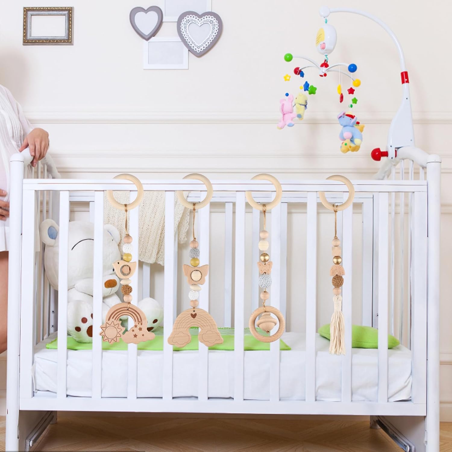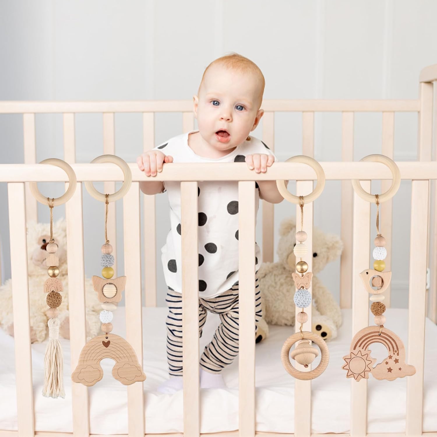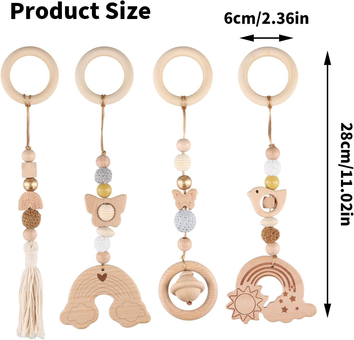 Ciondolo in legno arcobaleno: Questo set include 4 pendenti delicati e raffinati, realizzati con colori vivaci e design accattivante. Ideali per decorare la palestra del bambino o per creare accessori artigianali fai-da-te. Superficie liscia e sicura: I pendenti sono realizzati in legno di alta qualità e cotone, con una superficie accuratamente levigata, priva di schegge e senza odore. Sono progettati per essere sicuri al tatto e comodi per i bambini che esercitano la presa. Ecologici e resistenti: Realizzati con materiali naturali e privi di cera, questi pendenti sono ecocompatibili, antiurto e durevoli. La struttura in legno offre una durezza ideale, rendendoli perfetti per un uso prolungato e resistente alle cadute. Stimolazione della presa: Perfetti per neonati e bambini piccoli, i pendenti aiutano a sviluppare le abilità motorie e la forza della presa. Un giocattolo educativo multifunzionale per favorire la crescita del bambino. Confezione raffinata: Il set di 4 pendenti viene confezionato in un elegante sacchetto perlato bianco, ideale come regalo o per la conservazione. Dimensioni compatte e leggerezza (30 cm di lunghezza, peso 160 g) lo rendono facile da trasportare e utilizzare per molteplici scopi.