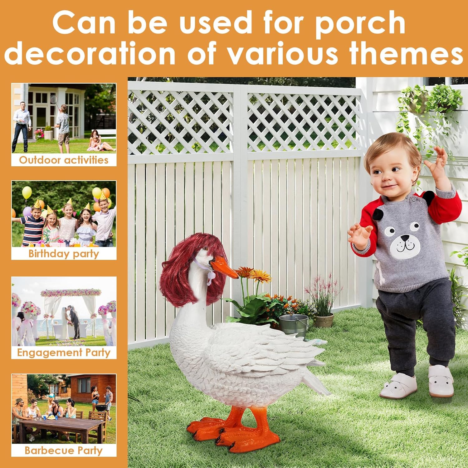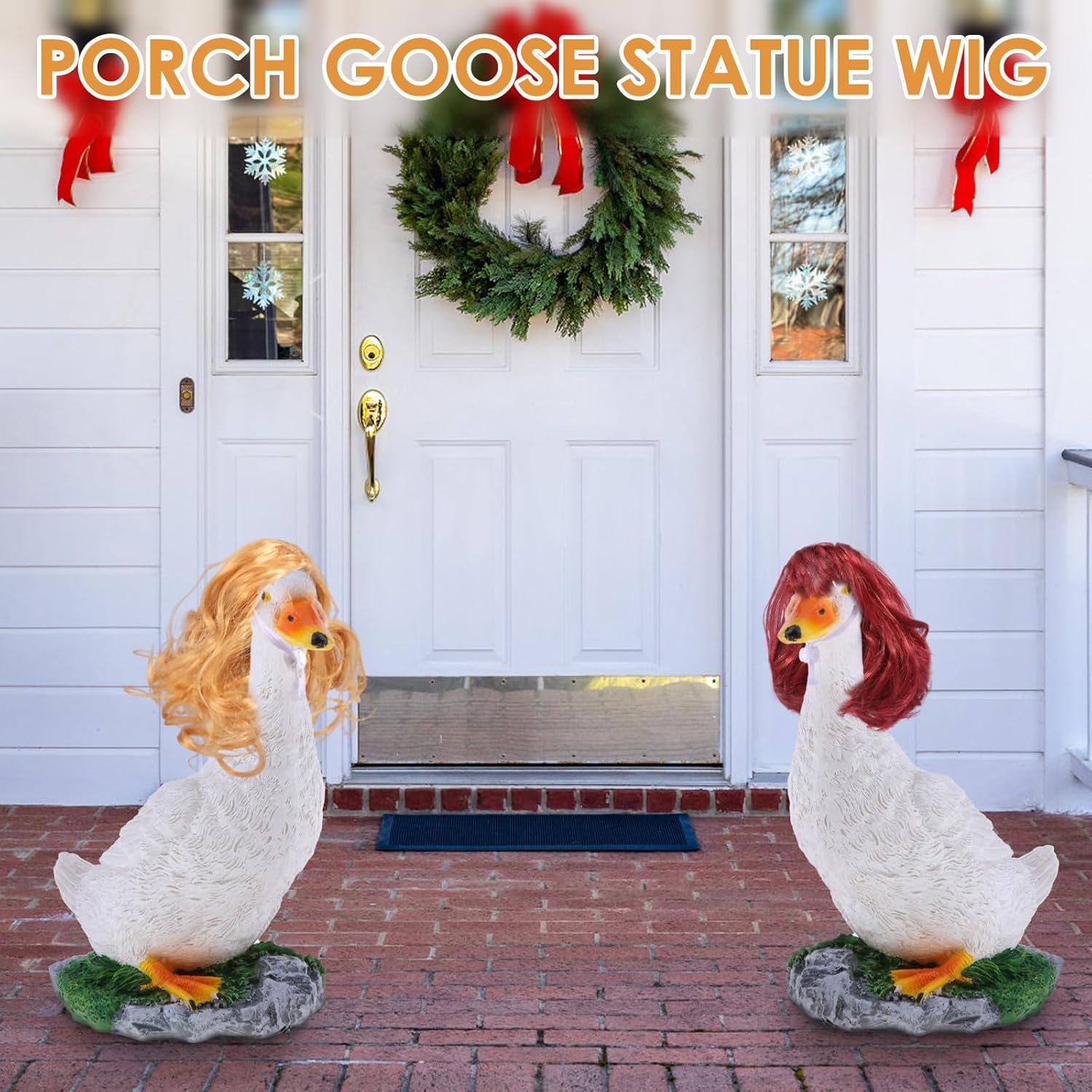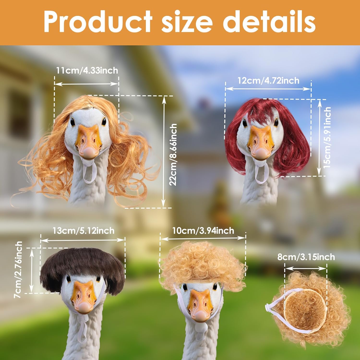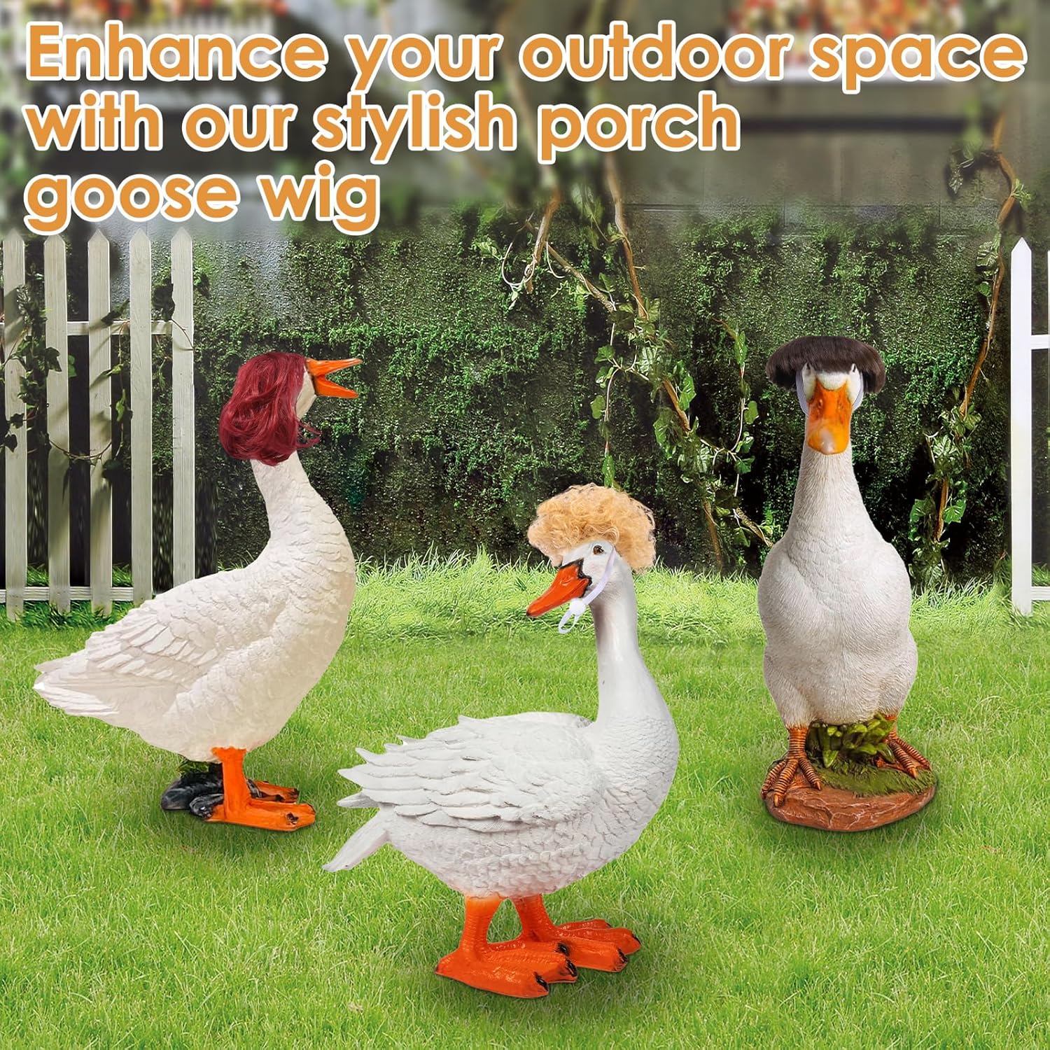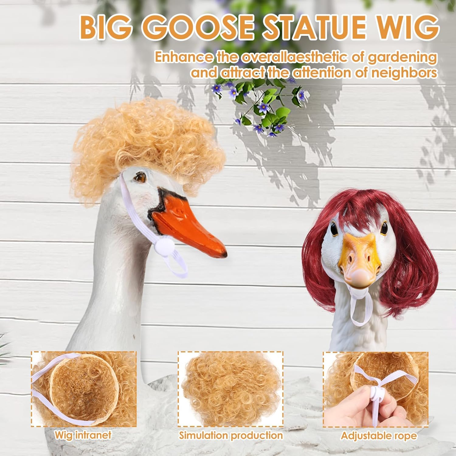 Materiale di alta qualità: la parrucca d'oca è realizzata in fibra ad alta densità, impermeabile e resistente al sole, resistente al vento e alla pioggia e non sbiadisce o si deforma facilmente dopo un uso prolungato. Progettato per uso esterno, è durevole e bello. Regolabile: la parrucca d'oca adatta per teste d'oca con un diametro di circa 10-12 cm. Le cinghie regolabili garantiscono una tenuta salda della scultura d'oca. Puoi usarlo per decorare diverse sculture d'oca e far brillare il tuo giardino. Acconciatura fai da te: la parrucca d'oca contiene quattro parrucche d'oca giocose e carine, tra cui grandi onde dorate, acconciature con pompadour, capelli corti lisci e micro riccioli rossi. Le parrucche possono essere sostituite e combinate a piacere per rendere la vostra scultura d'oca più personalizzata, sottolineare la bellezza del vostro giardino e attirare l'attenzione dei vostri vicini. Divertimento: eleganti parrucche d'oca da veranda abbelliscono il vostro spazio esterno. Queste parrucche trasformeranno il tuo giardino, prato o veranda in una decorazione unica e aggiungeranno un tocco allegro all'ambiente. Versatile: la parrucca d'oca per attività all'aperto e feste con diversi temi, come feste estive, feste di Pasqua, feste in piscina, feste di compleanno, feste di fidanzamento, barbecue, ecc.