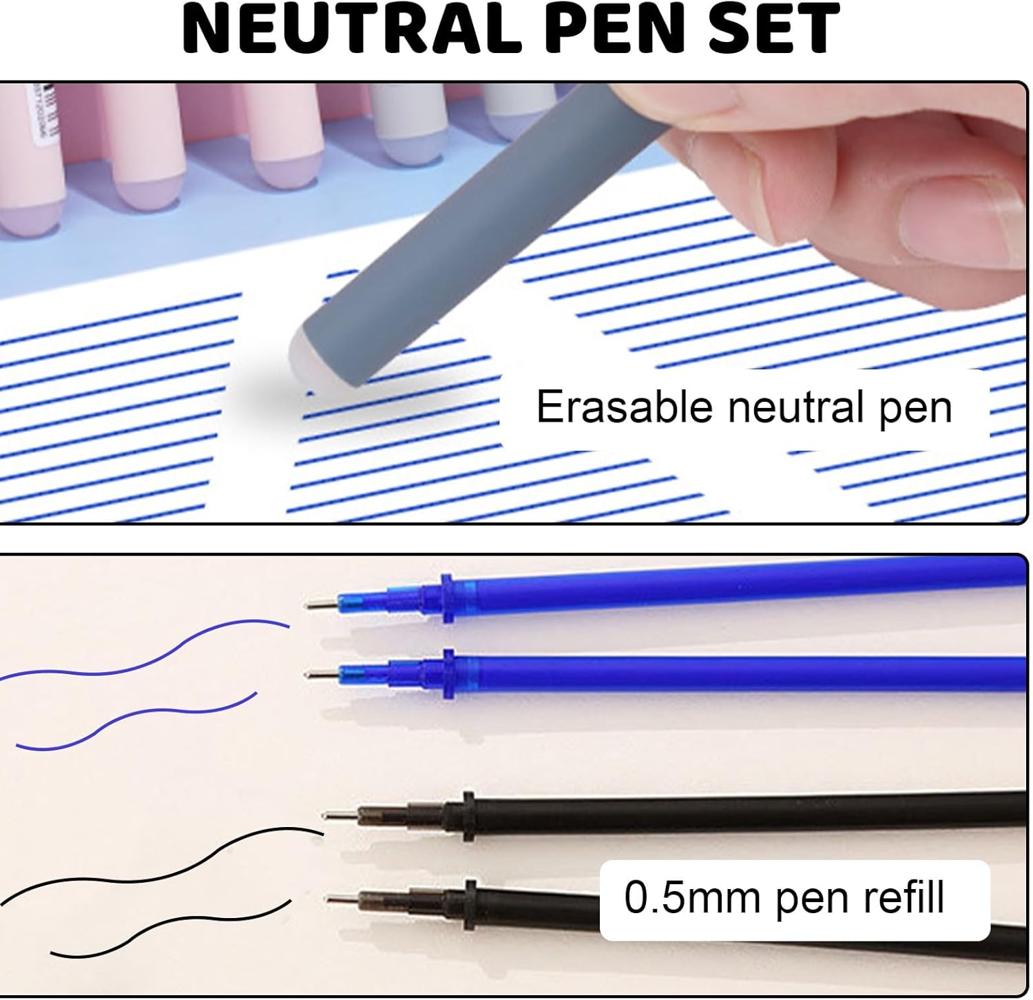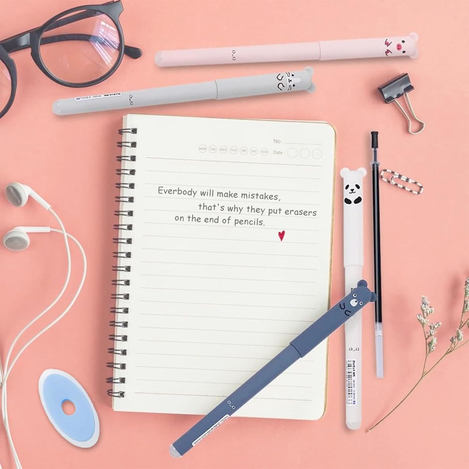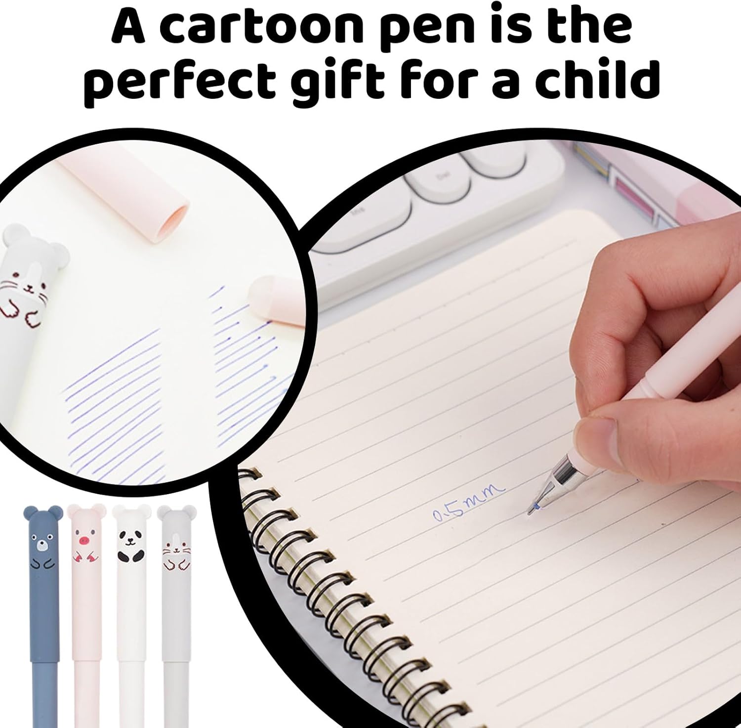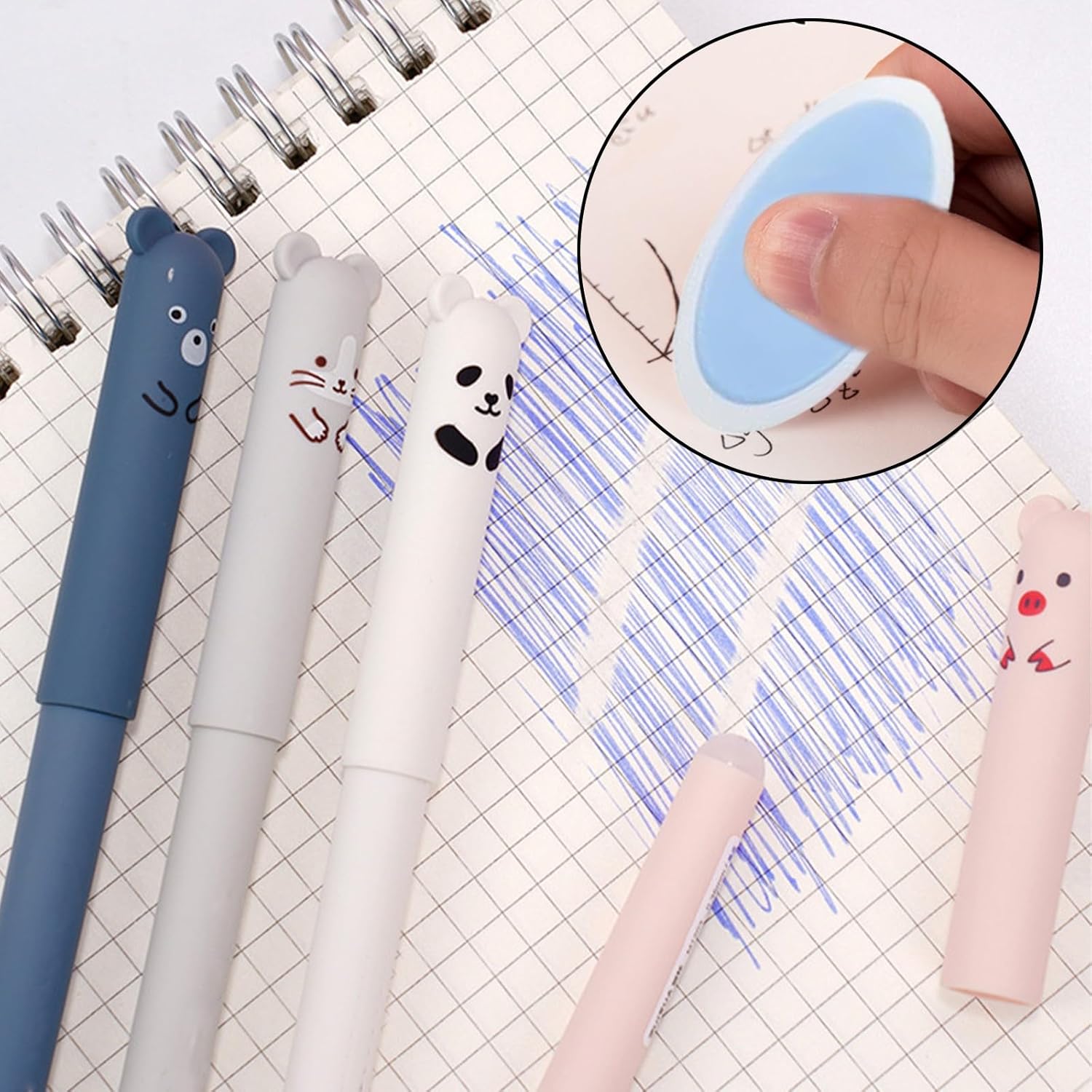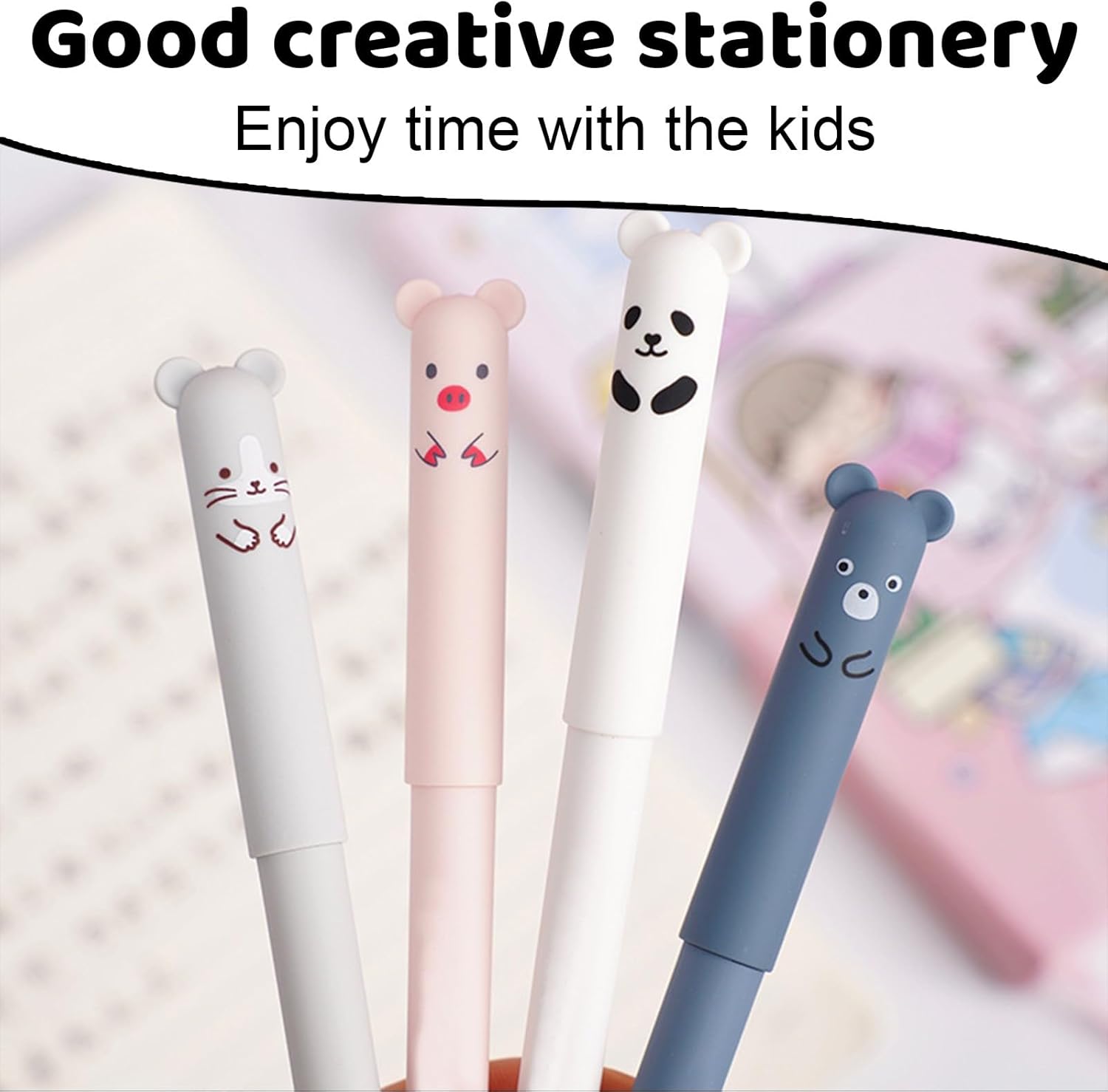SET PENNE ERASABILI: riceverete 4 pezzi di penne cancellabili contenenti panda, maiale, orso e gatto, oltre a 40 ricariche di ricambio (20 blu + 20 nere) e 2 gomme da cancellare. Diverse forme di cartoni animati e diversi colori per la vostra scelta. DESIGN UNICO: i nostri penne animali cancellabili sono progettati con cura per essere allo stesso tempo carini e durevoli, offrendo una sensazione di scrittura fluida e linee chiare. La sfera sulla punta della penna non si consuma come le normali gomme, non danneggia la superficie interessata e può essere cancellata perfettamente. CARTOLERIA CARINA: il penna gel cancellabile è piccolo e carino, leggero e facile da trasportare, il guscio in plastica non si deforma facilmente e può essere facilmente inserito in tasca. Nel frattempo, la forma simpatica può essere utilizzata anche come decorazione. ALTA QUALITÀ: il penne cancellabile è realizzato con inchiostro ecologico di alta qualità, l'inchiostro delicato scompare a causa dell'attrito e non danneggia gli appunti e i documenti. Può scrivere linee chiare e testi in modo molto scorrevole. La ricarica può essere sostituita dopo l'uso, l'inchiostro si asciuga più velocemente rispetto alle normali penne stilografiche e non sbiadisce o scolorisce. AMPIO UTILIZZO: Questo penne cancellabili gel ha un diametro di 0,5 mm, è perfetto per l'uso quotidiano in ufficio, a casa o a scuola, ed è anche un regalo perfetto per le feste dei bambini.