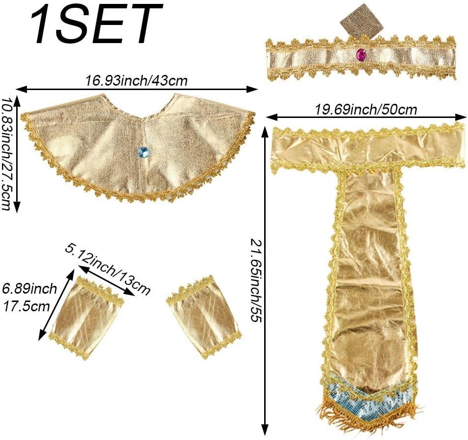 Realizzati con attenzione dettagli, questi accessori egiziani uomo presentano elementi classici del personaggio del faraone e colori vivaci. Realizzato in tessuto composito di qualità, questo costume egiziano è morbido e confortevole. Il leggero copricapo faraone garantisce una piacevole esperienza indossare. Migliora il cosplay del personaggio con questo set di accessori per costume egiziano 4 pezzi, tra cui un cappello faraone, colletto, cintura e polsini. Dimensioni: 16,93 * 10,83 pollici / 43 * 27,5 cm, 21,65 * 19,69 pollici / 55 * 50 cm, 5,12 * 6,89 pollici / 13 * 17,5 cm. Perfetto per Halloween, cosplay, spettacoli teatrali e feste a tema egiziano. Questo costume re tut può essere abbinato a vari accessori cosplay, permettendoti di creare un'immagine personale affascinante e unica.