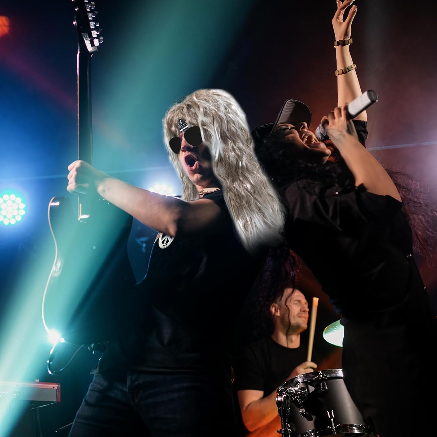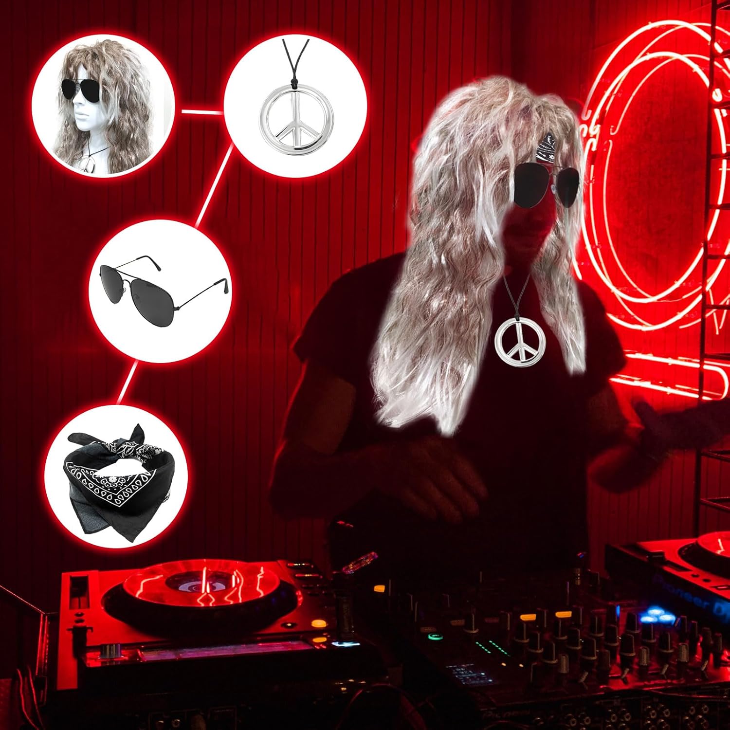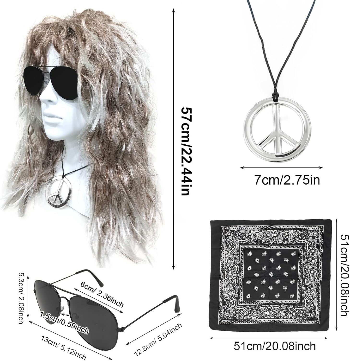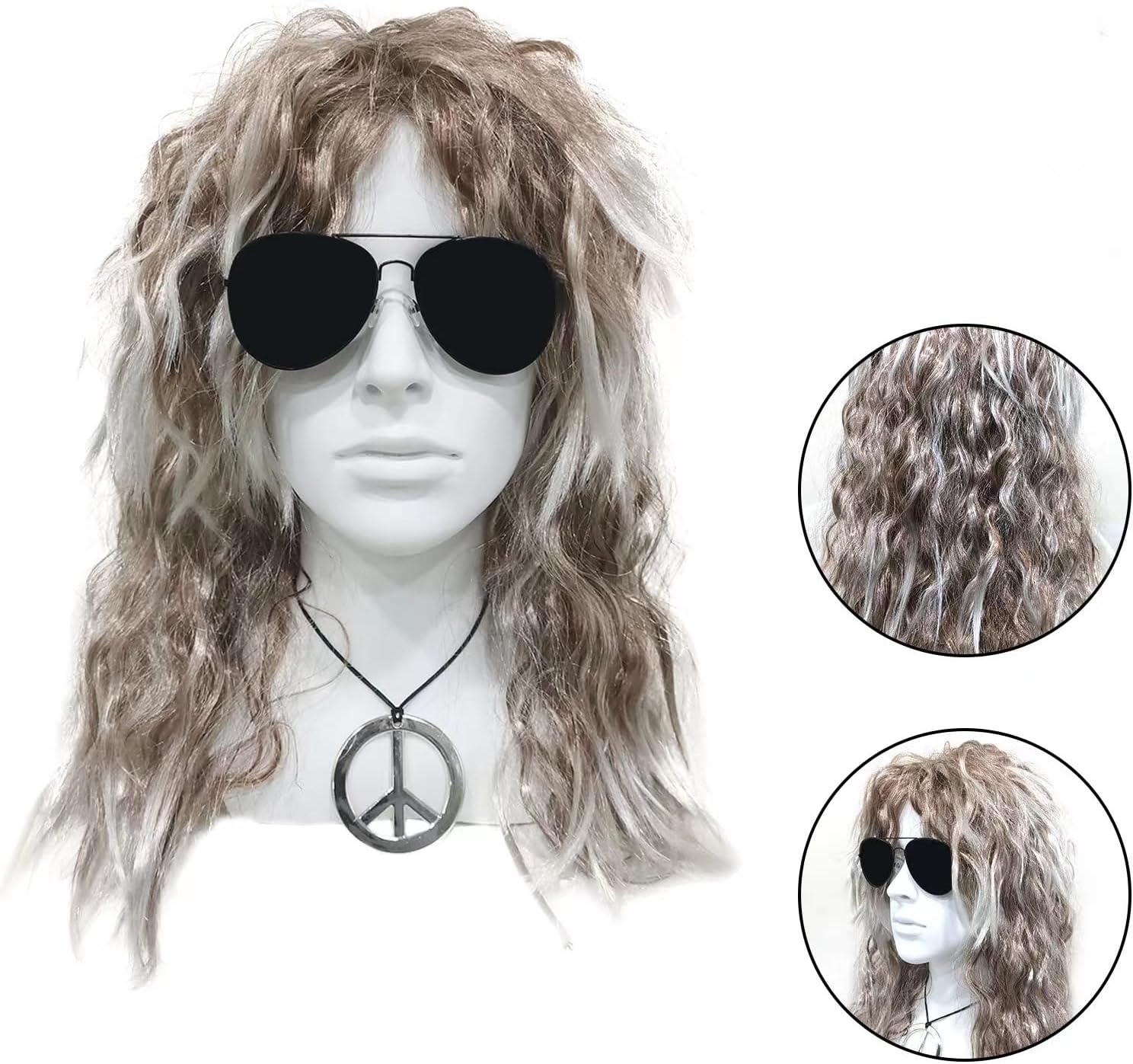 Set di parrucche rock: 1 parrucca da discoteca, 1 occhiali da sole, 1 bandana, 1 collana della pace. Con un assortimento completo di accessori per costumi da discoteca adatti alla maggior parte degli adulti e dei ragazzi, vestiti secondo il tuo stile! Per quanto riguarda il materiale: la parrucca hippie è realizzata con fibre sintetiche di alta qualità e gli occhiali da sole e la collana da discoteca sono realizzati in plastica dura e lega, che sono leggeri, comodi da indossare e possono essere utilizzati a lungo tempo. Fashion dress up: il set di parrucche da discoteca adotta un design classico e retrò, mescolandosi con la moda, lunghi capelli ricci marroni e bianchi con occhiali da sole, foulard e collana, per mostrare la tua personalità unica e farti risaltare alla festa. Occasioni: perfette per Halloween, feste, carnevali, addii al nubilato, concerti anni '60/'70/'80, feste in maschera, ecc. Regalo speciale: il costume da parrucca hippie può essere regalato come regalo unico ai tuoi cari, prova la gioia e il carnevale portati dal travestimento!