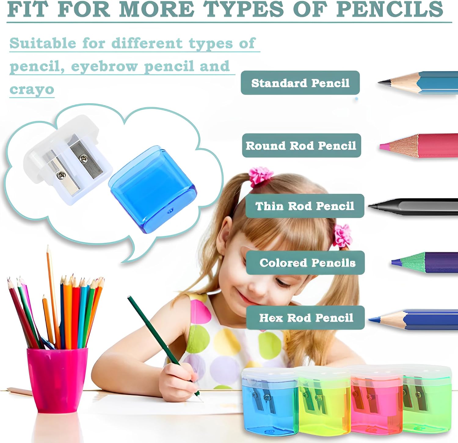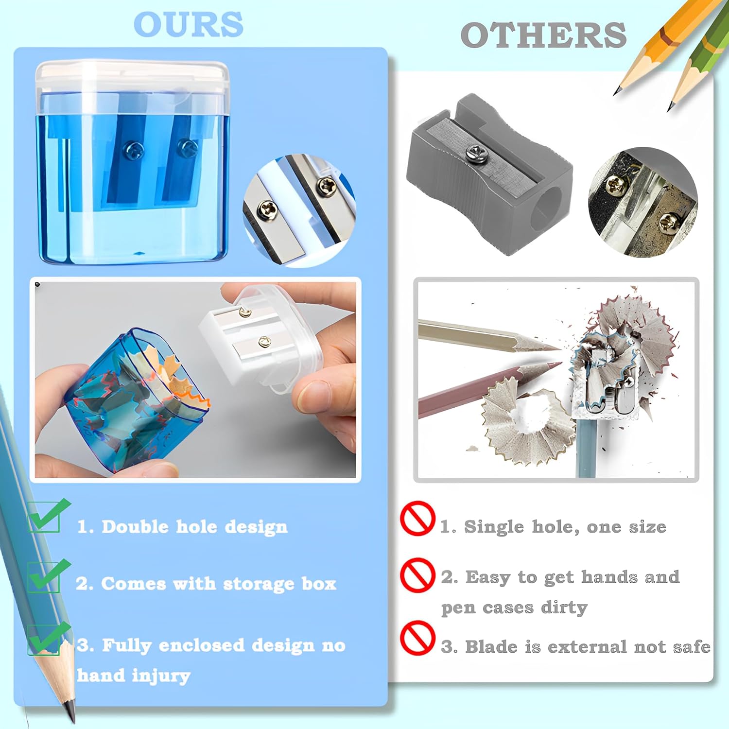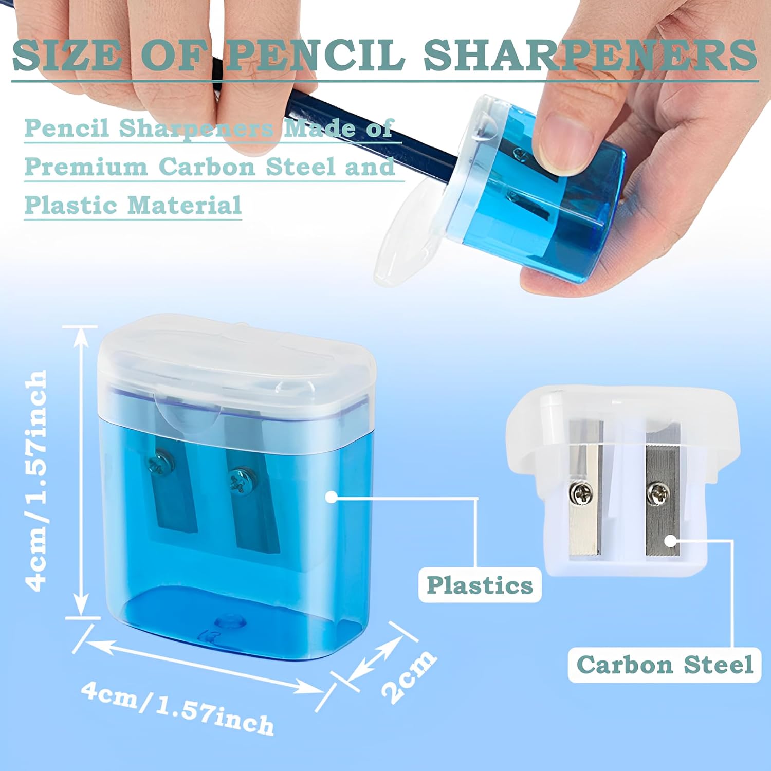 【Materiale di alta qualità】 I temperamatite utilizzano lame in acciaio al carbonio di alta qualità, affilate, robuste e difficili da abradere. Può funzionare per matite di molte dimensioni. Robusto guscio in plastica atossico e inodore, può essere utilizzato a lungo. 【Design a doppio foro】 I nostri temperamatite hanno due fori separati per matite di dimensioni diverse. Un foro per matite di dimensioni 6 mm-8 mm e l'altro per matite di dimensioni 8 mm-12 mm. Non solo per diversi tipi di matite, penne colorate, pastelli, ma anche per matite per sopracciglia. 【Sicuro】 Le lame in acciaio al carbonio di alta qualità sono completamente avvolte in un robusto guscio di plastica, quindi non devi preoccuparti che la lama possa esporre e ferire le mani del tuo bambino durante l'utilizzo. 【Facile da trasportare】 Il temperamatite portatile misura 4 cm * 4 cm * 2 cm / 1,57 * 1,57 * 0,79 pollici, piccolo e compatto, non occupa spazio. È ottimo da infilare in una borsa e ti permette anche di portarlo con te. Puoi usarlo in qualsiasi momento. 【Facile da pulire】 Il temperamatite manuale è dotato di un contenitore di raccolta trasparente che offre molto spazio per i trucioli di matita invece di essere sparsi ovunque. In questo modo, tu o tuo figlio, non sporcatevi le mani e l'astuccio della penna e avrete sempre un temperino pulito.