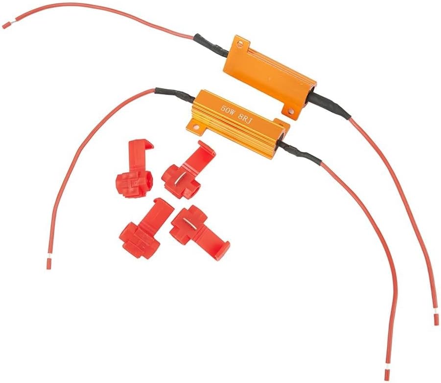 Decoder con resistenza di carico LED da 50 W e 8 Ohm: appositamente progettato per collegare indicatori di direzione iperlampeggianti. Questi resistori di carico forniscono una soluzione perfetta per il lampeggiamento veloce. Per la reazione dopo l'installazione delle lampadine a LED. Risolve il "Segnale di uscita della lampadina"/"Messaggio di errore OBC": questi resistori di carico risolvono efficacemente il problema della ricezione di messaggi di errore o segnali che indicano un guasto della lampada dopo aver sostituito le lampadine di serie con lampadine a LED. Risolve i problemi elettronici causati dalla conversione a LED: oltre a risolvere i problemi di lampeggiamento, questi resistori di carico possono anche risolvere i problemi elettronici che possono verificarsi dopo il passaggio dalle lampadine standard alle lampadine a LED. Per una facile installazione con prese a T e cavo: con un cavo da 15 cm all'estremità e raccordi a T inclusi, l'installazione è semplice. Basta collegare i fili con i connettori di giunzione inclusi senza la necessità di tagliare i fili.