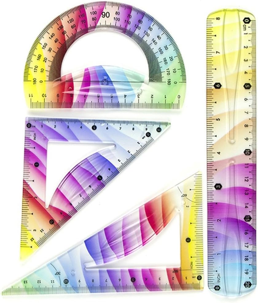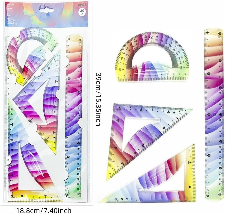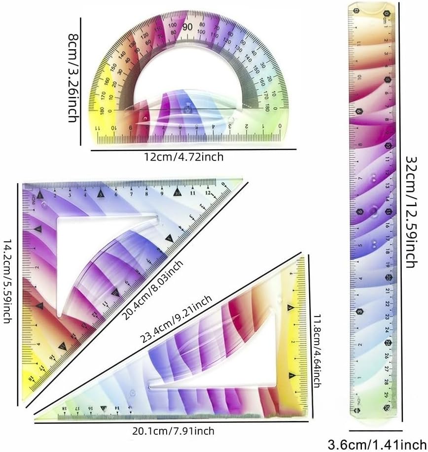 [Metrico e opzioni] Ogni righello è progettato con scale metriche e di misurazione, rendendo facile passare da un sistema all'altro per tutte le esigenze di disegno e misurazione. Design dai colori audaci: i vivaci colori sfumati non solo attirano l'attenzione, ma anche che le scale di misurazione sono facili da leggere, migliorando l'usabilità per studenti e professionisti. Flessibili e infrangibili: realizzati in materiale plastico flessibile, questi righelli possono essere piegati senza rompersi, rendendoli per l'uso su superfici irregolari mantenendo la loro forma. Per uso educativo: sicuri per l'uso in aule, case e uffici, questi righelli sono una scelta eccellente per studenti, insegnanti o chiunque sia coinvolto in attività creative.