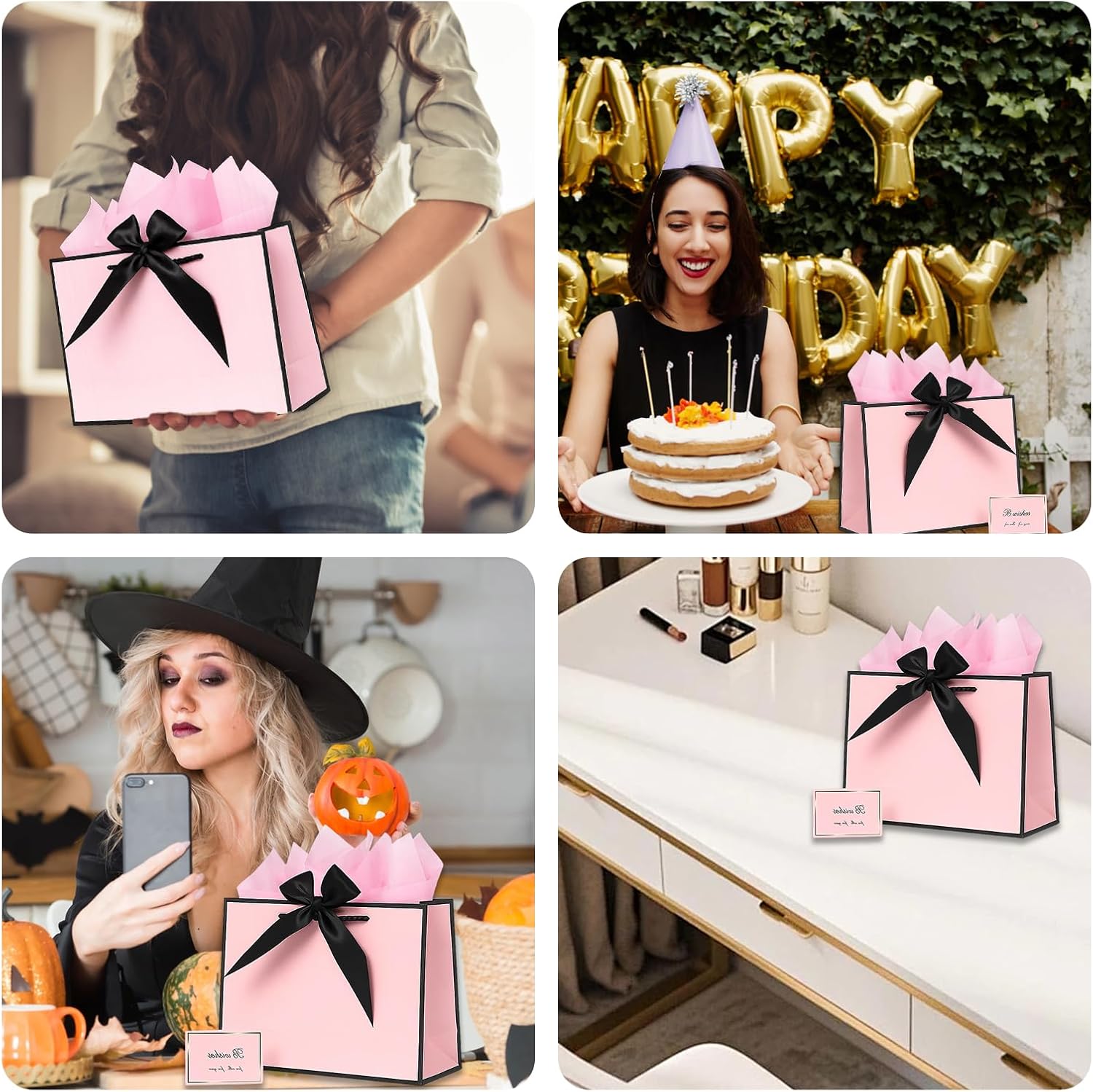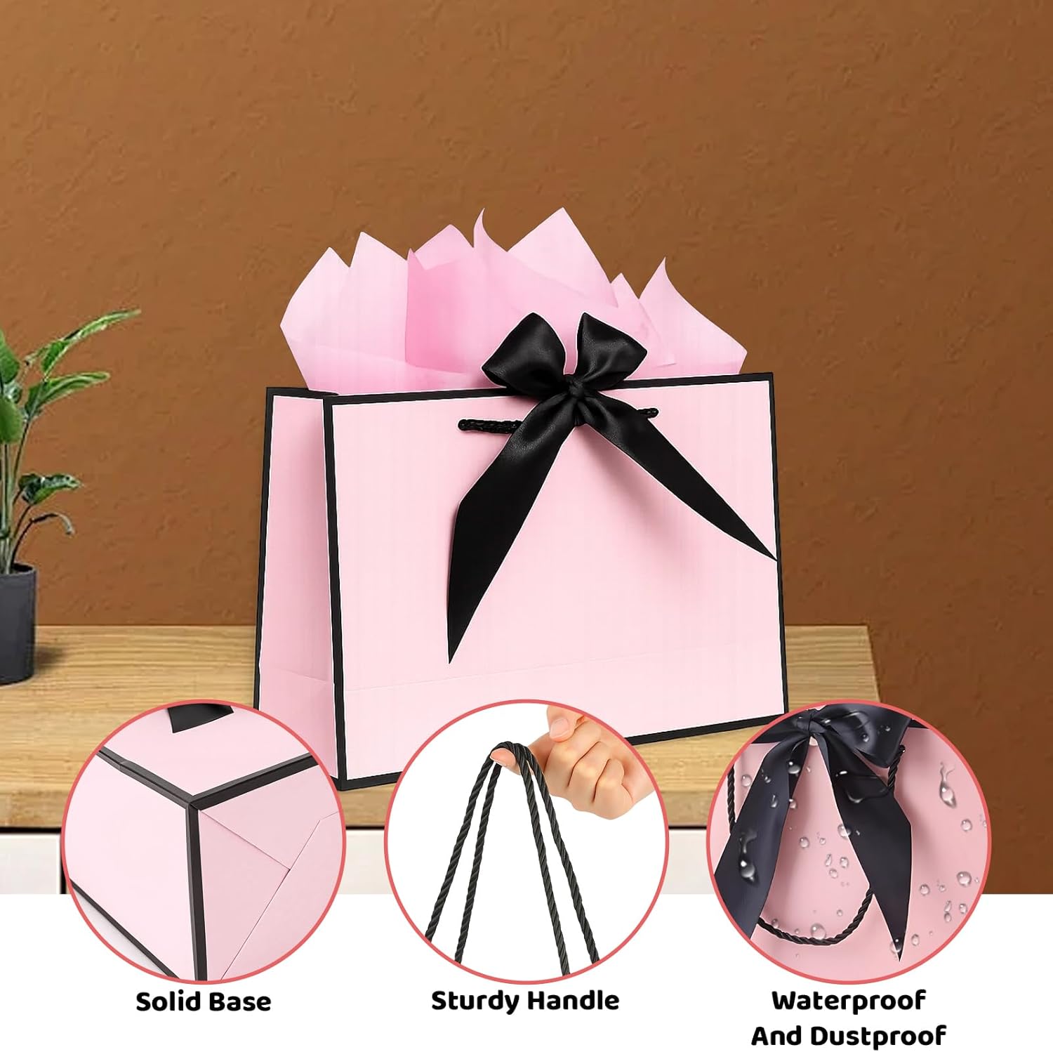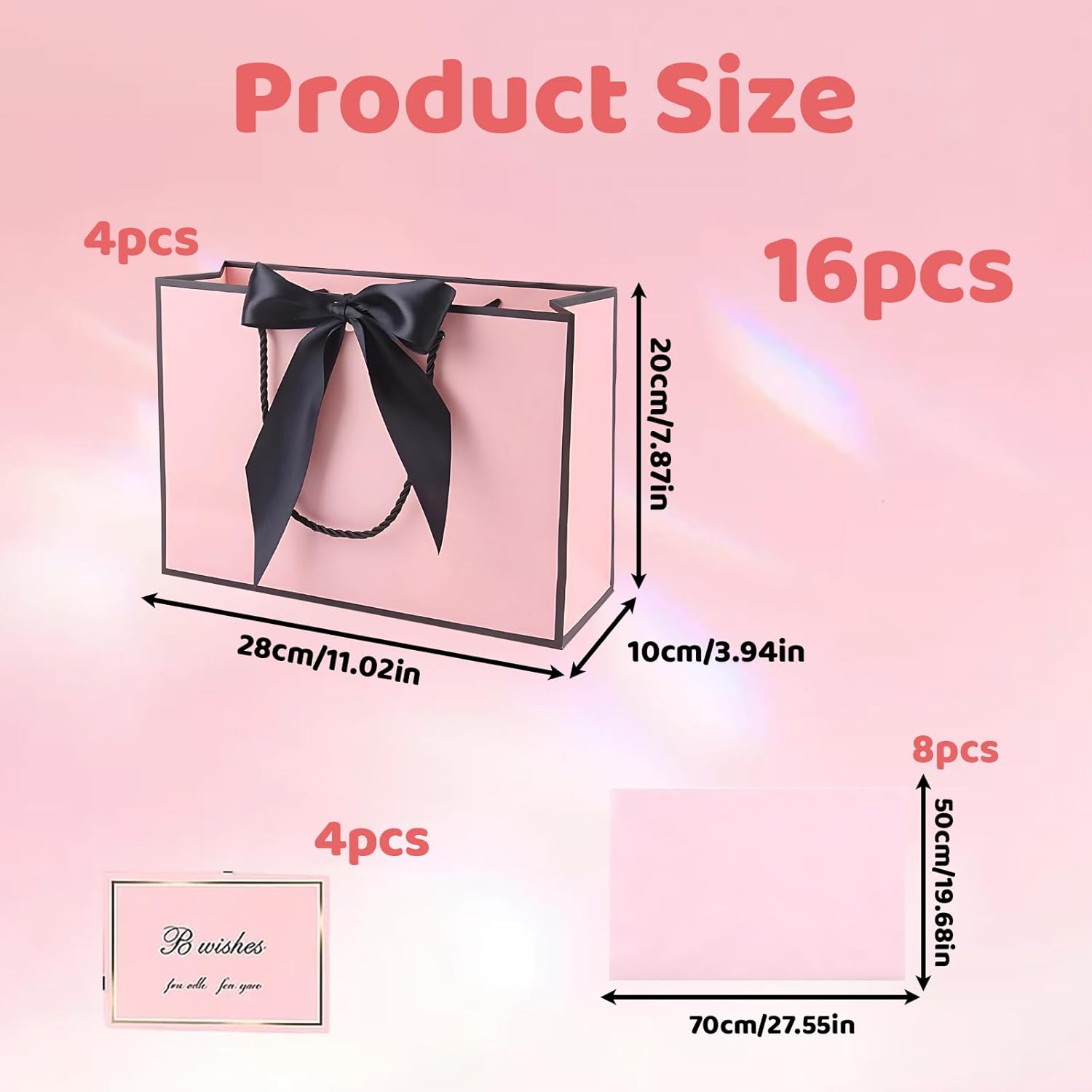 ELEGANTE CONFEZIONE REGALO: Ogni sacchetto regalo è decorato con un fiocco di alta qualità che gli conferisce un aspetto elegante; La confezione regalo è perfetta per occasioni speciali come matrimoni, compleanni e San Valentino. Set completo: la confezione comprende 4 sacchetti regalo, 4 fiocchi, 4 biglietti e 8 fogli di carta velina; Tutto ciò di cui hai bisogno per una presentazione regalo completa Materiale di alta qualità: le scatole regalo sono realizzate in carta robusta che è durevole e mantiene la sua forma; Ideale per regali di medie dimensioni e regali speciali. Ampia gamma di usi: questa borsa regalo è perfetta per damigelle d'onore, ragazze e donne; Adatto per feste aziendali, anniversari e altre occasioni festive. Tocco personale: i biglietti inclusi nella confezione regalo offrono spazio per messaggi individuali; Rendi il tuo regalo ancora più memorabile con un messaggio personale