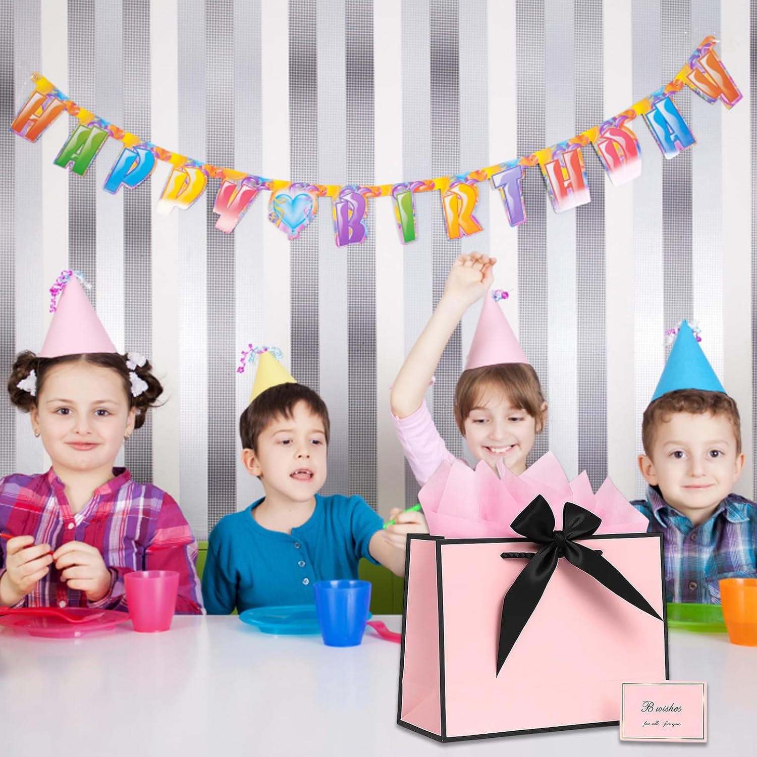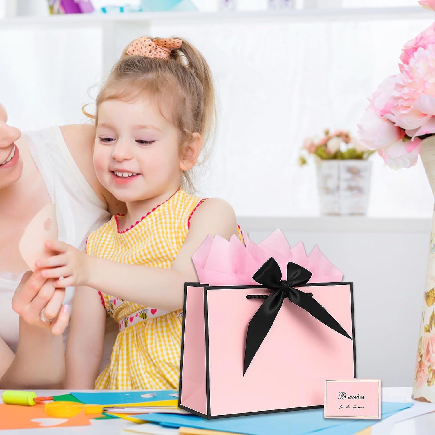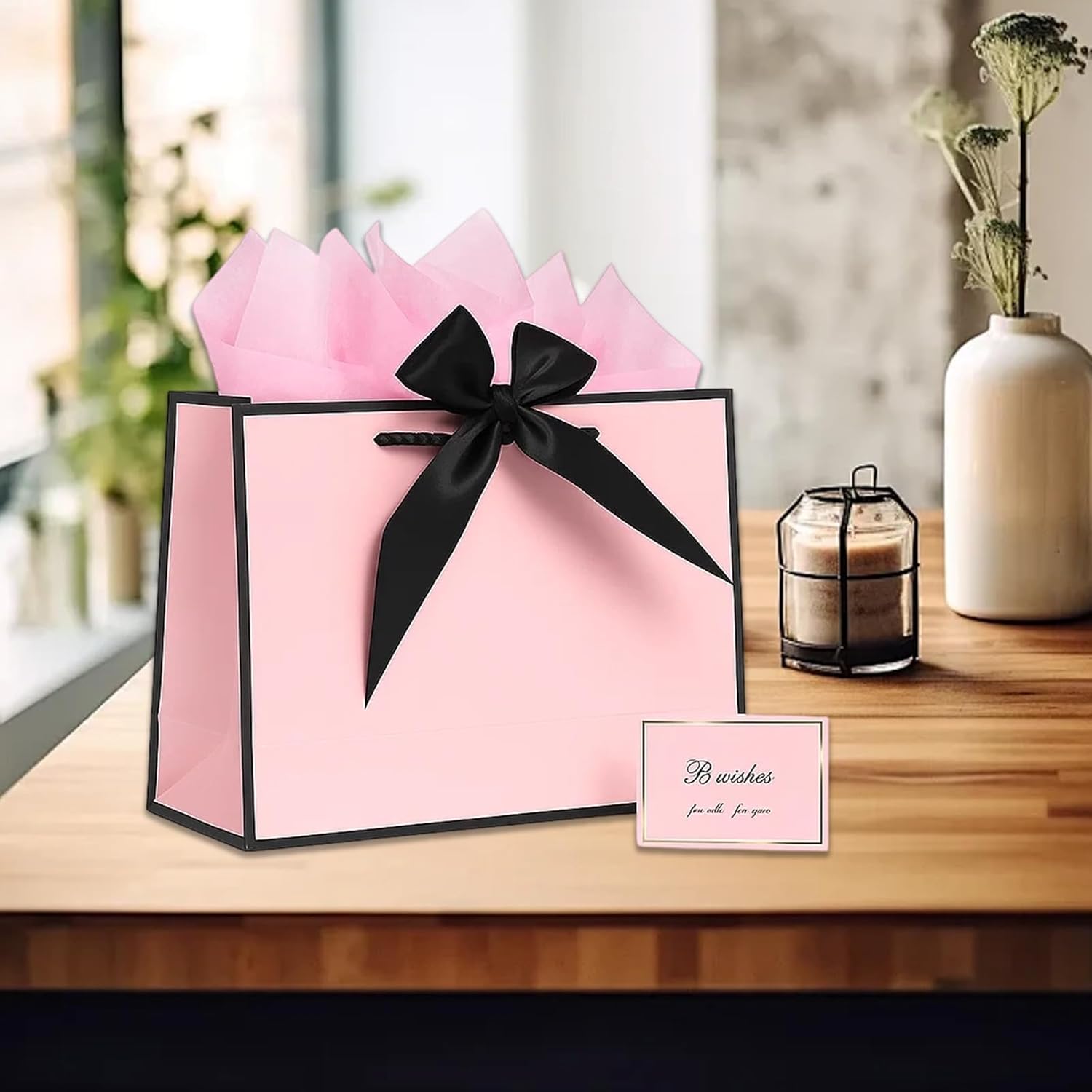 ELEGANTE CONFEZIONE REGALO: Ogni sacchetto regalo è decorato con un fiocco di alta qualità che gli conferisce un aspetto elegante; La confezione regalo è perfetta per occasioni speciali come matrimoni, compleanni e San Valentino. Set completo: la confezione comprende 4 sacchetti regalo, 4 fiocchi, 4 biglietti e 8 fogli di carta velina; Tutto ciò di cui hai bisogno per una presentazione regalo completa Materiale di alta qualità: le scatole regalo sono realizzate in carta robusta che è durevole e mantiene la sua forma; Ideale per regali di medie dimensioni e regali speciali. Ampia gamma di usi: questa borsa regalo è perfetta per damigelle d'onore, ragazze e donne; Adatto per feste aziendali, anniversari e altre occasioni festive. Tocco personale: i biglietti inclusi nella confezione regalo offrono spazio per messaggi individuali; Rendi il tuo regalo ancora più memorabile con un messaggio personale