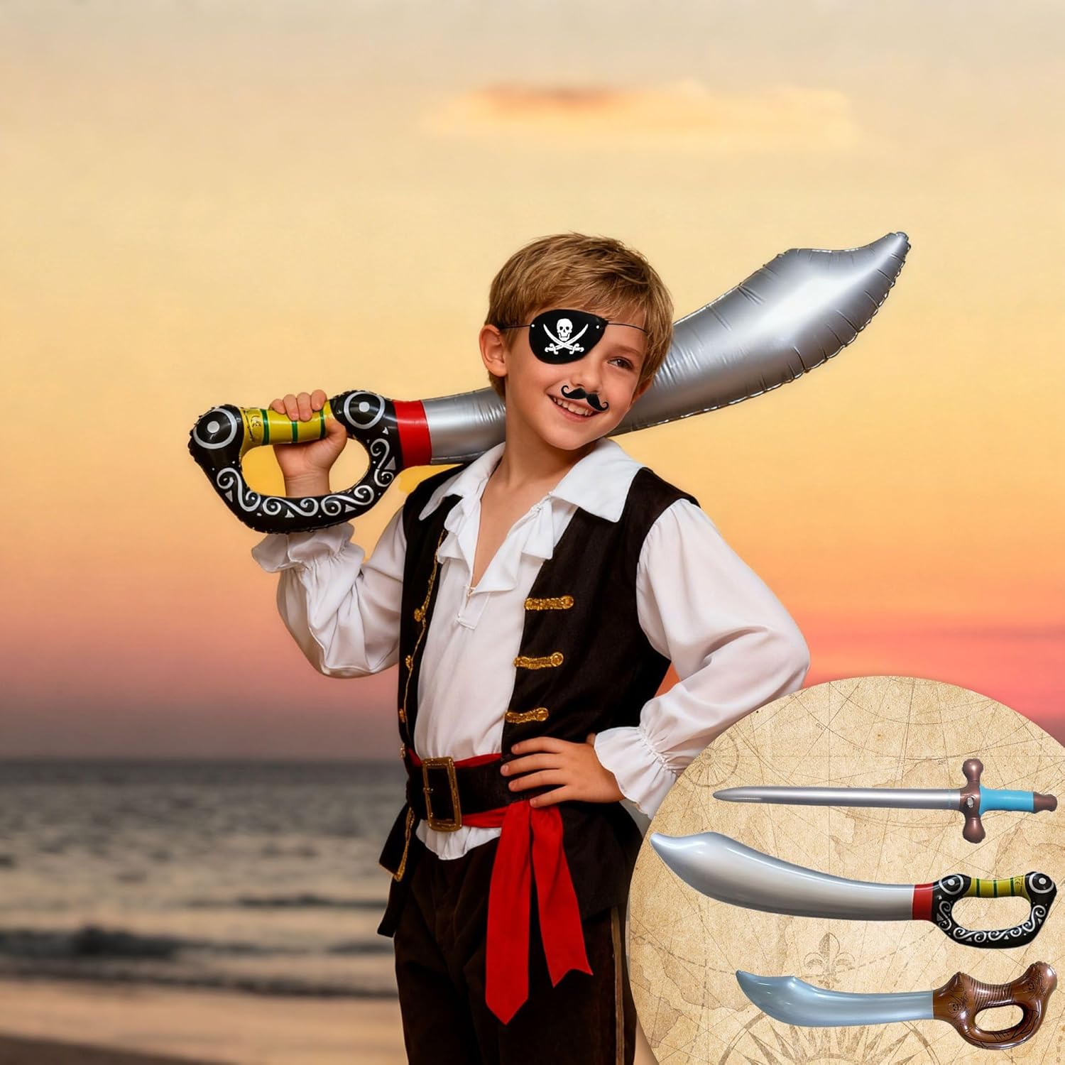 ️ Set pirata completo: 4 spade gonfiabili + 4 bende nere per gli occhi, conversione istantanea in capitano. Multifunzioni magiche: Halloween/Compleanno/Prestazione scolastica, Umore dell'equipaggio dei pirati. Gonfiaggio rapido: include una pompa per il riempimento in 3 secondi, si ripiega in formato tascabile. Facile da pulire: superficie lavabile, fascia regolabile per bambini dai 3 ai 12 anni.