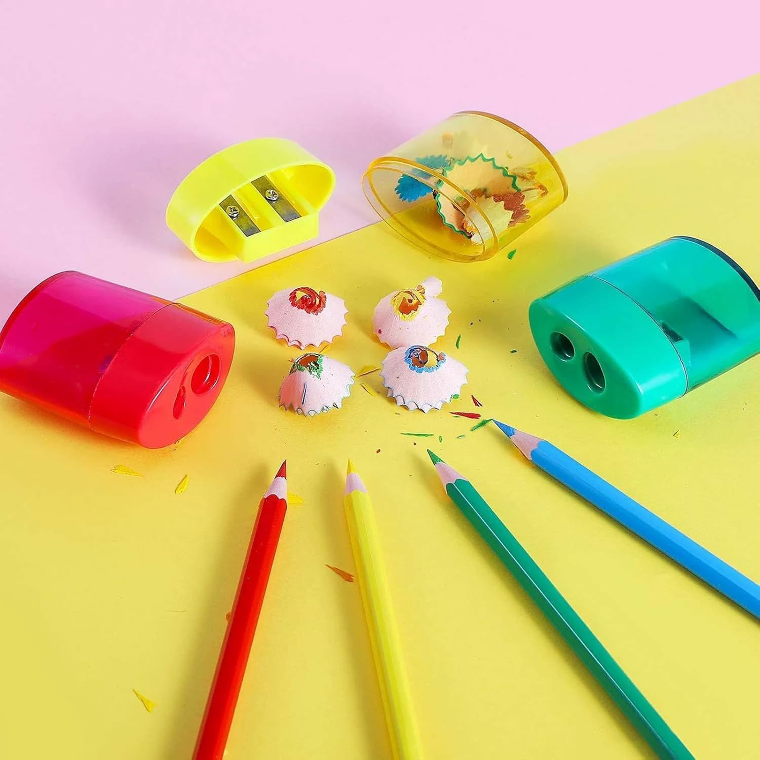 Il design a doppio foro può ospitare matite di diverse dimensioni: questo temperamatite manuale dispone di due fori per matite che possono ospitare matite di dimensioni standard (0,6-0,8 cm) e jumbo (0,8-1,2 cm). Affila vari strumenti di scrittura o disegno con facilità e precisione. Portatile e leggero per l'uso sempre e ovunque: porta con te questo temperamatite compatto e leggero, si adatta perfettamente a un astuccio, zaino o kit di forniture artistiche. Il suo design tascabile lo rende una scelta ideale per scuola, viaggi o schizzi all'aperto. Il design del cappuccio protettivo mantiene la scrivania pulita: il cappuccio protettivo di questo temperamatite raccoglie ordinatamente i trucioli, impedendo alla scrivania o all'astuccio di sporcarsi. Il design rimovibile rende facile la pulizia, rendendolo adatto per aule, case o postazioni di lavoro artistiche. Opzioni colorate: questo simpatico temperamatite è disponibile in quattro colori: rosa, blu, verde e giallo, aggiungendo divertimento alle attività di affilatura. La sua forma liscia e arrotondata è facile da tenere in sicurezza per i giovani studenti, rendendolo il compagno perfetto per le attività scolastiche. Applicazione multifunzionale: questo temperamatite colorato è adatto per scuole, uffici, progetti artistici e uso domestico, per soddisfare diverse esigenze. La lama ad alta precisione fornisce un effetto di affilatura uniforme per matite normali, matite colorate e persino matite a carboncino, rendendolo uno strumento essenziale per studenti, artisti e professionisti.