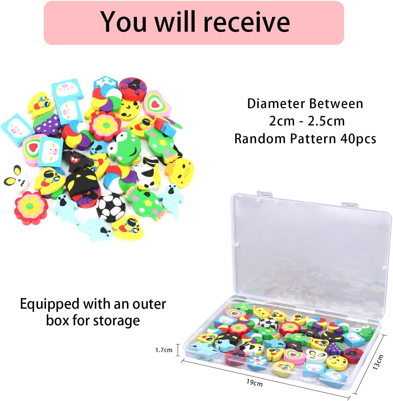 Riceverete un set di 40 mini gomme colorate con motivi casuali in una scatola per una facile conservazione. Le gomme sono realizzate in gomma morbida per cancellare facilmente e per durare nel tempo. Le mini gomme sono colorate e hanno simpatici motivi. I bambini ameranno usarle per correggere gli errori a matita. Queste gomme aiutano inoltre i bambini a sviluppare buone abitudini di scrittura, a riconoscere i diversi modelli e a stimolare la loro immaginazione e creatività. Le gomme non sono solo adatte per la classe come regalo di ricompensa per gli studenti, ma possono anche essere utilizzate come giocattoli per bambini o regali di compleanno.
