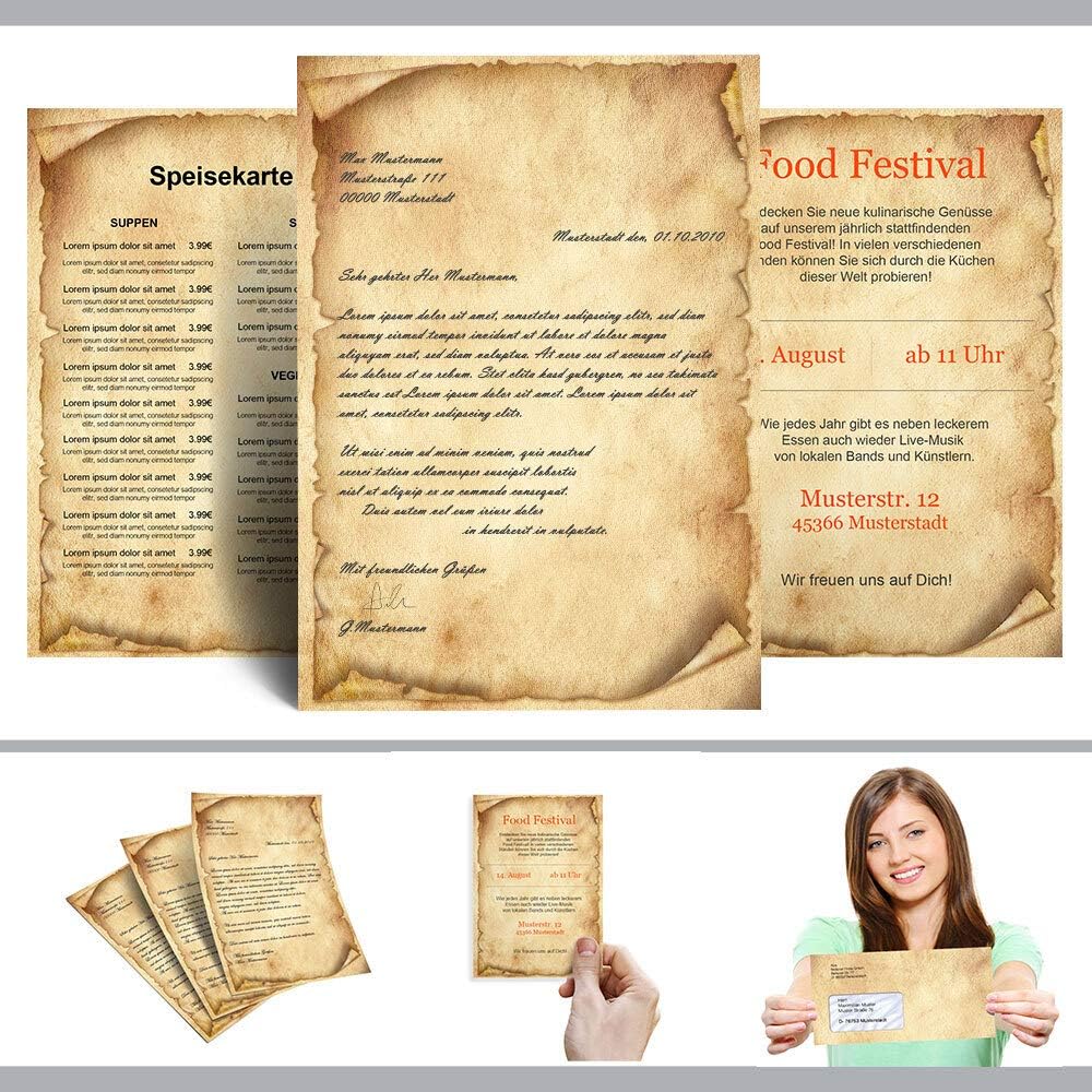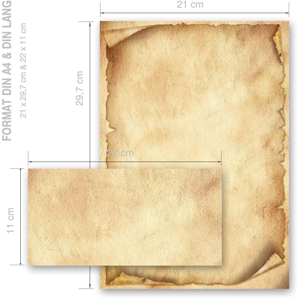 Motivo-set di cancelleria Vecchia Carta, ANTICO | Ordine in linea! | Paper-Media | 20 pezzi Carta da lettera ez 20 buste (senza finestra) La carta viene è stampata su un lato - Retro è bianco - Carta da lettera in formato DIN A4 - (210x297 mm), 90g/m² Buste formato - DIN LANG (110x220 mm) senza finestra, Autoadesive, con strisce adesive - Abbinabili alla carta da lettera con lo stesso nome, con stampa di motivi decorativi Adatta per la stampa con stampante a getto d'inchiostro o laser e per fotocopiatrici. Utilizzabile anche per la scrittura a mano. Scopri i nostri set di cancelleria con motivi unici da diverse categorie | Cancelleria e buste adatte in un set pratico Motivo-set di cancelleria Antico & Storia, Antico