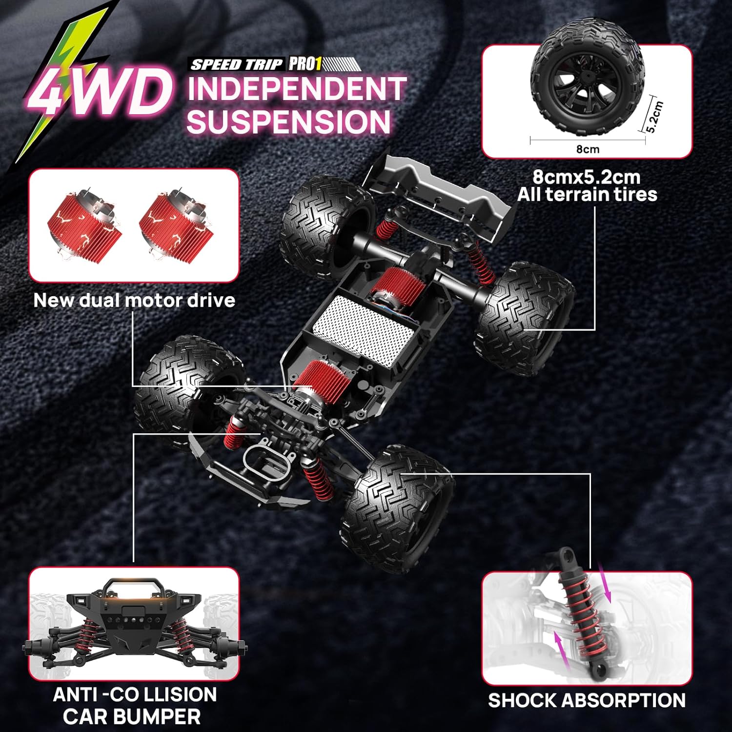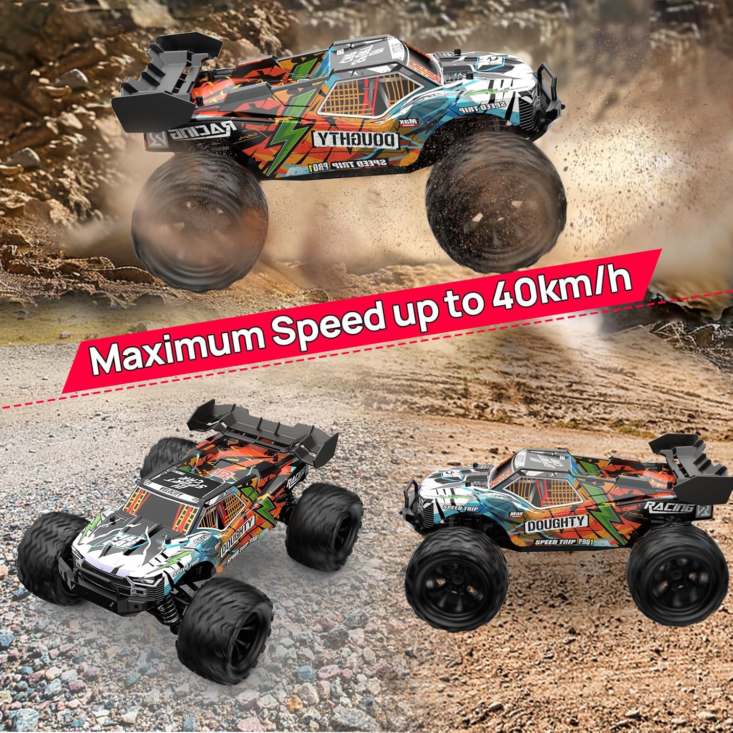 Macchina telecomandata 4WD ad alta velocità: Prova il brivido con questo Macchine telecomandate in scala 1:16, dotato di due motori a spazzole 280 che raggiungono velocità superiori a 40 km/h. Progettata per garantire le massime prestazioni, questa veloce auto RC per ragazzi e adulti affronta con facilità percorsi fuoristrada, colline ripide e terreni accidentati: perfetta per i piloti amanti dell'adrenalina. Auto telecomandato fuoristrada costruita per il gioco duro e impegnativo: Dal terreno sterrato del giardino ai sentieri rocciosi e alle spiagge sabbiose, questo monster truck telecomandate fuoristrada è pronto a tutto. Dotato di pneumatici in gomma resistenti per una forte aderenza e trazione antiscivolo, telaio solido e sistema di sospensioni a 4 ruote per una guida fluida su qualsiasi superficie. Radiocomando a 2,4 GHz con sterzo di precisione: domina la pista con un potente trasmettitore a 2,4 GHz che offre accelerazione e sterzo proporzionali. Con un raggio di controllo fino a 50 metri, potrai godere di un controllo reattivo sia che tu stia derapando, scalando o correndo. Gareggia con più RC cars contemporaneamente senza interferenze: ottimo per divertirsi in gruppo. Più tempo di gioco con 2 batterie: raddoppia il tempo di gioco con due batterie ricaricabili da 7,4 V 1500 mAh incluse. Ogni batteria garantisce fino a 20 minuti (2 batterie per un totale di oltre 40 minuti) di azione ad alta velocità. Il cavo di ricarica USB incluso mantiene il tuo camion RC carico e pronto per un divertimento prolungato con la famiglia e gli amici. Il regalo ideale per bambini e adulti che amano le macchina RC veloci: questa auto radiocomandata 4x4 da fuoristrada è un regalo di compleanno o di Natale emozionante per ragazzi, ragazze e appassionati di RC di tutte le età. Che tu sia un principiante o un pilota esperto, questo monster truck RC ad alte prestazioni offre un divertimento senza fine su ogni terreno.