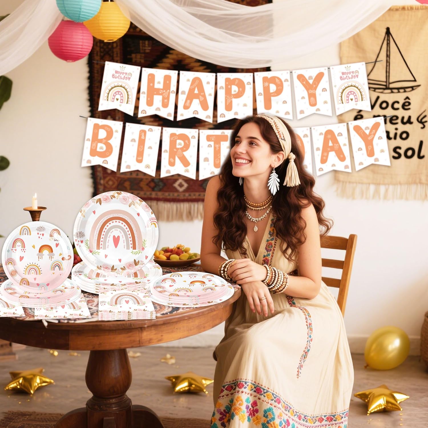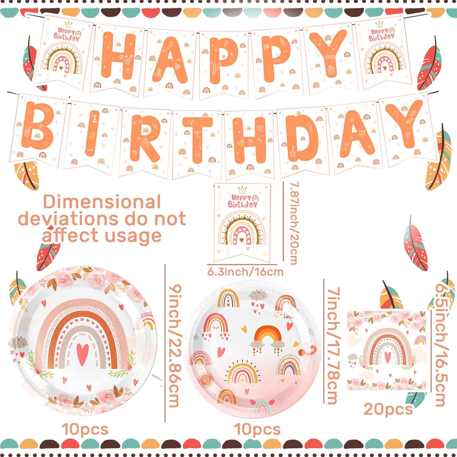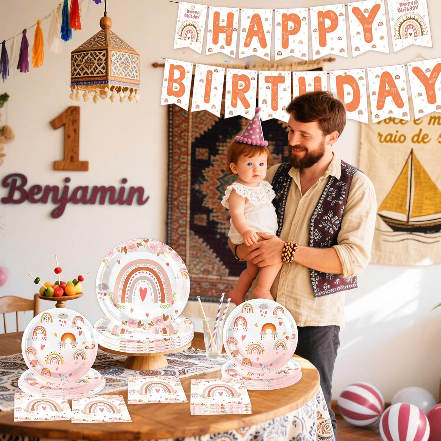 Decorare con il set di stoviglie per feste Boho Rainbow porta un'atmosfera onirica e una bellissima decorazione alla tua festa Le decorazioni per feste di compleanno Boho Rainbow offrono decorazioni fantastiche per creare un ambiente magico per la festa di compleanno. Il banner è anche lo sfondo perfetto per foto speciali Riceverai: 1 x banner 'Happy Birthday', 20 x tovaglioli, 10 x piatti 9inch, 10 x piatti 7inch Il design accattivante Boho - Rainbow crea un'atmosfera allegra e colorata ad ogni festa per bambini Se hai domande su questo prodotto, siamo felici di aiutarti