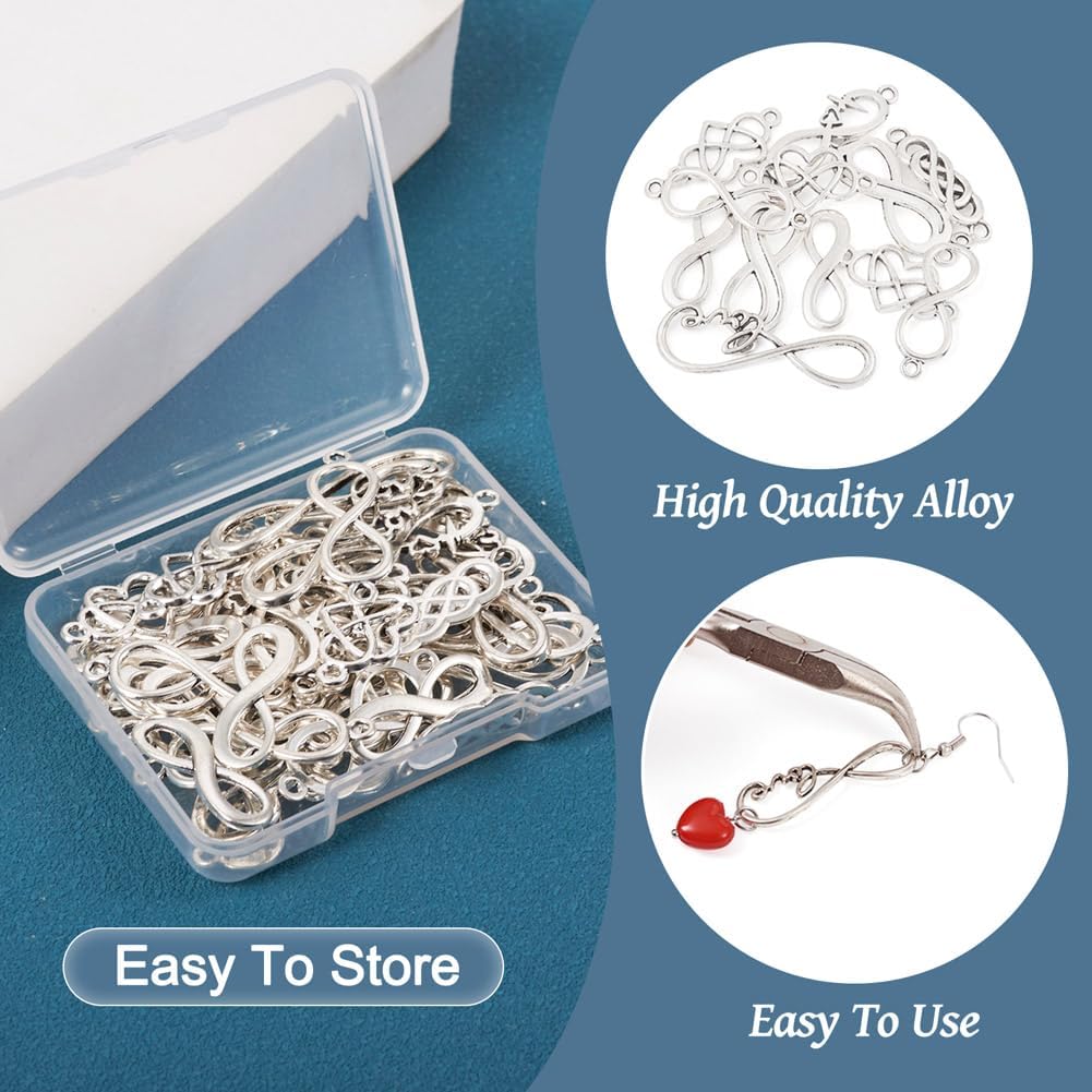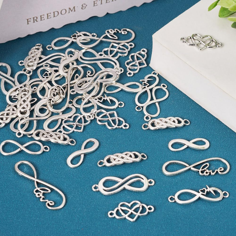 Contenuto della confezione: 42 ciondoli in lega di stile tibetano in 7 stili, dimensioni: 8 ~ 37,5 x 12 ~ 33,5 x 1 ~ 3 mm, foro: 1,8 ~ 11,5 mm. Tutti i collegamenti sono confezionati in una scatola di plastica trasparente. Materiale: il ciondolo è realizzato in lega, non sbiadisce, non deformabile, durevole e robusto, antiruggine e difficile da rompere. Può servirti a lungo. Design semplice ed elegante, ideale per la tua attività di gioielli fai da te. Ampia applicazione: i ciondoli a forma di infinito possono essere utilizzati per realizzare vari gioielli e artigianato, come bracciali, tiranti per cerniere, collane, lavori artigianali, ciondoli a connettore, ornamenti e altri accessori decorativi, rendendo la tua vita quotidiana più colorata. Design unico: forma creativa e graziosa del simbolo dell'infinito, aspetto delicato e bello. Il design semplice aggiungerà qualche abbellimento e renderà i tuoi gioielli speciali tra la folla. Bel regalo: il suo design unico lo rende un regalo ideale. Adatto per creare gioielli fai da te unici come regalo fai da te per Natale, Halloween e compleanni, per i tuoi amici, familiari e altri per esprimere il tuo amore
