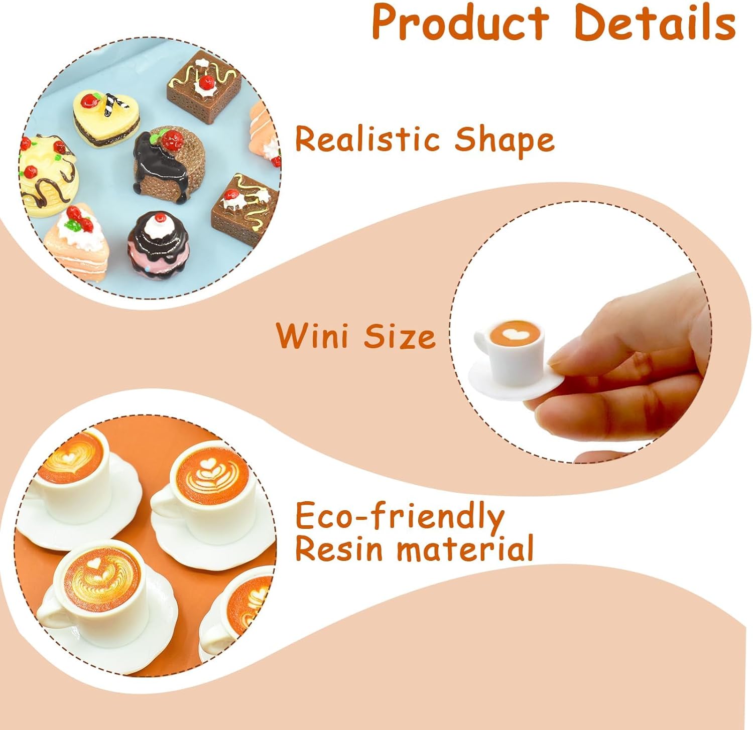 Mini set di alimenti: Questo mini set kit cucina bambini contiene 7 torte fantasiose, 7 mini caffè, 7 mini piattini da caffè, 7 mini cucchiai, 7 mini forchette e 7 mini coltelli per il tuo mini tea party pomeridiano. Aggiunge più divertimento e realismo. Design realistico: Ogni mini cibo ha un alto grado di realismo, colori brillanti, texture pulite, squisiti dettagli di latte e lavorazione realistica fanno sì che ogni stampo sembri reale, aggiungendo raffinatezza e completezza alla sensazione delle bambole e delle case delle bambole. Mini formato: Cibo in miniatura è appositamente progettato per la casa delle bambole in scala 1:12. Abbastanza piccoli da adattarsi a case delle bambole di tutte le dimensioni, questi mini ornamenti per tazze da tè e mini stoviglie possono essere facilmente integrati nella tua piccola cucina o soggiorno per creare un'atmosfera nostalgica. Materiali di alta qualità: Cibo in miniatura è realizzato in resina e materiali plastici di alta qualità, che hanno eccellente stabilità e durata e non si danneggiano facilmente. Possono comunque mantenere il loro aspetto raffinato anche dopo un uso e un posizionamento a lungo termine. Che sia per far giocare I bambini o come preziosa collezione di ornamenti, puoi usarlo con sicurezza. Regalo perfetto: Questa mini decorazione per tazza da caffè fai-da-te per casa delle bambole è un regalo molto speciale. Non è solo un bellissimo ornamento, ma anche un nutrimento di ricordi ed emozioni. Lascia che questo adorabile regalo porti qualcosa nella tua vita.