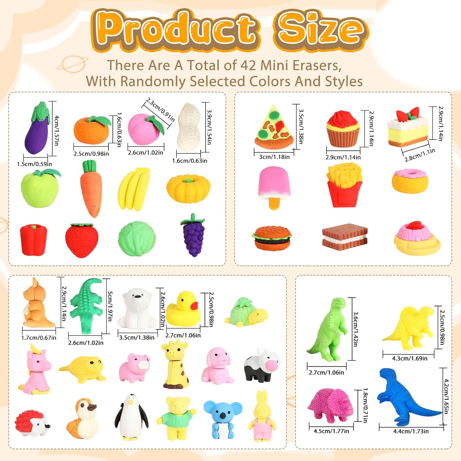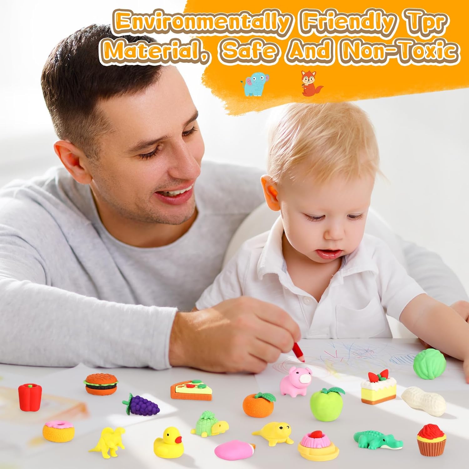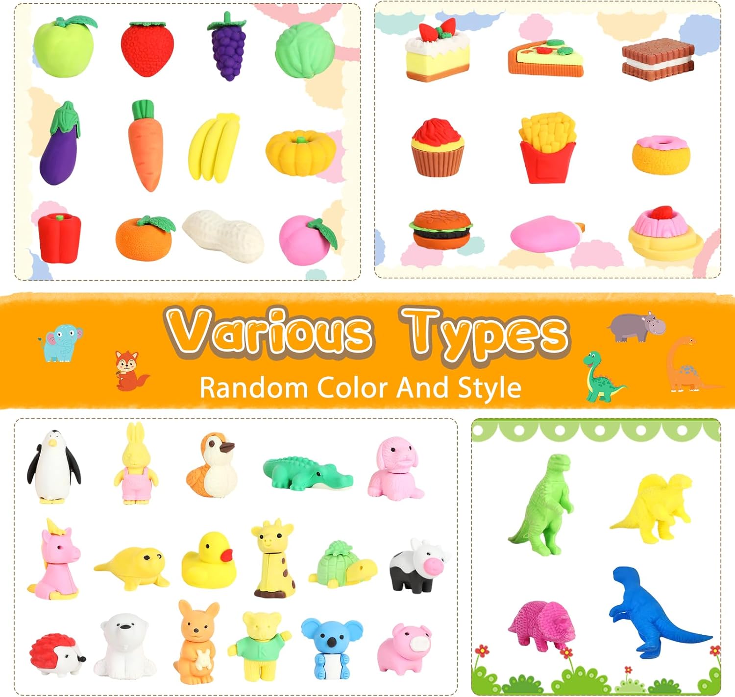 La confezione include: 42 gomme da cancellare con una varietà di motivi di dinosauri, pesche, arachidi, uva, pomodori, arance, torte, pizza, gelati, balene, pinguini e molto altro ancora. Alcune gomme da cancellare possono essere suddivise in parti, in modo che i bambini abbiano la possibilità di assemblarli come un puzzle. (Nota: colore casuale) Materiale TPR ecologico di alta qualità: le gomme sono realizzate in TPR (gomma termoplastica), atossica ed ecologica, sicura per i bambini. Sono durevoli, puliti e possono essere facilmente rimossi dalle linee di matita senza danneggiare la carta. Il materiale non è irritante e assicura che la gomma sia divertente e sicura nell'uso quotidiano per i bambini. Funzioni versatili per divertimento e apprendimento: non solo per cancellare, ma anche come divertente giocattolo. Le gomme da cancellare possono essere smontate e assemblate in singole parti, aiutando i bambini a sviluppare la loro immaginazione e capacità creative. Imparerai giocosamente a conoscere diverse specie di animali e puoi creare i tuoi disegni e combinazioni, che promuovono il pensiero logico e le capacità motorie. Regalo ideale per bambini: queste mini gomme da cancellare sono il regalo ideale per i bambini per compleanni, feste o occasioni speciali. Non sono solo un materiale scolastico pratico, ma anche un giocattolo creativo che i bambini possono utilizzare sia in aula che a casa. Il grazioso design lo rende un regalo piacevole che porta gioia a lungo termine. Ampia gamma di applicazioni: questi set di gomme per cancellare cartoon sono ideali per una vasta gamma di applicazioni, tra cui aule, scuola, casa, schizzi, pittura, progetti artistici e uso in ufficio. Possono essere utilizzati anche come ricompensa per i bambini in classe o come piccoli regali promozionali. Grazie al loro design unico e alla loro praticità sono ideali per molte occasioni diverse, sia per l'uso quotidiano che per feste speciali.