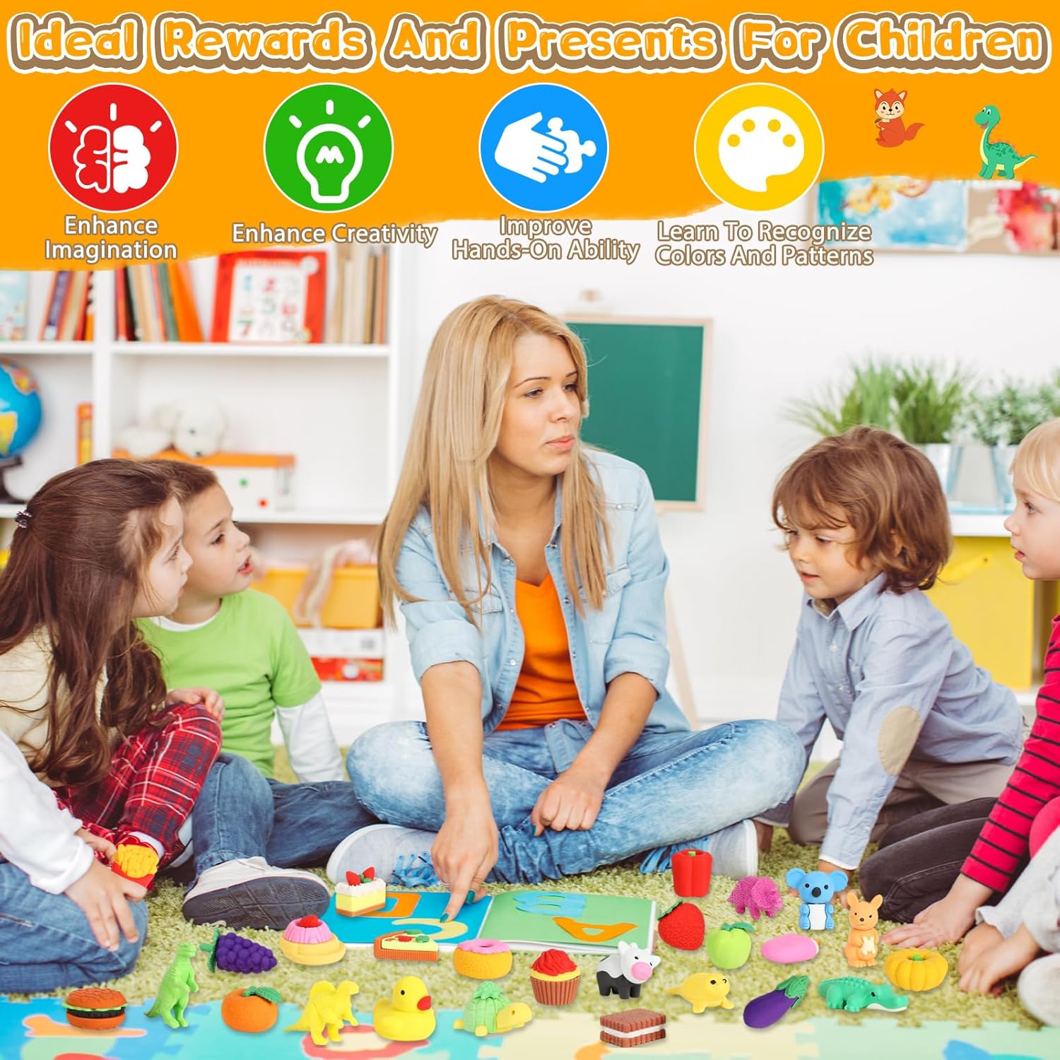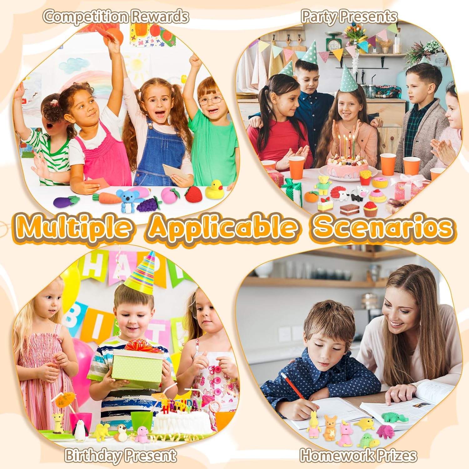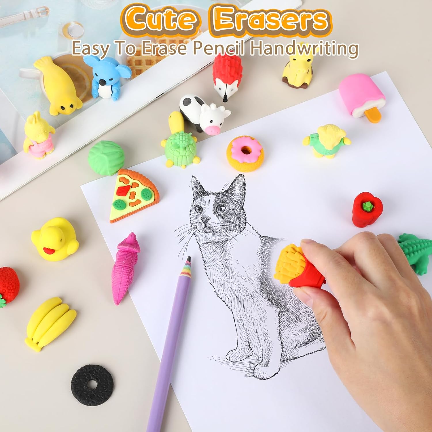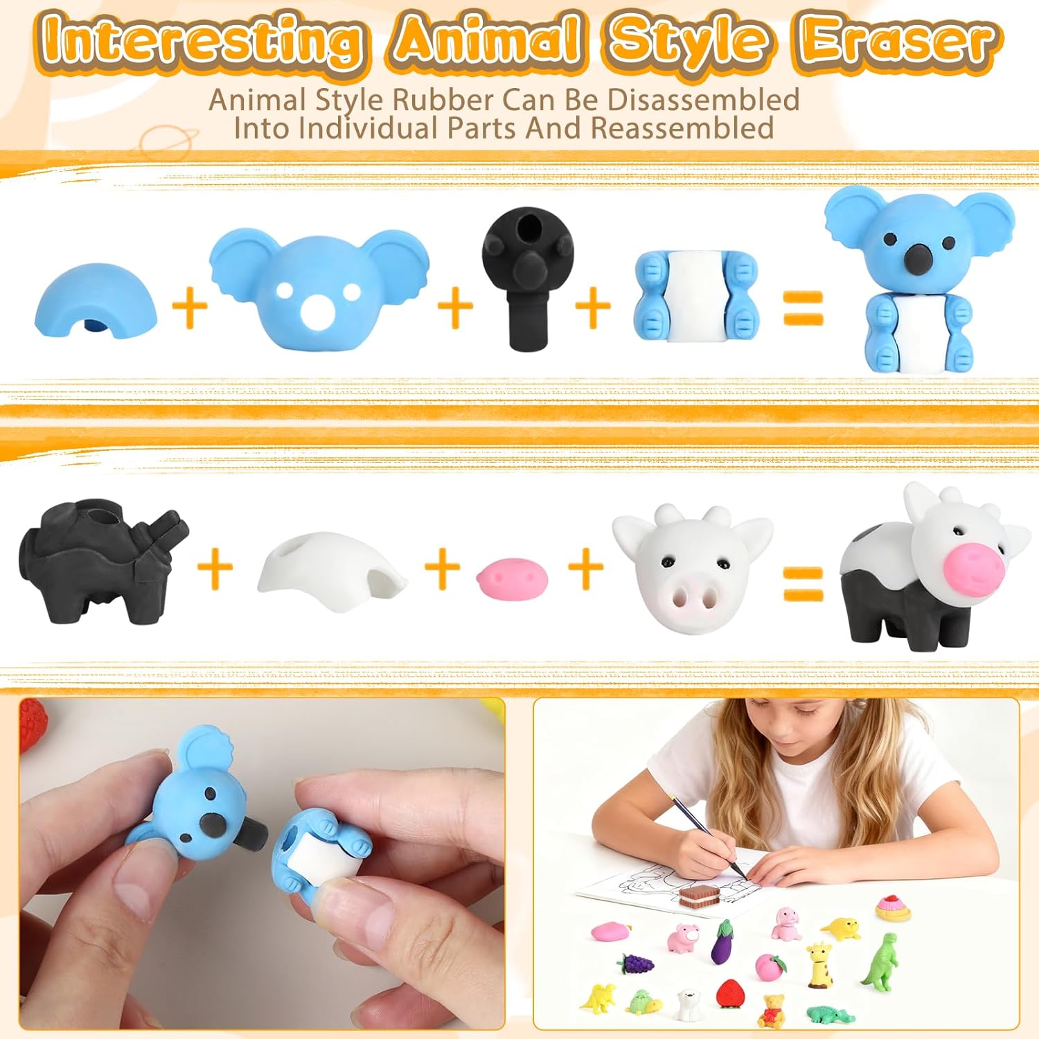 La confezione include: 42 gomme da cancellare con una varietà di motivi di dinosauri, pesche, arachidi, uva, pomodori, arance, torte, pizza, gelati, balene, pinguini e molto altro ancora. Alcune gomme da cancellare possono essere suddivise in parti, in modo che i bambini abbiano la possibilità di assemblarli come un puzzle. (Nota: colore casuale) Materiale TPR ecologico di alta qualità: le gomme sono realizzate in TPR (gomma termoplastica), atossica ed ecologica, sicura per i bambini. Sono durevoli, puliti e possono essere facilmente rimossi dalle linee di matita senza danneggiare la carta. Il materiale non è irritante e assicura che la gomma sia divertente e sicura nell'uso quotidiano per i bambini. Funzioni versatili per divertimento e apprendimento: non solo per cancellare, ma anche come divertente giocattolo. Le gomme da cancellare possono essere smontate e assemblate in singole parti, aiutando i bambini a sviluppare la loro immaginazione e capacità creative. Imparerai giocosamente a conoscere diverse specie di animali e puoi creare i tuoi disegni e combinazioni, che promuovono il pensiero logico e le capacità motorie. Regalo ideale per bambini: queste mini gomme da cancellare sono il regalo ideale per i bambini per compleanni, feste o occasioni speciali. Non sono solo un materiale scolastico pratico, ma anche un giocattolo creativo che i bambini possono utilizzare sia in aula che a casa. Il grazioso design lo rende un regalo piacevole che porta gioia a lungo termine. Ampia gamma di applicazioni: questi set di gomme per cancellare cartoon sono ideali per una vasta gamma di applicazioni, tra cui aule, scuola, casa, schizzi, pittura, progetti artistici e uso in ufficio. Possono essere utilizzati anche come ricompensa per i bambini in classe o come piccoli regali promozionali. Grazie al loro design unico e alla loro praticità sono ideali per molte occasioni diverse, sia per l'uso quotidiano che per feste speciali.