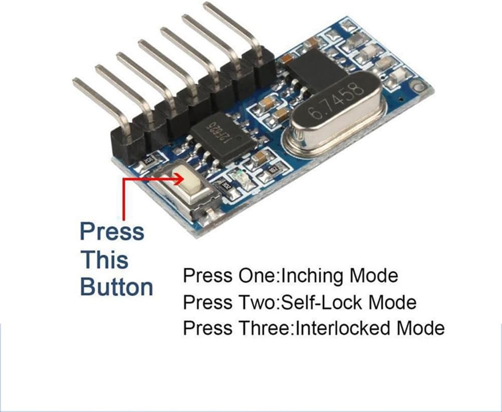 Il telecomando adotta il metodo di codifica EV1527 di apprendimento. Ogni telecomando ha un codice di indirizzo per prevenire la codifica e le interferenze reciproche. Il modulo di ricezione ha 3 opzioni di funzione: jog, autobloccante e ad incastro. Il modulo ricevente contiene un chip di decodifica che supporta EV1527, PT2262 e altri chip di codifica. Il modulo ricevente adotta la modalità di selezione chiave. Non è necessario selezionare manualmente la modalità tramite saldatura, cavi jumper ecc., risparmiando tempo e costi di manodopera. Uscita modulo: 4 canali di segnale di livello CMOS, che possono corrispondere ai 4 pulsanti del telecomando "ABCD"