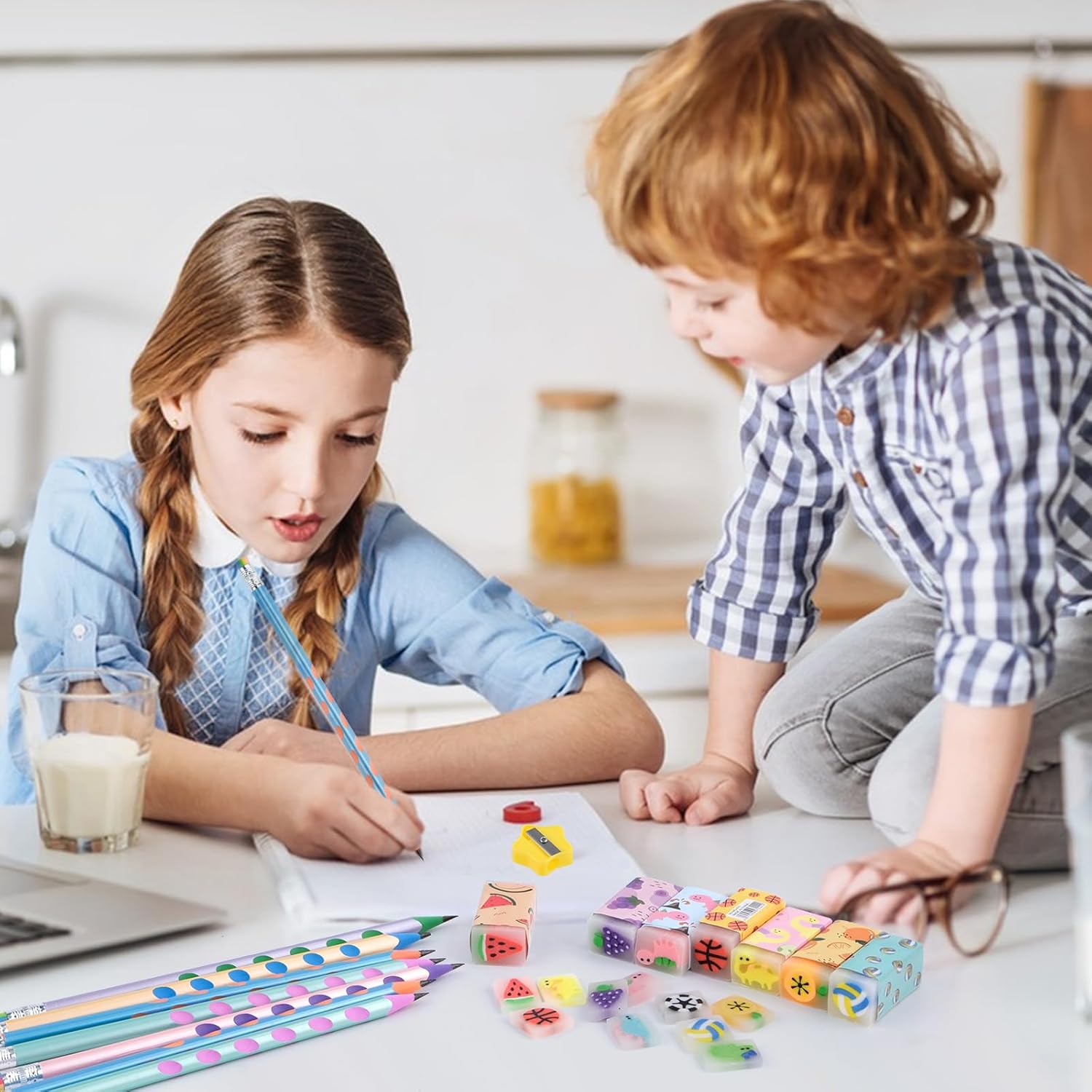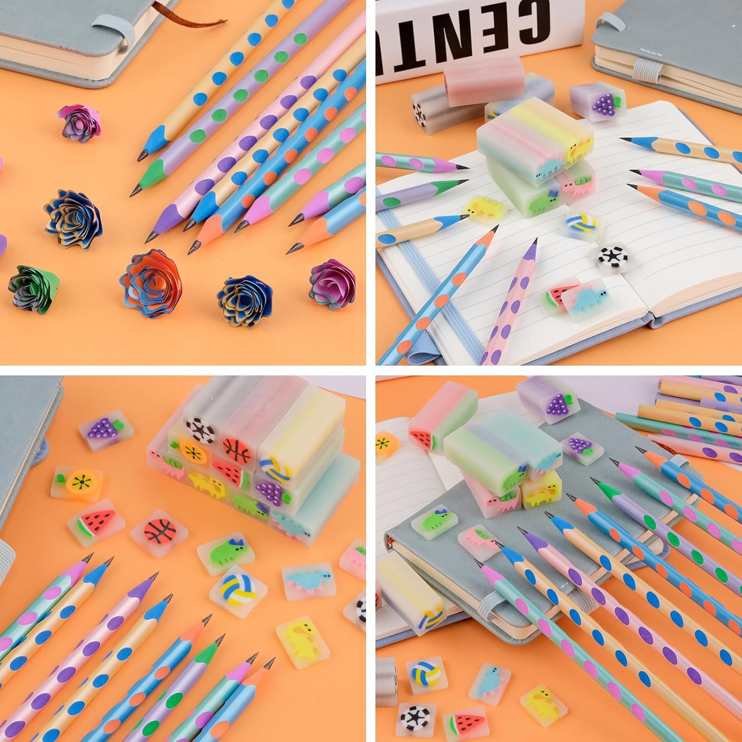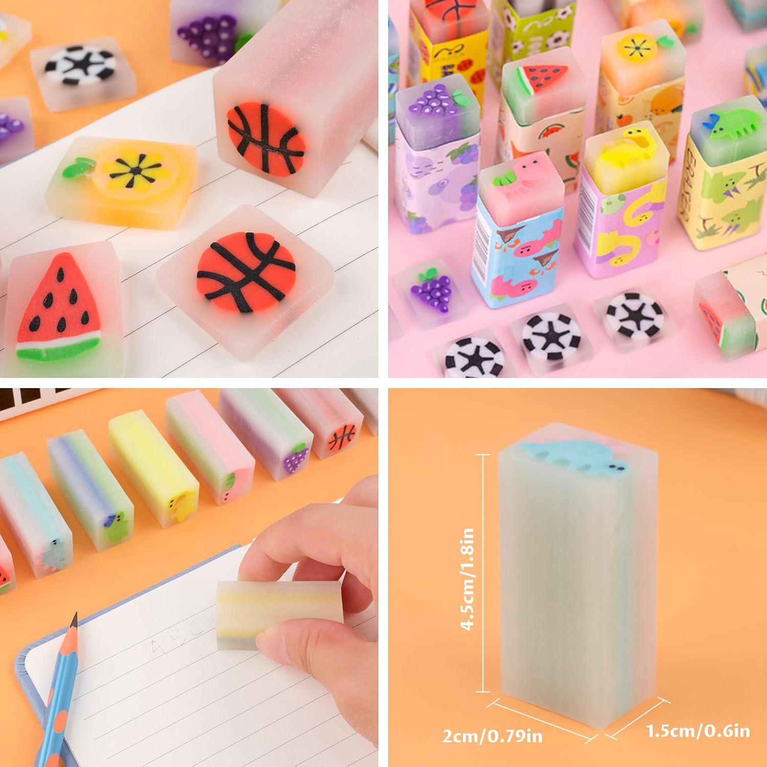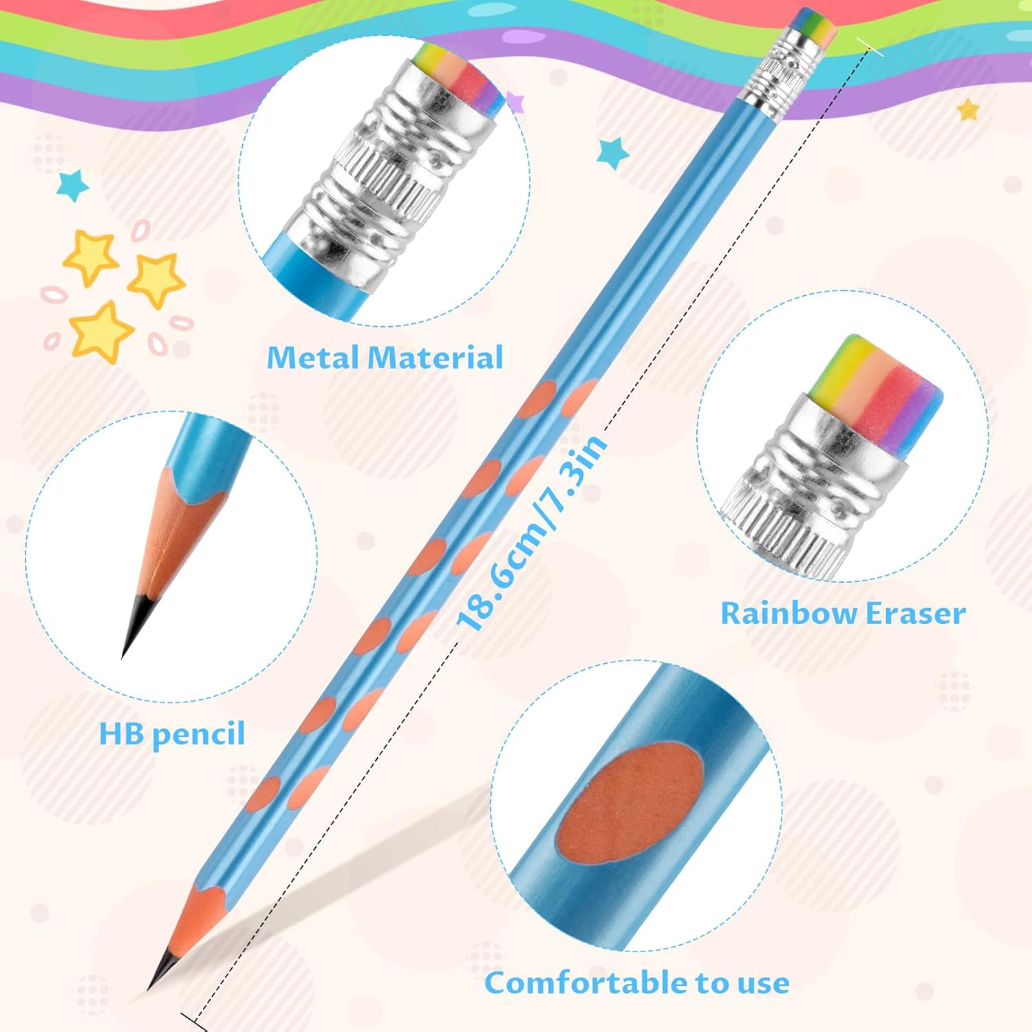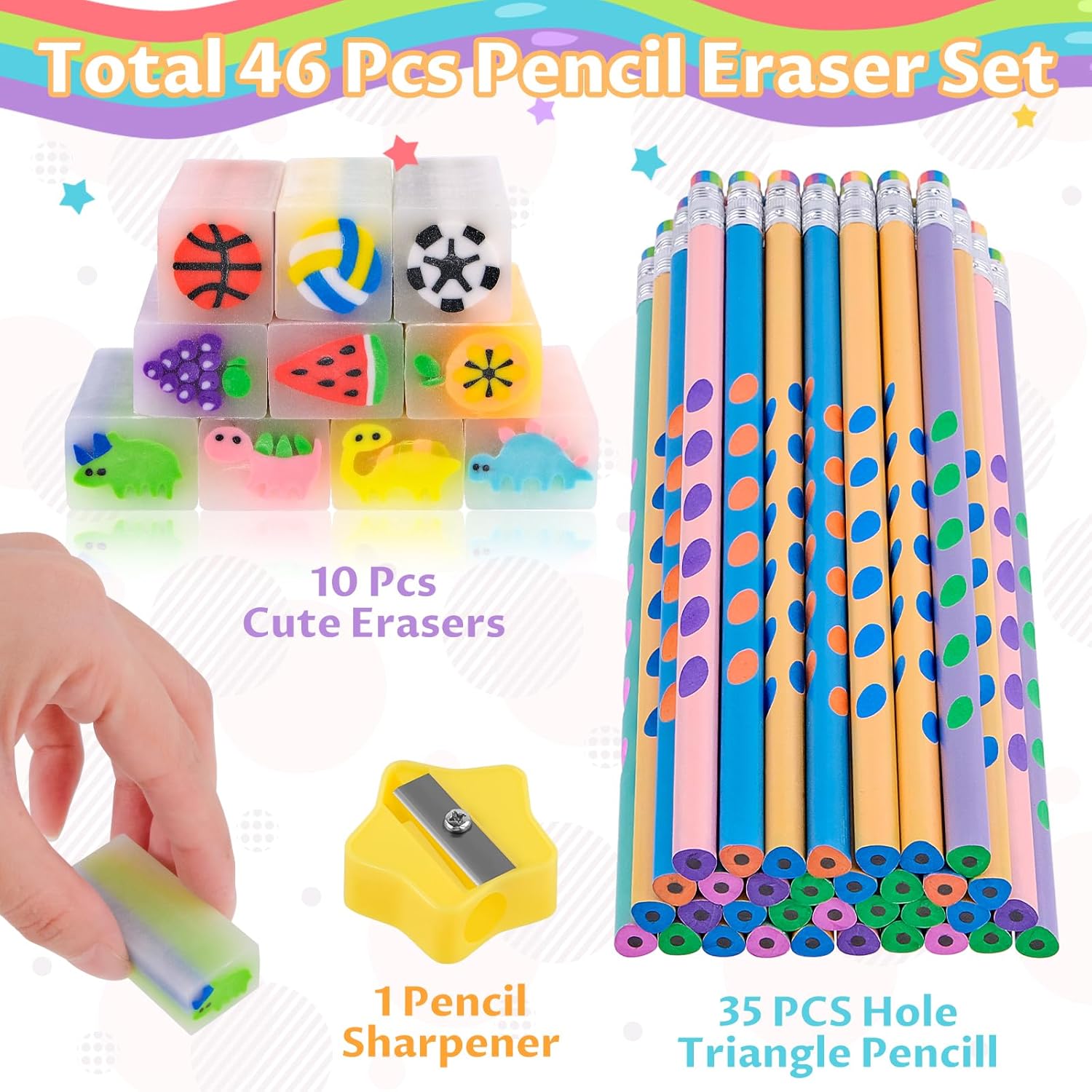 🌈【Set di Matite con Gomma per Bambini】Il prodotto include 35 matite + 10 divertenti gomme da cancellare. Il temperamatite abbinato può affilare le matite in modo rapido e sicuro. Sono dai colori vivaci e hanno espressioni carine, soddisfacendo il desiderio dei bambini di articoli di cancelleria carini. ✍ 【Matita Gadget Compleanno Bambini 】Matite Triangolari per Bambini è realizzata in gomma di alta qualità, PVC ecologico e grafite, con design antiscivolo traforato per una presa comoda. Il nuovo design triangolare stabilizza la matita e non rotolerà facilmente dal tavolo, permettendoti di usarla in tutta tranquillità. 🌈【Gomme per Bambini】10 stili di gomme stile cartone animato: frutta, palline, dinosauri, ecc. Le dimensioni individuali sono circa: 4,5 x 2 x 1,5 cm, facili da tenere in mano e molto buone da pulire. Ogni sezione trasversale della gomma ha un modello di cartone animato completo, pieno di divertimento infantile. ✍【Premi Divertenti per Gli Studenti】Possono essere usati come regali di classe, premi scolastici, materiale scolastico, premi per studenti, simpatiche nuove gomme o come piccoli premi per incoraggiare gli studenti. La quantità è sufficiente, puoi anche regalarli alla tua famiglia, ai tuoi compagni di classe e ai tuoi amici. 🎁【Bomboniere per Feste di Compleanno】Il set di matite a tema cartoni animati è versatile e perfetto da inserire in borse da festa, feste per ragazzi e ragazze, feste di compleanno per bambini, regali, Natale, feste in giardino. Un regalo pratico e interessante, amato dai bambini.