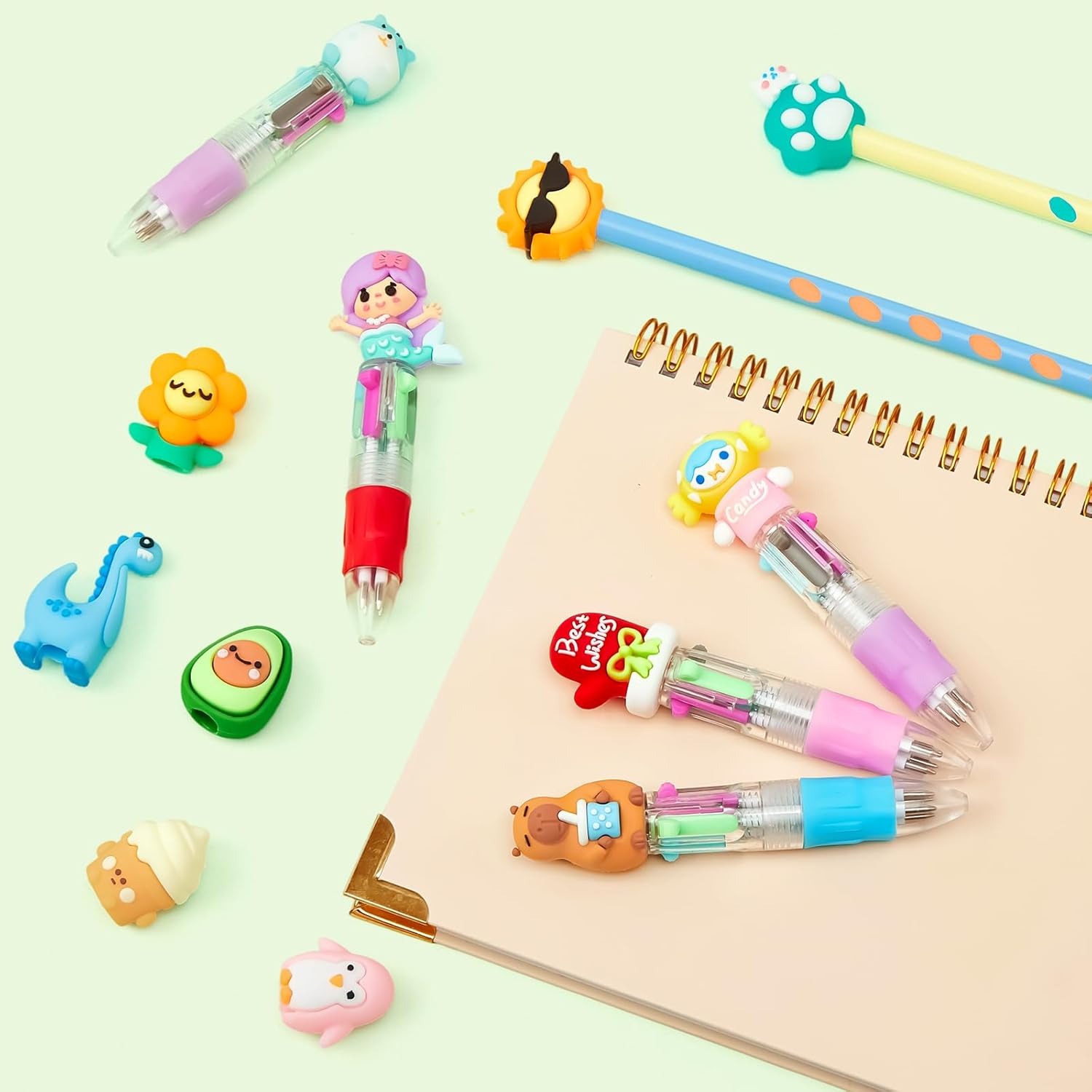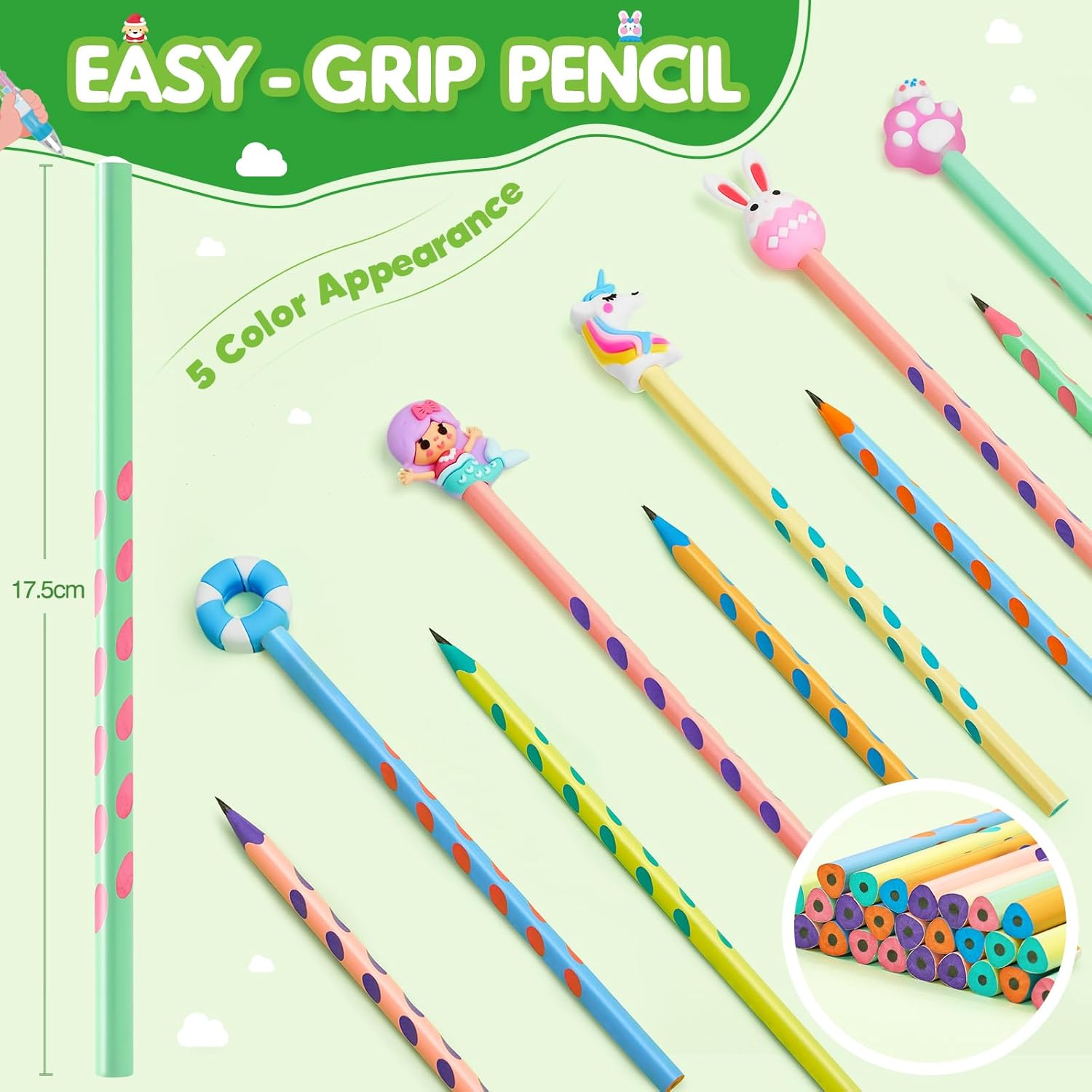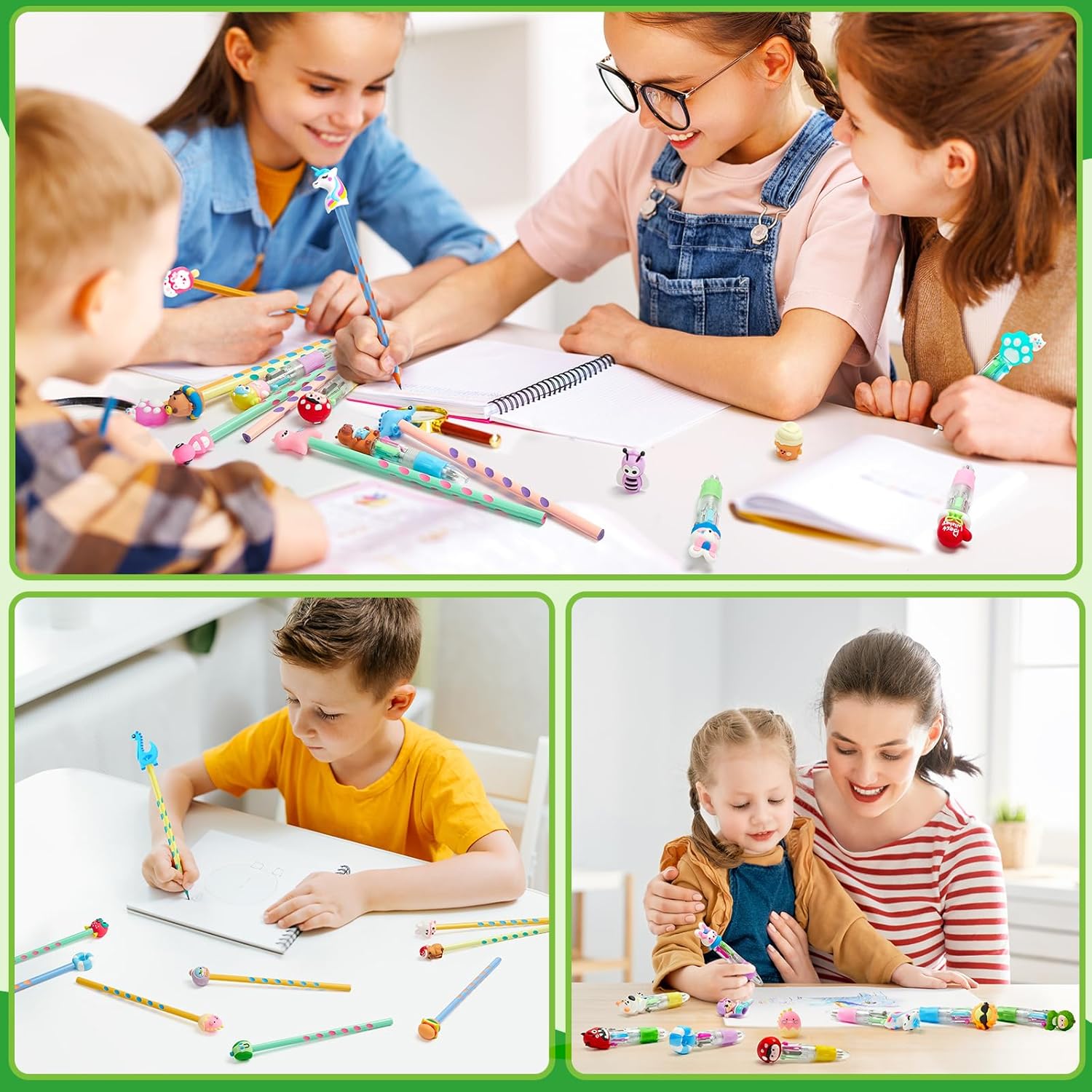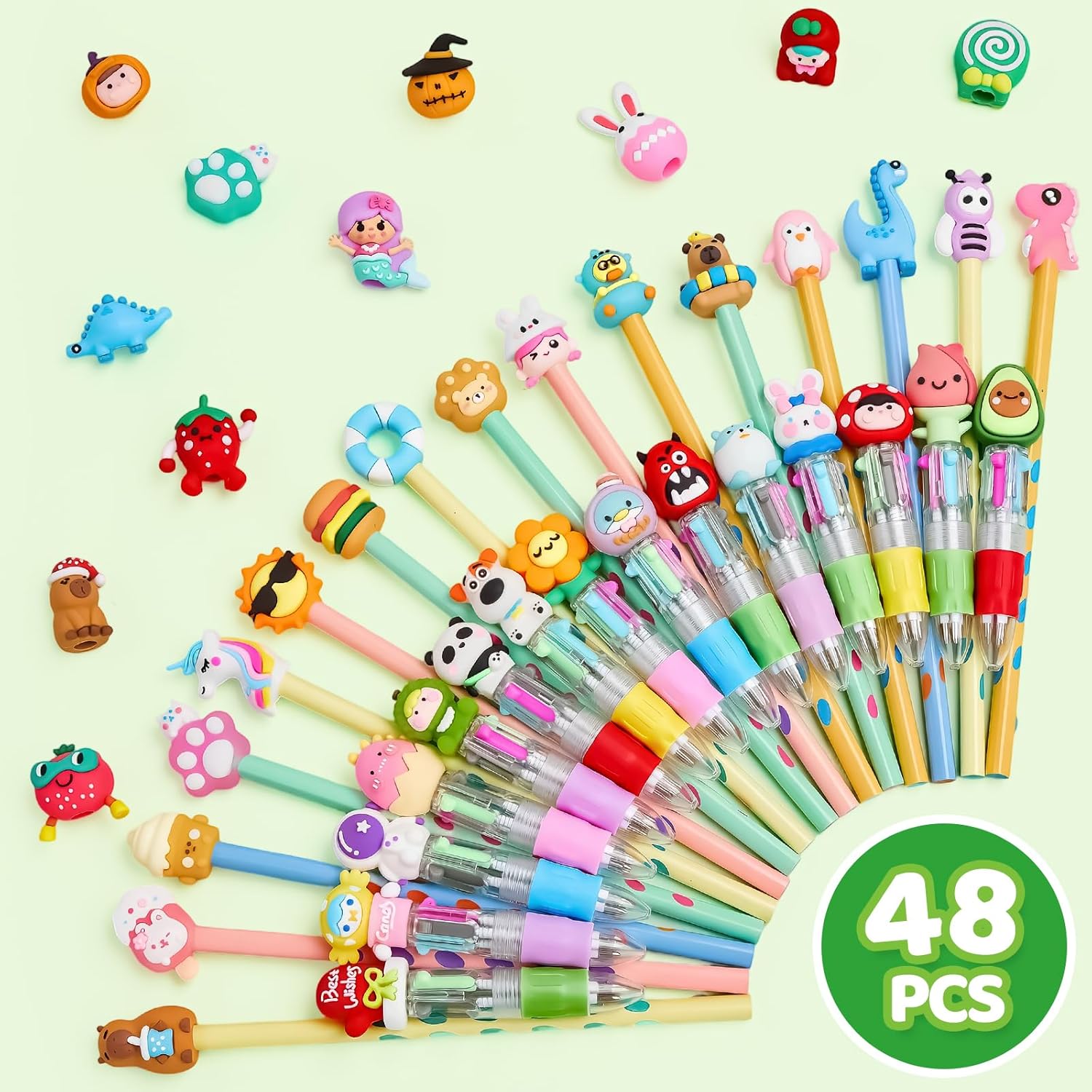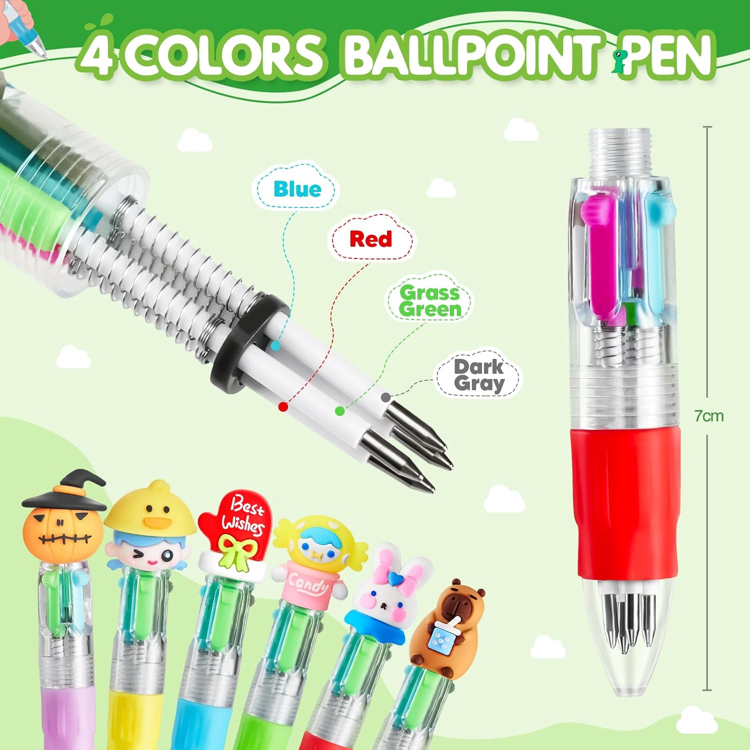 48 Pezzi di Penne e Matite: 24 pezzi di penne a sfera a 4 colori + 24 pezzi di matite con 48 pezzi di tappi per animali, tutti gli accessori sono contenuti in una scatola in PVC per una facile conservazione Penna Bulletpoint a 4 Colori: Viene fornita con 4 colori di inchiostro in un'unica penna, blu, rosso, verde e grigio, ognuno dei quali offre un'esperienza di scrittura fluida e uniforme, perfetta per passare da un compito all'altro senza dover usare più penne Matita dal Design Ergonomico: Caratterizzata da un design a fusto triangolare con punti di presa incassati per una facile impugnatura, la penna fornisce una presa salda per i bambini che imparano la corretta scrittura della matita Gadget Compleanno Bambini: inclusi dinosauri, conigli, unicorni, sirene e vari frutti, questi adorabili tappi di penna possono essere liberamente combinati con penne e matite, che non è solo pratico ma anche personalizzato, perfetto come regalo per i bambini Regalini Fine Festa Compleanno: Le matite e le penne a sfera sono realizzate con grafite e inchiostro di alta qualità, che non solo forniscono un'eccellente esperienza di scrittura, ma sono anche prive di piombo e non tossiche, rendendole più adatte all'uso nella scrittura quotidiana dei bambini