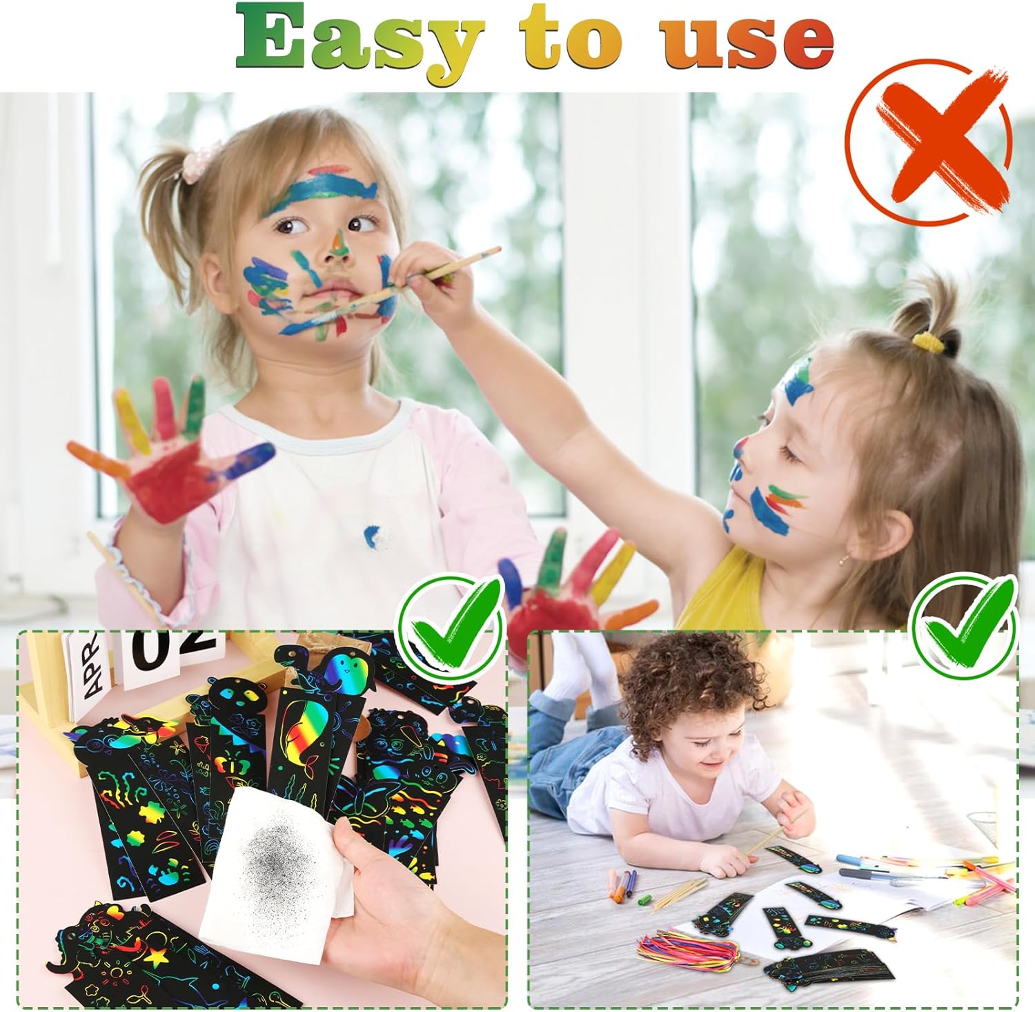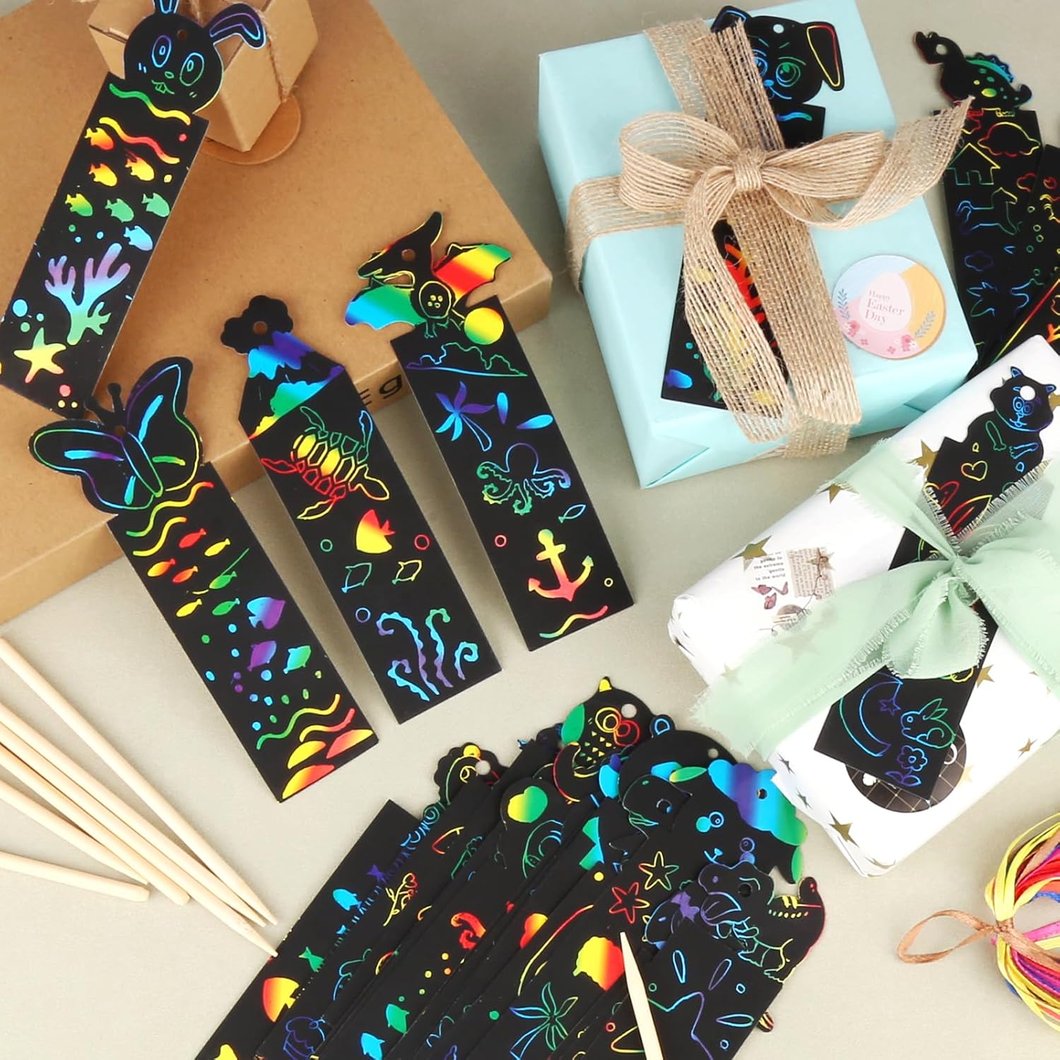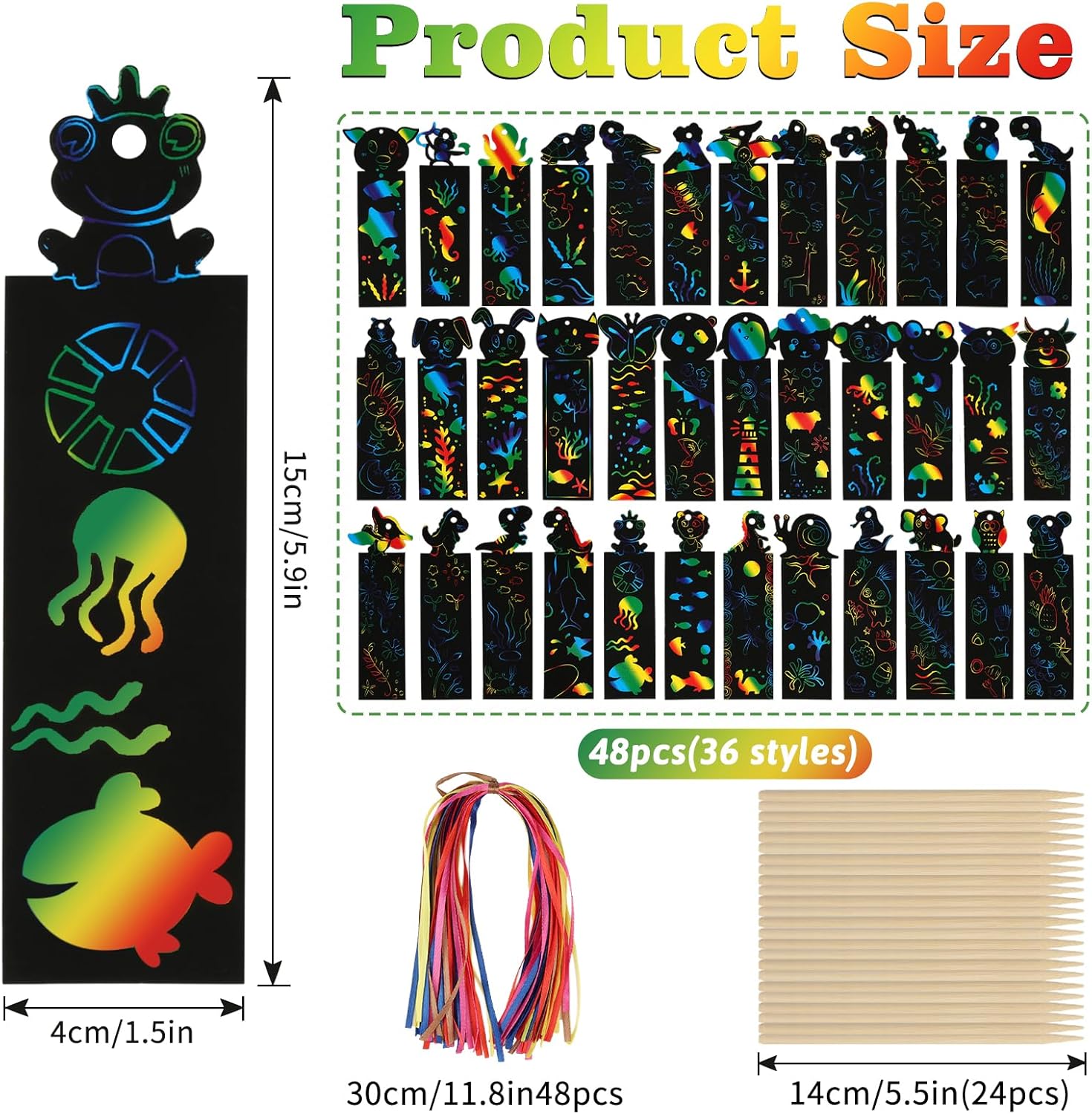 Set di carta tiragraffi: riceverete 48 fogli con segnalibri arcobaleno creativi, 36 motivi di animali con motivi vivaci e interessanti, 48 corde colorate e 24 bastoncini di bambù. Puoi facilmente grattare colori vivaci e bellissimi motivi. La quantità è sufficiente per soddisfare le esigenze quotidiane dei bambini. Materiale sicuro: la carta antigraffio per bambini è realizzata in cartone ecologico, che è sano, inodore, insapore, durevole e non facile da strappare, in modo da poter essere sicuri di poterlo utilizzare.La superficie è rivestita di nero e la parte inferiore è in un bellissimo colore arcobaleno. Il bastone di bambù è realizzato in bambù naturale, sicuro, liscio, senza sbavature, non fa male alla mano, leggero, comodo da usare. Facile da usare: tutto quello che dovete fare è graffiare la superficie del colore nero opaco con un bastone di bambù e vedrete i colori vivaci dell'arcobaleno sottostante. I bambini possono anche disegnare o scrivere sull'immagine del graffio. E c'è un piccolo foro su ogni graffio, in modo da poter utilizzare un nastro per appendere il graffio come decorazione. Puzzle fai da te: i segnalibri personalizzati possono coltivare l'interesse dei bambini nella pittura, promuovere la loro pazienza, migliorare la loro attenzione e immaginazione, in modo che ogni bambino possa graffiare un'immagine meravigliosa e creare le proprie opere d'arte. I bambini possono divertirsi a graffiare e dipingere mentre lavorano e colorano. Versatile: i bambini possono progettare tutti i propri segnalibri per creare ricordi duraturi. Le immagini per bambini possono essere utilizzate per creare biglietti da regalo per feste, scarabocchi, blocchi per appunti, progetti fai da te, lezioni artistiche, progetti scolastici e attività in classe, regali perfetti per ragazzi e ragazze a Natale, Pasqua, Halloween.