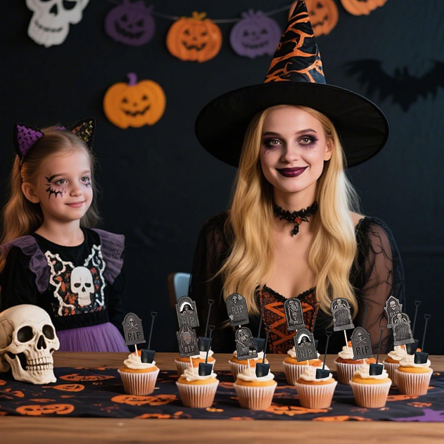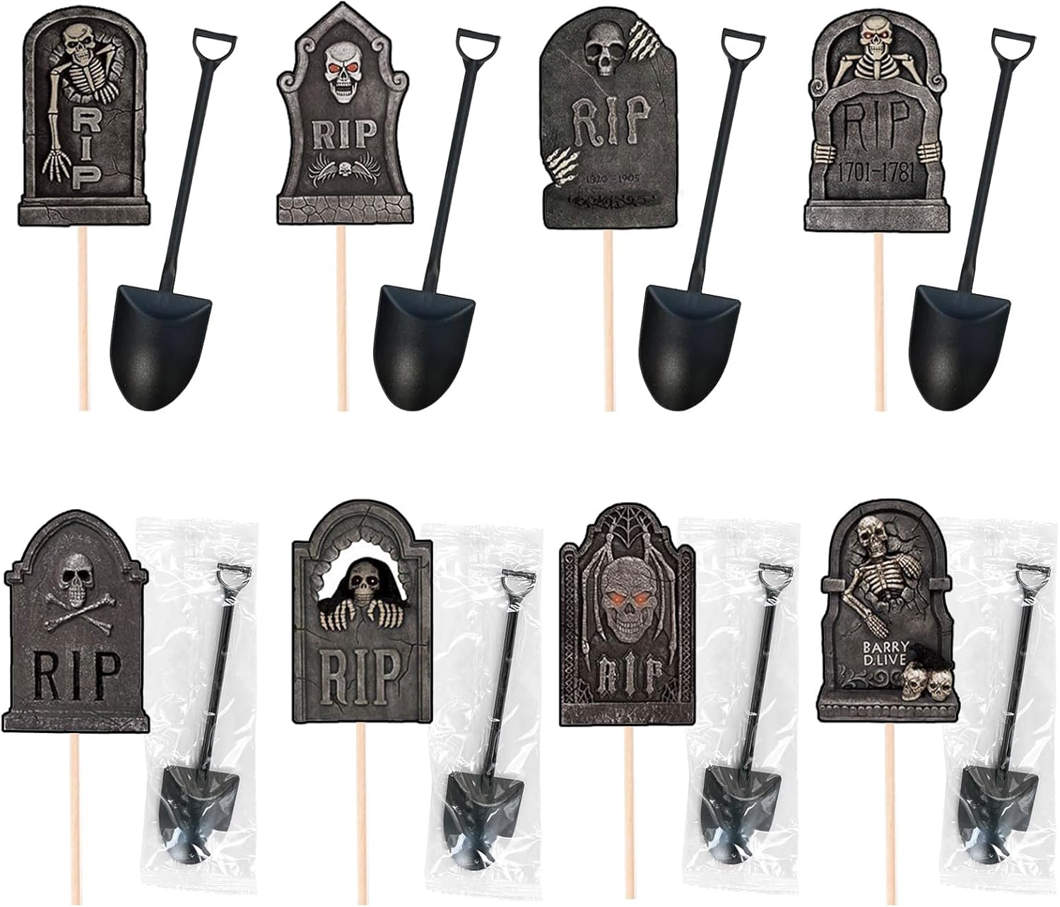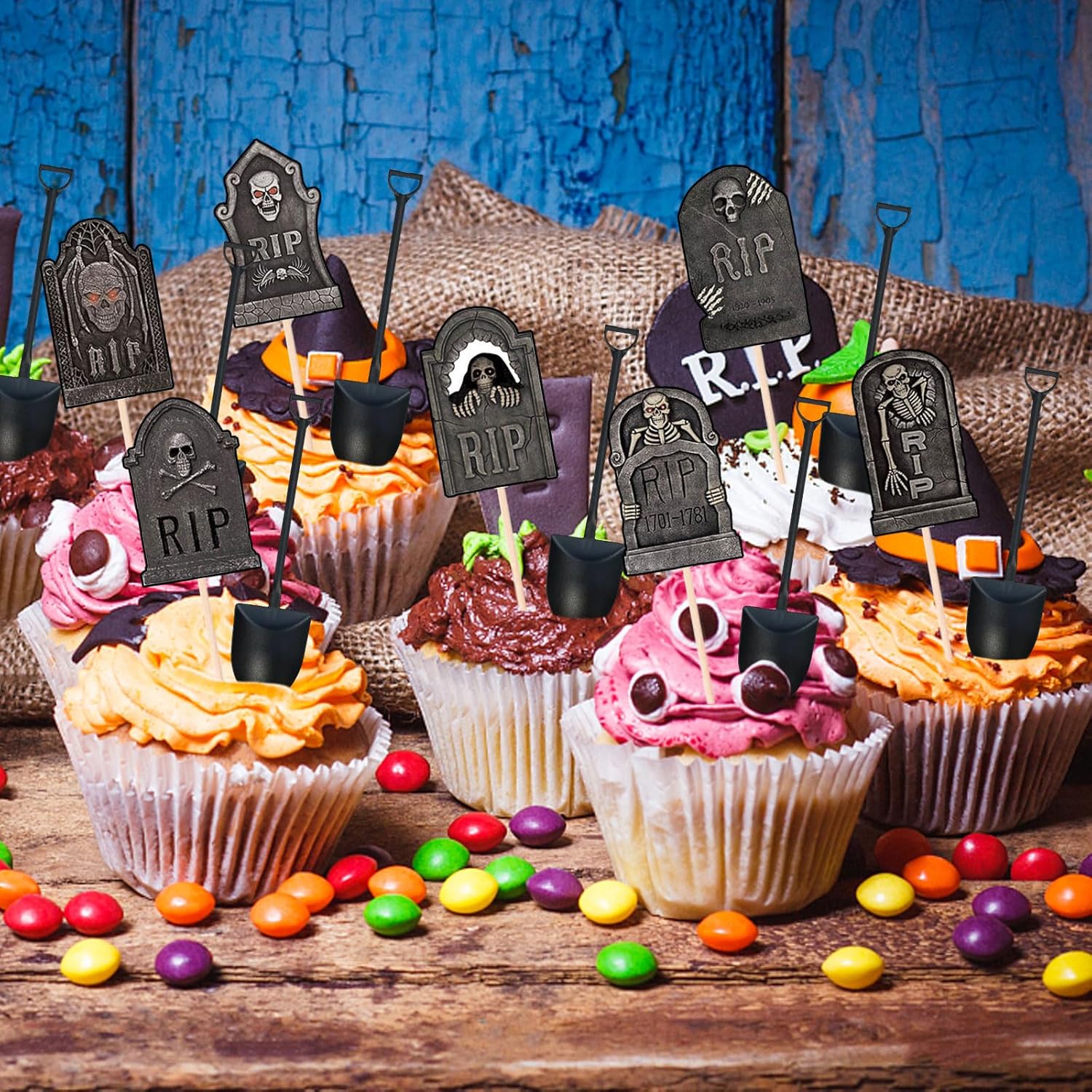 【Contenuto del set】24 decorazioni "tomba spettrale" (dettagli scheletri/teschi) + 24 mini pale; un totale di 48 pezzi per un vero tema horror. 【Design horror dettagliato】Incisioni, crepe e teschi accentuano l'atmosfera macabra; perfetti per creare cupcake "tomba" o una mini navata funebre su un vassoio. 【Uso multi-dessert】Funziona su cupcake, fette di torta, brownie, cheesecake in bicchieri, mousse e piattini per dolci; aggiungi briciole di biscotti per un effetto "terra". 【Versatile e Fotograficamente Adatto】Ideale per buffet, tavoli da dessert, cabine fotografiche e social media: il contrasto scuro è ben visibile in foto/video, anche in condizioni di scarsa illuminazione. 【Per tutte le tue feste】Perfetto per feste di Halloween a casa, eventi scolastici, uffici o feste con gli amici.