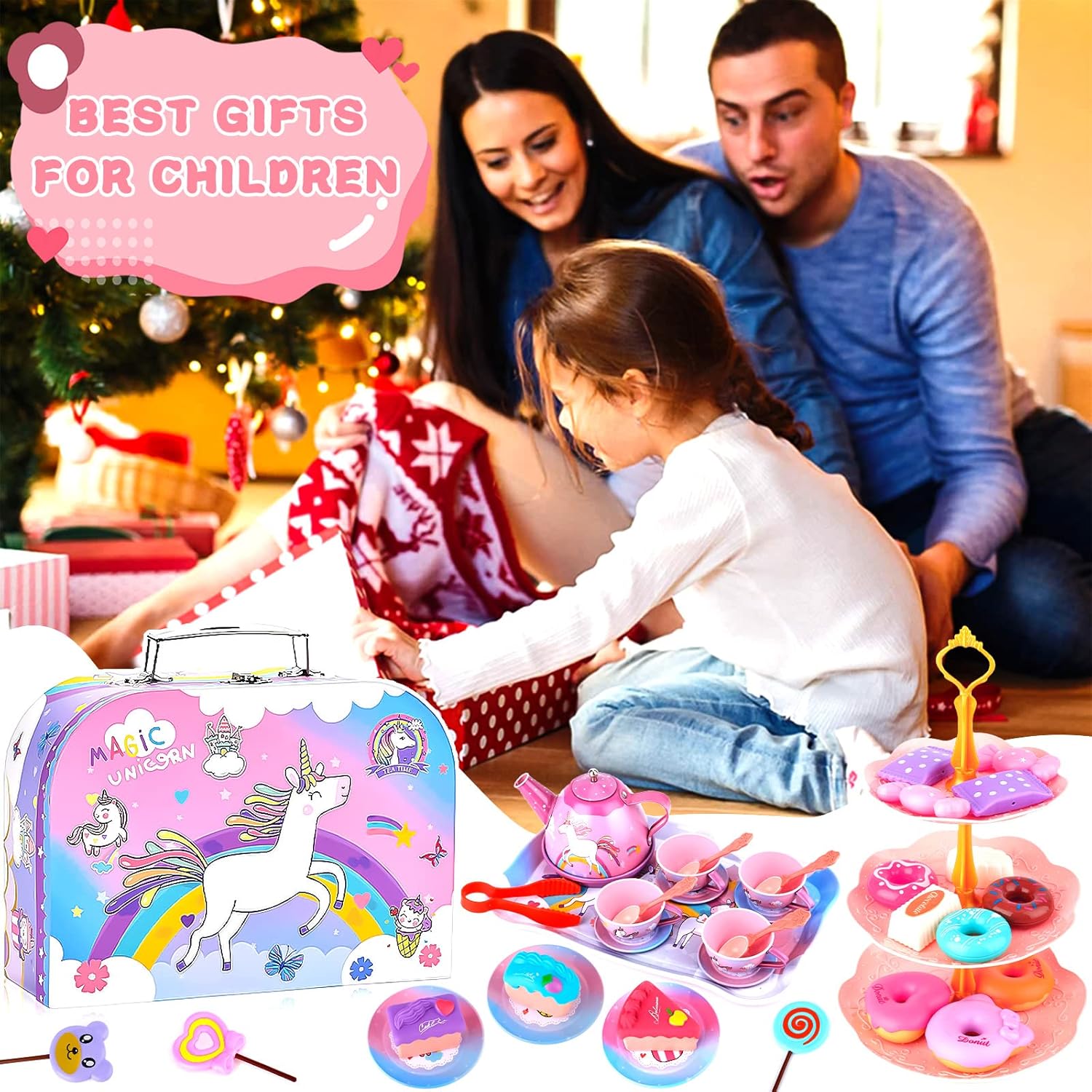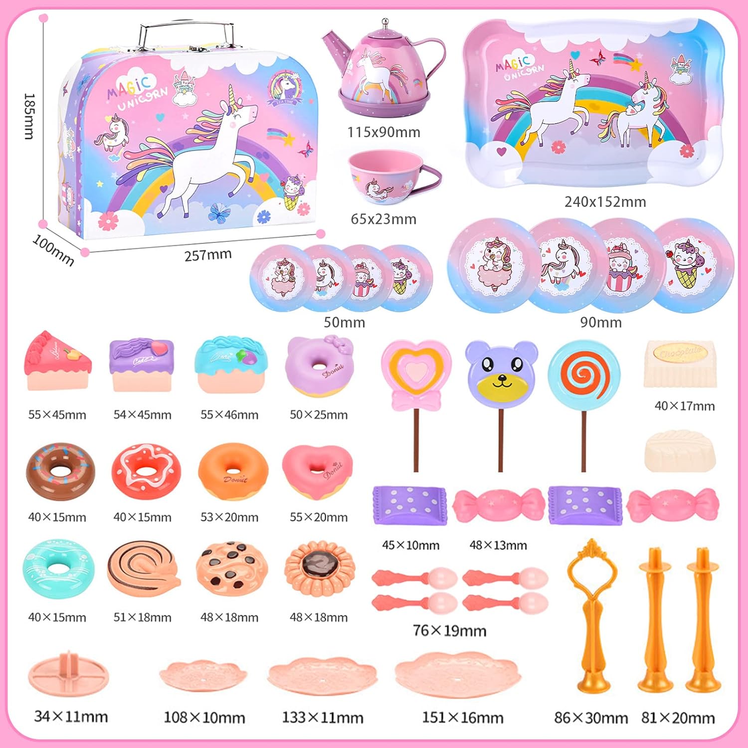 🍰48 PCS Set da Tè : Riceverai un Set da Tè per Bambini, che include 1 teiera di latta, 4 tazze da tè di latta, 4 sottobicchieri di latta, 4 piatti di latta, 4 cucchiai, 1 vassoio da dessert a 3 livelli, 1 latta vassoio, 1 * pinze, 2 * cioccolatini, 3 * lecca-lecca, 4 * caramelle, 6 * ciambelle, 3 * torte, 3 * biscotti, 1 * custodia in cartone. 🍭Materiale Sicuro: Nostro set da tè unicorno è realizzato in materiale di banda stagnata sicuro e gli altri sono realizzati in materiale plastico atossico e innocuo, che può essere facilmente pulito con un panno o acqua pulita. Tutte le parti sono durevoli e possono essere riciclate e giocate. 🍫Giocattoli Portatili per Tea Party: Set da Tè Giocattoli per Bambini viene fornito con una graziosa valigia di cartone con unicorno rosa, leggera e facile da riporre, che consente ai tuoi bambini di portarla con sé e giocare allegramente con i loro amici. 🍩Cucina Bambini Giochi d'imitazione: Questo simpatico set da tè gioco per bambini è appositamente progettato per i giochi di simulazione, che possono stimolare l'immaginazione dei più piccoli e migliorare la loro creatività, abilità sociali, nonché coordinazione pratica, indipendenza e fiducia in se stessi. 🎁Grande Regalo per le Ragazze: Ogni bambina ama fare cosplay e questo set da tea party è appositamente progettato per le bambine. Ottimo per regali di compleanno, cosplay, feste di unicorno e altre occasioni a tema unicorno.