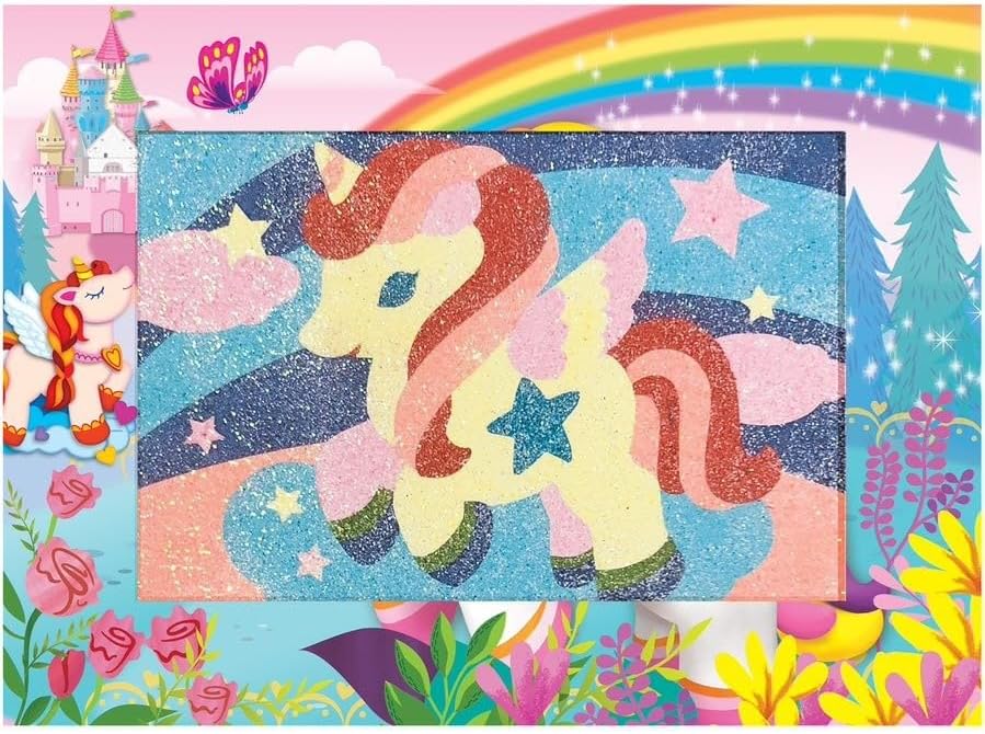 È facile e divertente creare le tue immagini artistiche glitterate Basta sbucciare e cospargere per fare una bella foto Contiene tutto per realizzare due immagini con glitter e cornici 2 tavole adesive pre-tagliate, 8 confezioni di sabbia glitterata dai colori brillanti e 2 cornici per il montaggio della tua arte sulla sabbia Un regalo ideale per i bambini che amano l'arte e l'artigianato