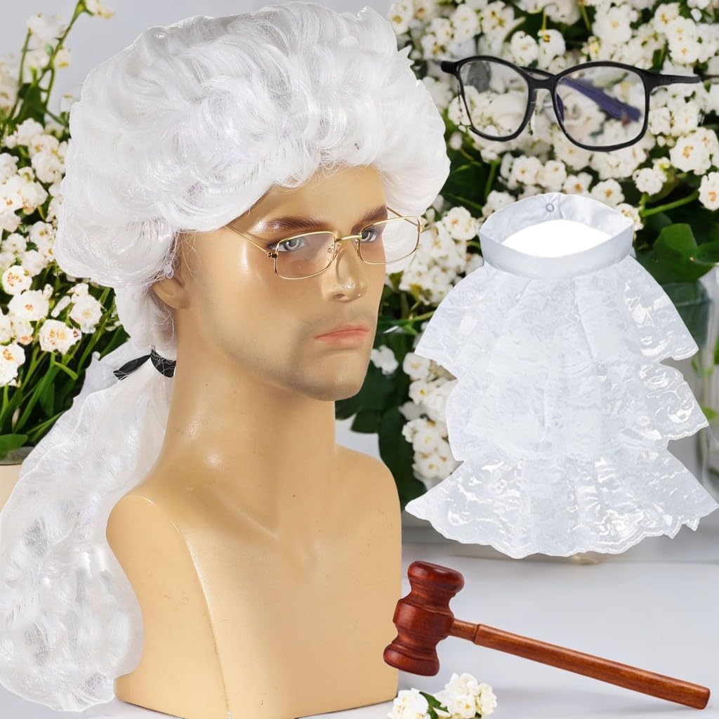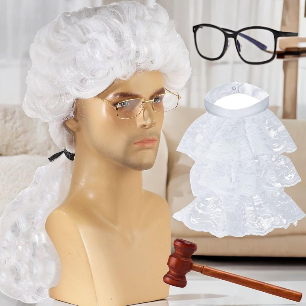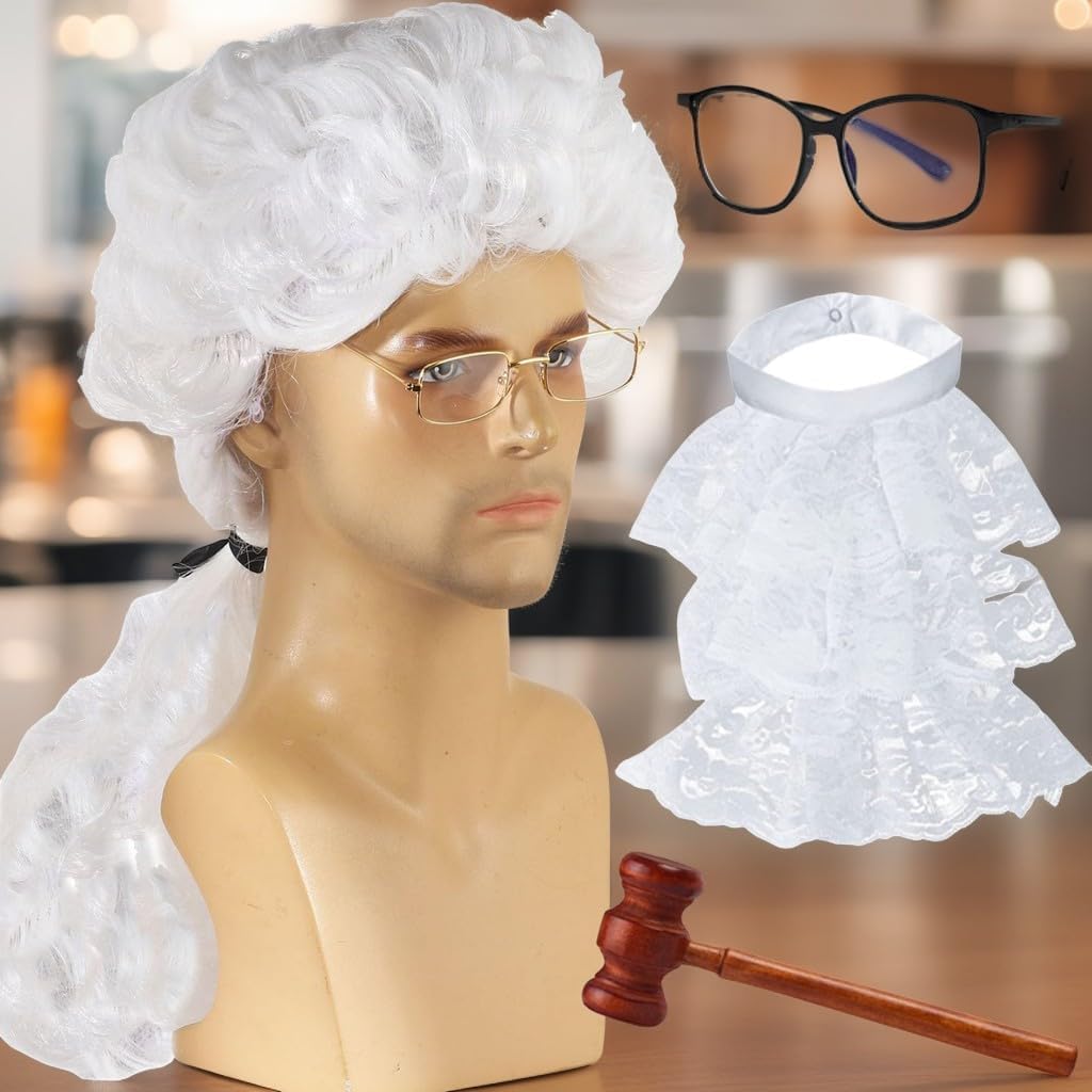 🧑⚖️ 【Packaging】: La confezione contiene 4 pezzi di accessori del giudice, tra cui una parrucca bianca del giudice, un mini martello di legno, un paio di occhiali incorniciati d'oro e un collare falso, che è un grande accessorio decorativo per le feste di Halloween. La parrucca e gli occhiali sono delle stesse dimensioni e possono essere indossati dalla maggior parte delle persone. 🧑⚖️ 【Materiale】: La parrucca è realizzata in filo K di alta qualità, con capelli morbidi e colori vivaci. C'è una rete per capelli all'interno, che può essere regolata alle dimensioni della testa, che è confortevole e traspirante. Il martello è fatto di legno di alta qualità, si sente bene e durevole. Gli occhiali sono fatti di plastica, non facili da danneggiare. 🧑⚖️ 【Comodo da trasportare】: mini mazzetto di legno e occhiali incorniciati d'oro sono leggeri e facili da trasportare. Il martello di legno è staccabile, molto comodo da trasportare e utilizzare e non occuperà troppo spazio. parrucca uomo 🧑⚖️ 【Dressing】: Questa parrucca bianca permette di sperimentare il ruolo di un giudice più profondamente. Questi quattro accessori per costumi da giudice possono essere utilizzati insieme o separatamente. Quando li si abbina con vestiti diversi, è possibile mostrare diversi effetti dress up per rendere il vostro vestito più perfetto, e anche lasciare che si prova diverso ruolo dress up. parrucca 🧑⚖️ 【Multiuso】: Questi accessori per costumi sono perfetti per spettacoli teatrali, feste a tema, spettacoli d'arte, feste in costume e altre occasioni. Possono anche essere utilizzati per feste come Halloween, Natale e compleanni. Abbina questi accessori con un costume in stile giudice per aggiungere brillantezza al tuo outfit. Perfetto per vestirsi da giudice. Parrucche