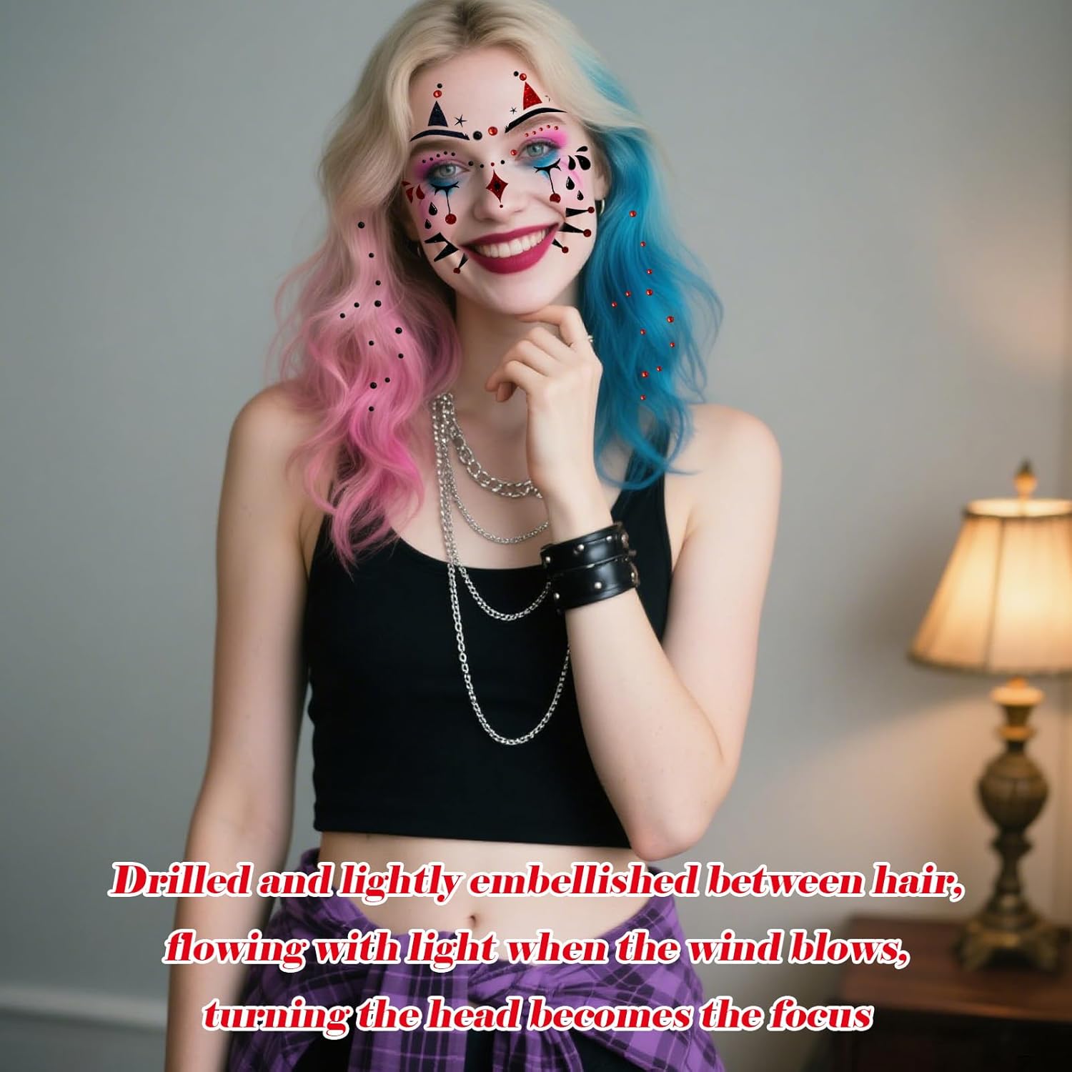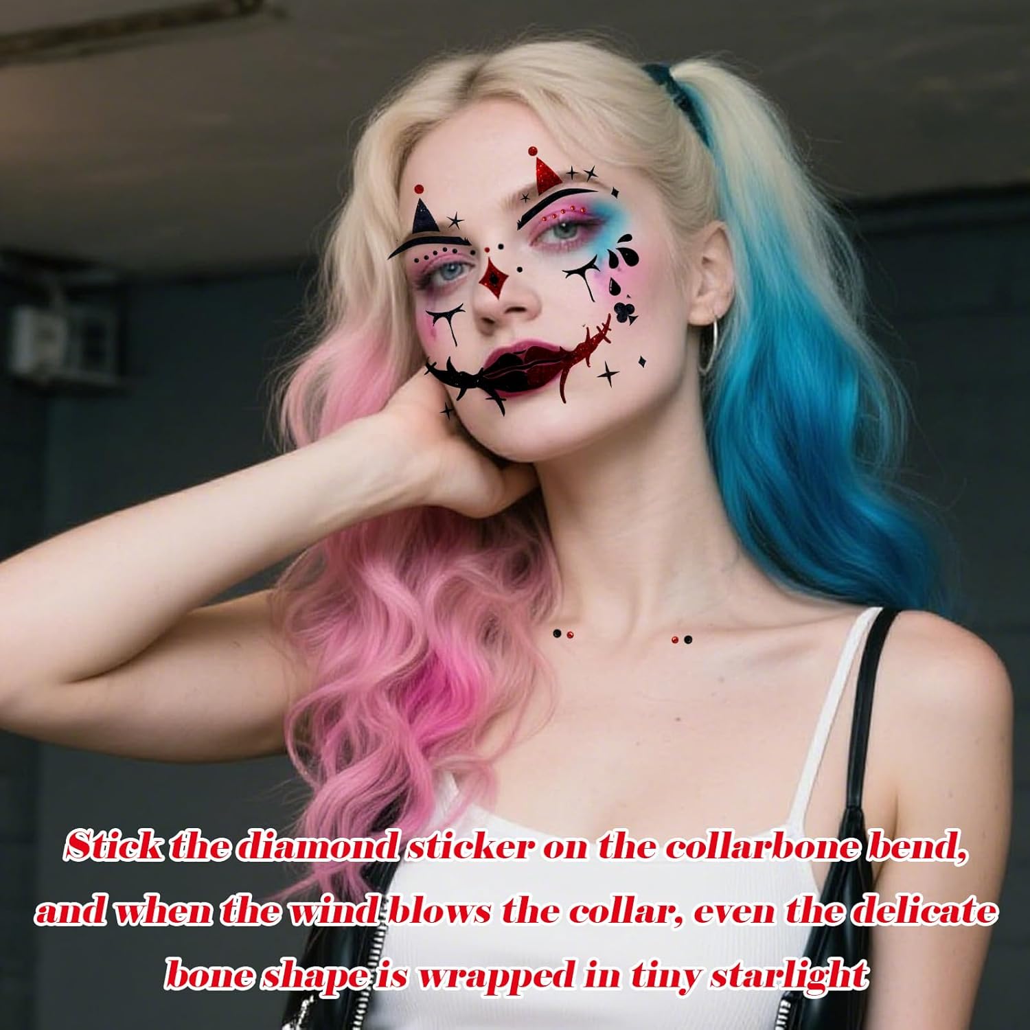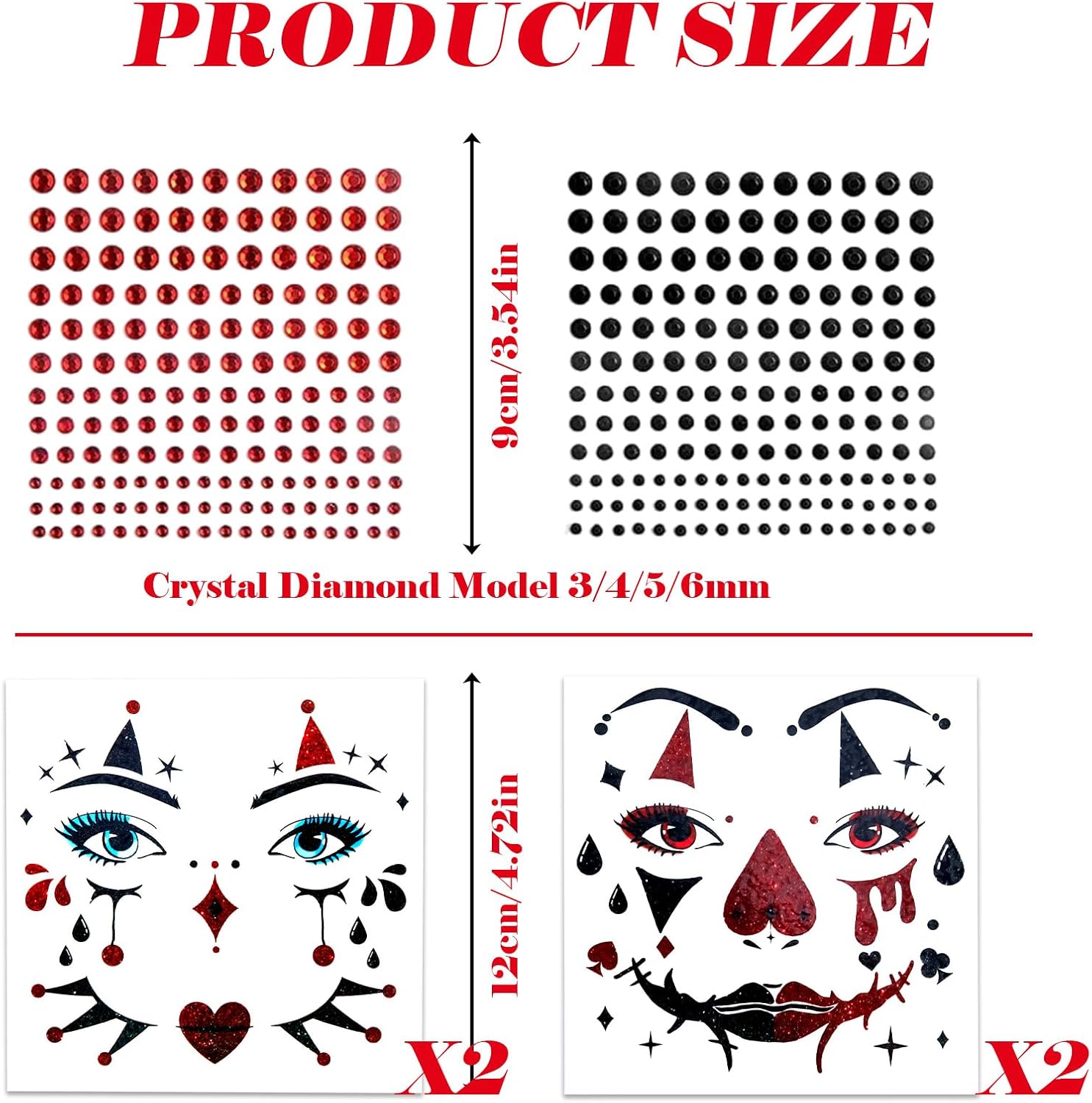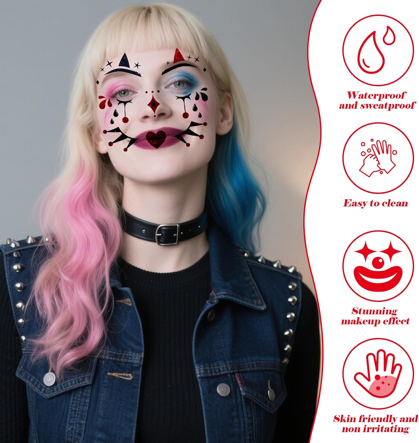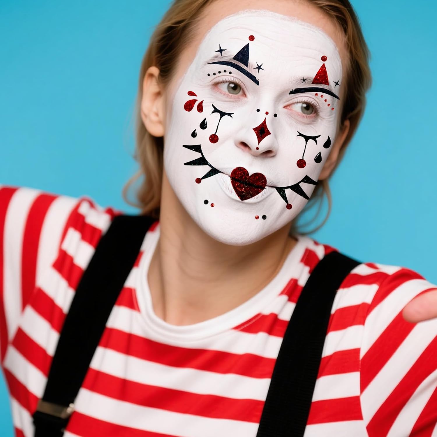 【Tatuaggio Viso Mimo】Riceverai quattro adesivi per tatuaggi viso mimo e due adesivi per il viso con strass. I nostri squisiti tatuaggi viso ti renderanno sicuramente al centro dell'attenzione ad Halloween, Martedì Grasso, Carnevale o altre feste a tema: perfetti per qualsiasi look da festa. 【Tatuaggio Viso Clown】Questo esclusivo adesivo per tatuaggi viso mimo presenta un motivo a clown mimo e un design glitterato, perfetto per qualsiasi costume di Carnevale! I nostri tatuaggi temporanei per il viso con glitter a forma di clown sono sicuri, impermeabili e durano tutto il giorno, aggiungendo un tocco festoso alla tua festa in maschera e creando ricordi indelebili. 【Adesivi con Gemme Glitterate】Le gemme scintillanti sono perfette per mettere in risalto occhi, guance o qualsiasi altro punto del viso tu voglia valorizzare con un tocco di glitter! I nostri adesivi per il viso con strass sono realizzati con materiali sicuri e di alta qualità e gli strass sono autoadesivi, quindi non richiedono colla. Ogni adesivo contiene 165 strass di varie dimensioni, permettendoti di combinare i tuoi design preferiti in base alle tue esigenze. 【Resistente e Facile da Applicare】I tatuaggi per il viso da clown sono realizzati con materiali sicuri, atossici e impermeabili di alta qualità, per garantire un look di Halloween impeccabile. I tatuaggi per il viso da clown sono incredibilmente facili da usare. Basta rimuovere la pellicola protettiva, ritagliare il disegno desiderato, inumidire l'adesivo del tatuaggio con acqua e applicarlo sulla zona desiderata. I tatuaggi per il viso da clown possono essere facilmente rimossi con olio per bambini o alcol. Sicuro sia per bambini che per adulti. 【Perfetto per Ogni Occasione】Il nostro set di tatuaggi per il viso da mimo e adesivi con strass scatena il tuo lato giocoso e vivace, rendendolo l'accessorio perfetto per chiunque desideri incarnare lo spirito iconico e colorato di un personaggio amato. Questo squisito tatuaggio temporaneo glitterato per il viso è perfetto non solo per il mimo, ma anche per Halloween, carnevali, feste in maschera e altre feste a tema. È l'aggiunta perfetta al tuo costume e ti metterà al centro dell'attenzione!