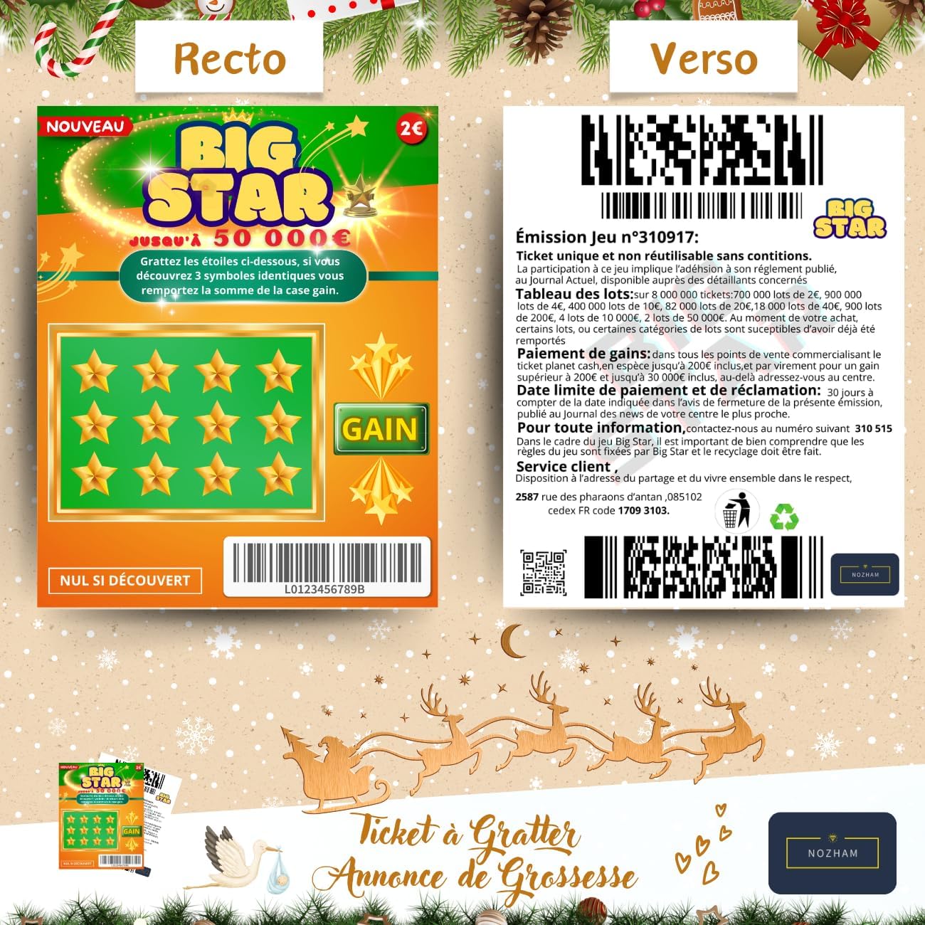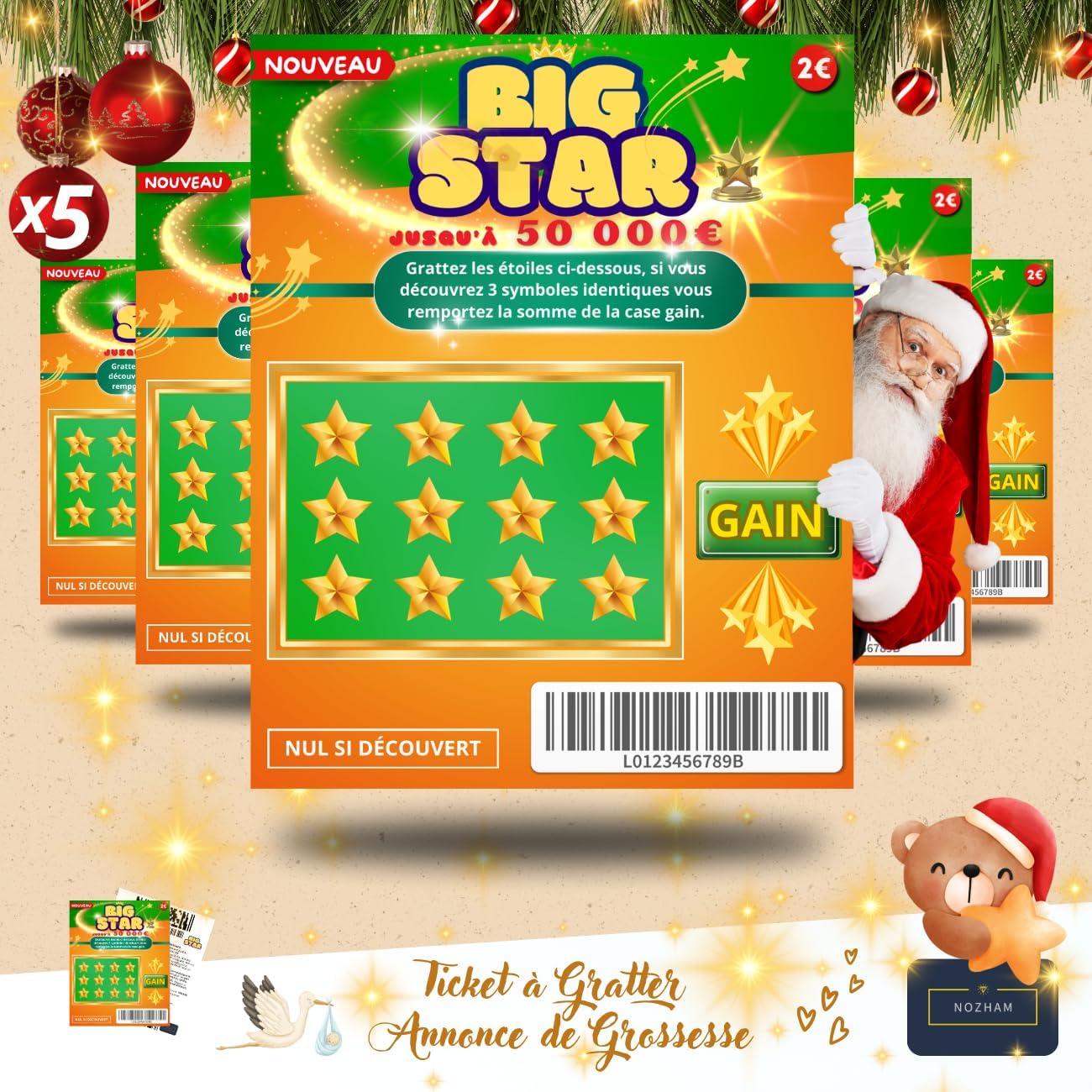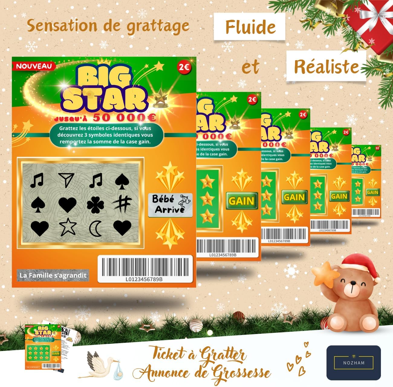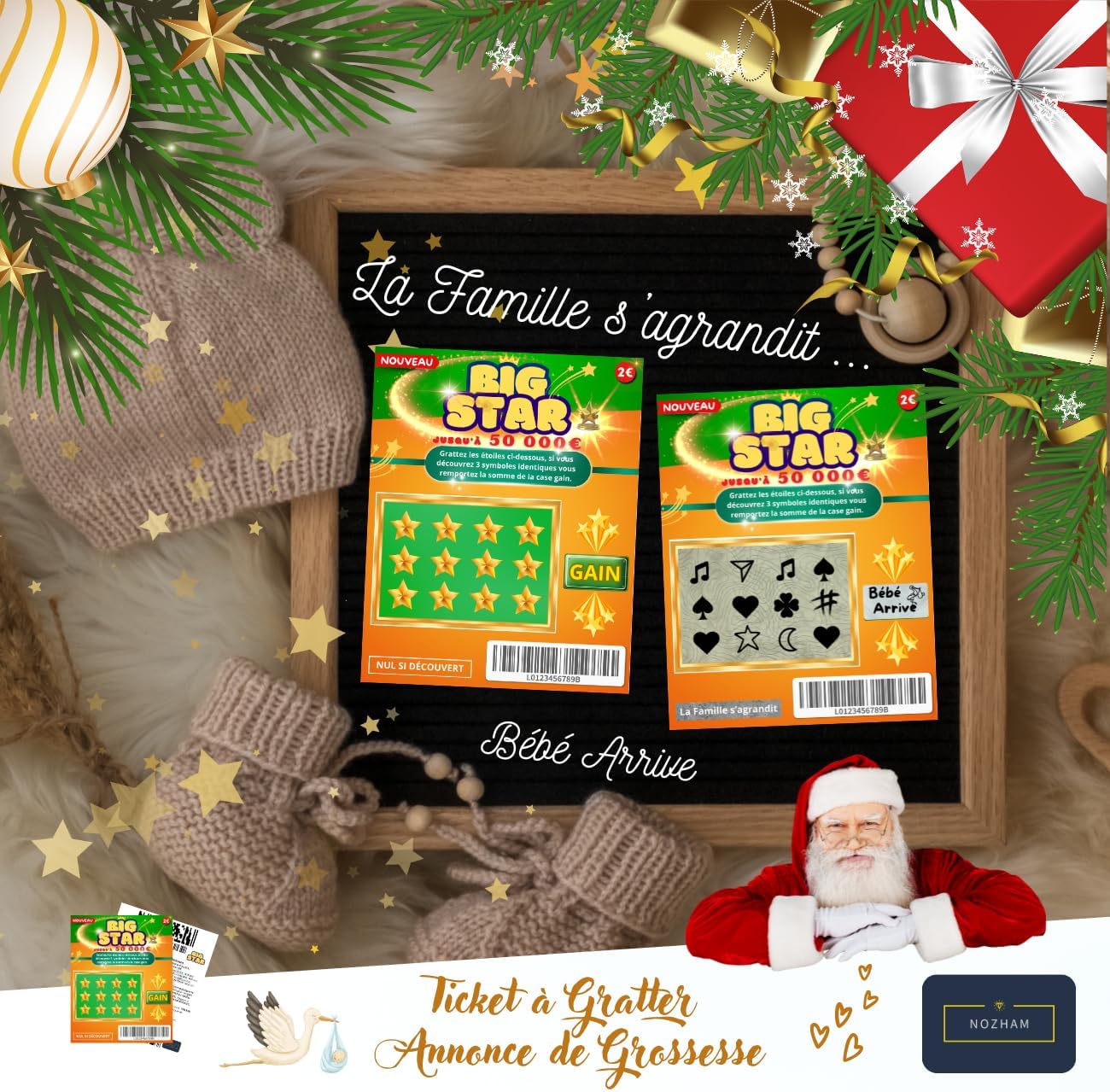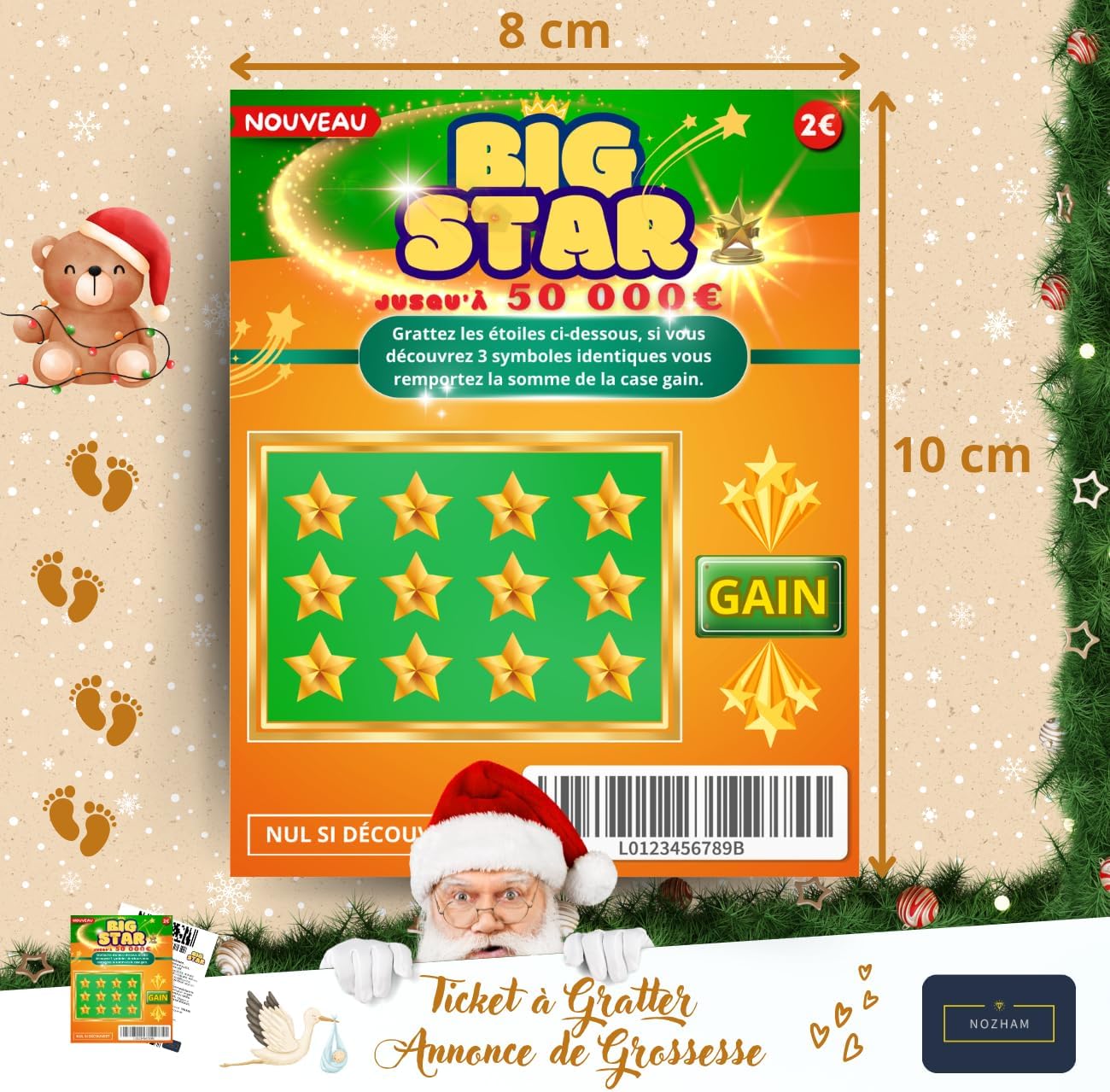 ✨ Imitazione realistica di un vero gratta e vinci, per una sorpresa garantita - Grammatura carta 300 g/m² - Sensazione di graffio ideale per un annuncio di gravidanza sorprendente e di successo. 🌟 Suspense e sorpresa dopo aver grattato le stelle che gradualmente portano al messaggio finale sotto la casella VINCI per scoprire “Baby is Coming”. Una rivelazione indimenticabile che toccherà il cuore di tutti. 💖 Annuncio originale ed emozionante: sorprendi i tuoi cari con un annuncio di gravidanza unico. Questo gratta e vinci BIG STAR porta un tocco di mistero ed emozione a questa grande novità! 🎁 Un ricordo prezioso: oltre ad annunciare una gravidanza, questo gratta e vinci può essere conservato come un prezioso souvenir, immortalando questo momento speciale per gli anni a venire. 🎉 Facile e divertente: perfetto per tutti i tuoi cari: dai genitori agli amici, tutti adoreranno grattare e scoprire questo magico annuncio che li riempirà di gioia!