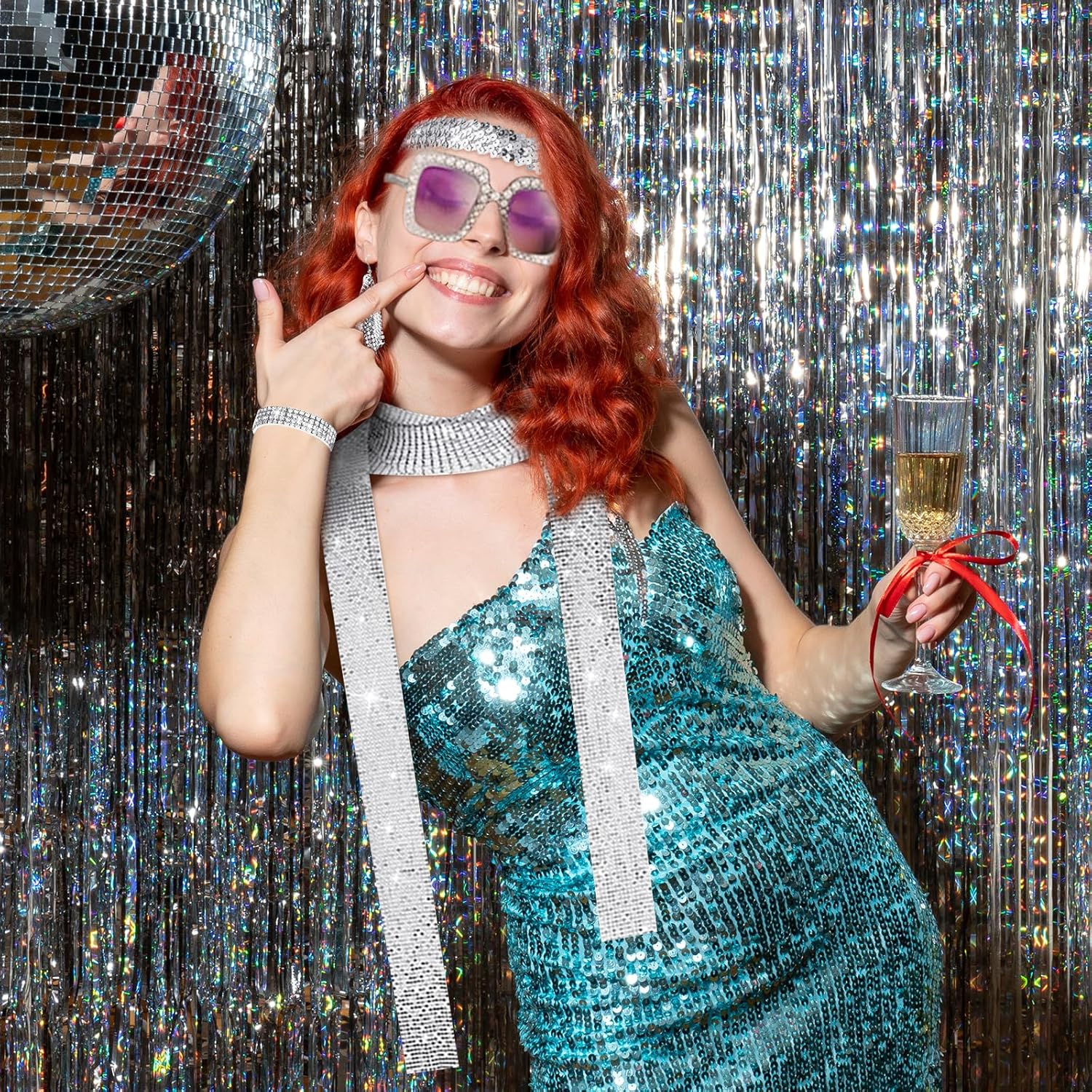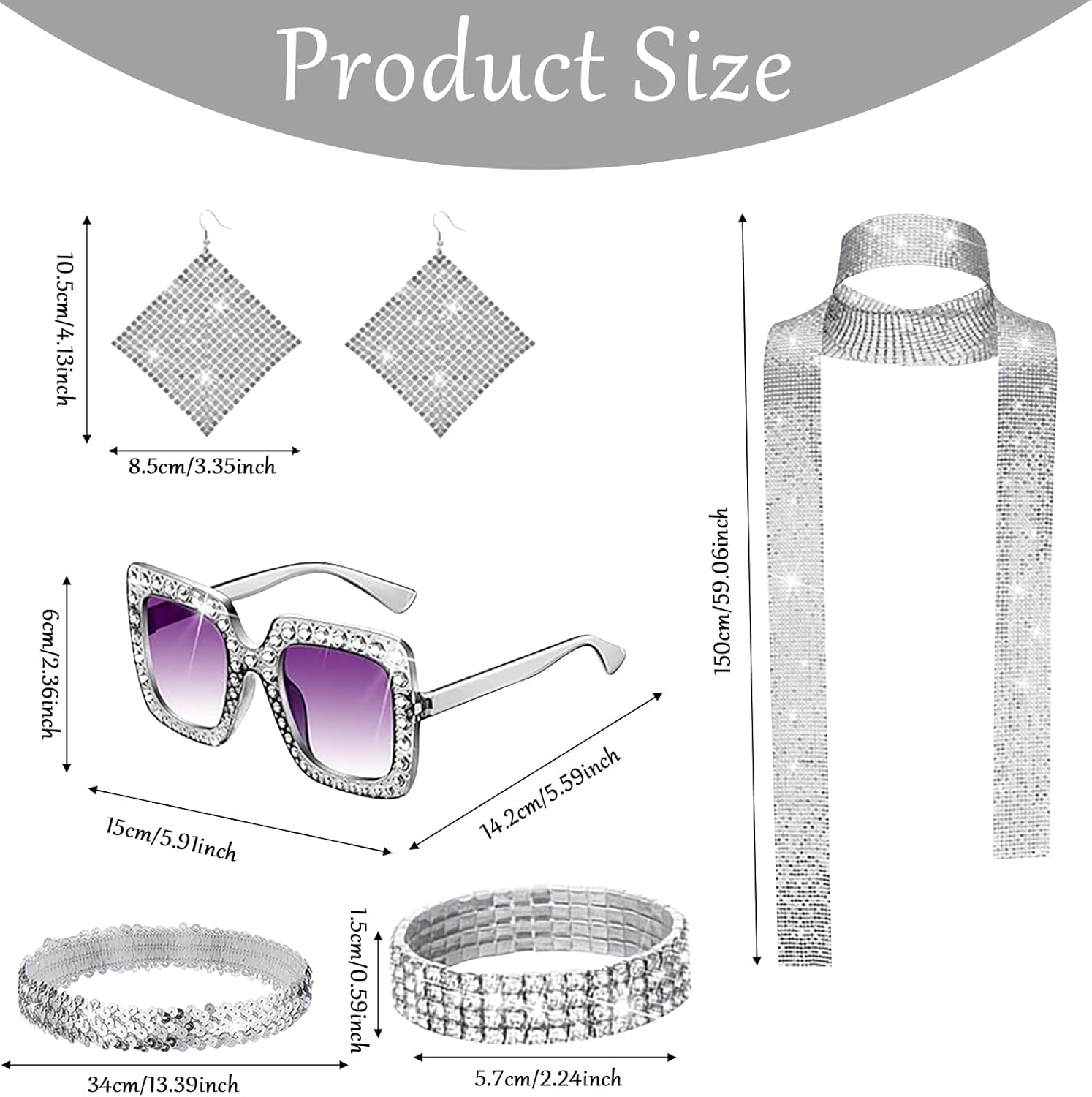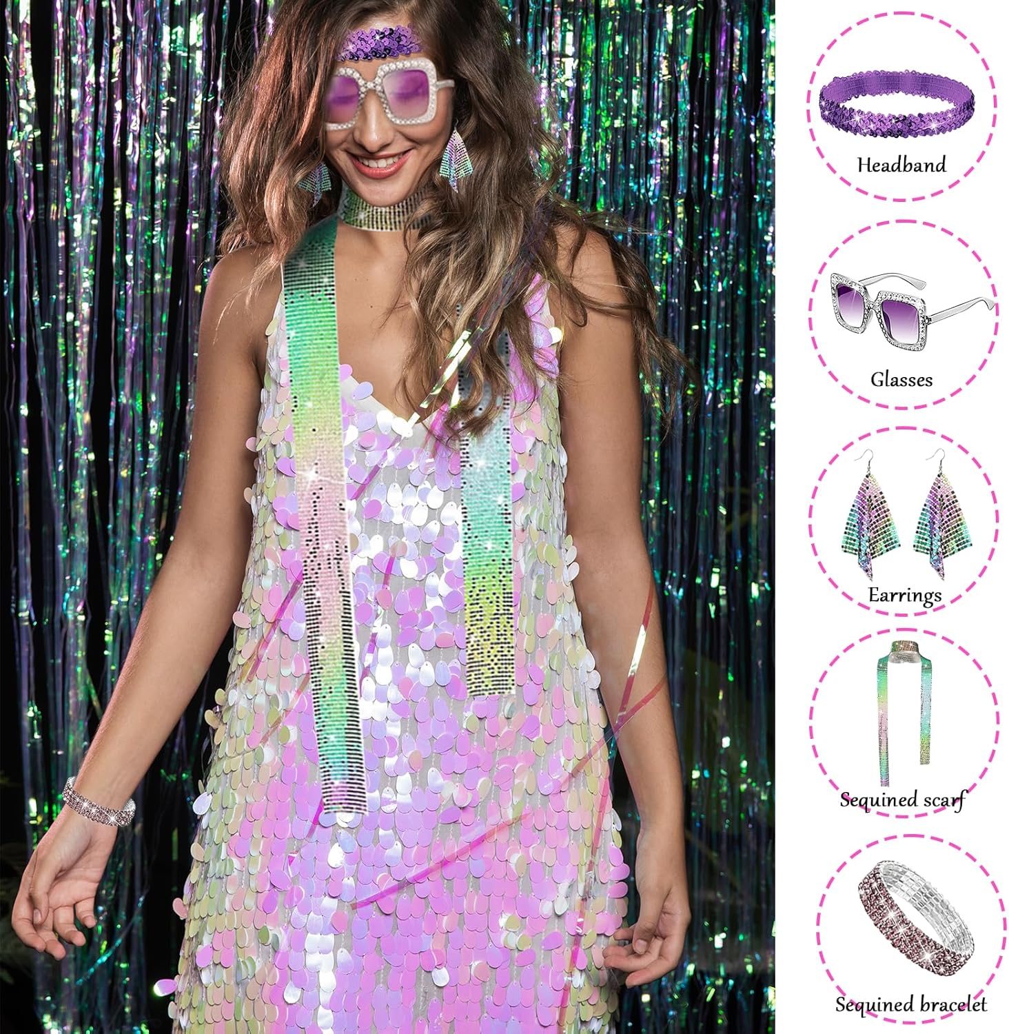 🪩✨【Retro Disco Paillettes Accessori Set:】Ispirati alla classica cultura disco degli anni '70, questi accessori sono caratterizzati da paillettes, finiture metalliche ed elementi scintillanti, che ricreano perfettamente lo stile sfavillante di quell'epoca d'oro per renderti il centro dell'attenzione sulla scena della festa. 🪩✨【Alta Qualità:】Realizzati con materiali leggeri ed ecologici, i lustrini rimangono saldamente attaccati senza staccarsi. Le montature offrono una struttura flessibile ma resistente, mentre i bordi degli accessori sono lisci e privi di sbavature. Ciò garantisce sia un comfort ottimale che una brillantezza duratura, permettendoti di ballare liberamente senza compromessi. 🪩✨【Dettagli Iconici:】Incorporando elementi distintivi come sfere da discoteca, riflessi arcobaleno e catene metalliche, i dettagli intricati e le ricche tonalità ti trasportano sulla pista da ballo degli anni '70, creando un'atmosfera retrò coinvolgente. 🪩✨【Set Di Accessori Versatile:】Questo Set Discoteca Accessori Festa Anni 80 comprende una fascia per capelli scintillante, occhiali da sole con diamanti incastonati, orecchini con nappine, bracciale con strass e sciarpa con paillettes. Abbinalo con facilità a pantaloni a zampa e capi lucidi per creare un look vintage dalla testa ai piedi, perfetto per feste a tema, eventi in maschera, festival musicali o celebrazioni festive. 🪩✨【Regalo Perfetto:】Questo set accessori discoteca accende passione e libertà della notte, rendendolo un regalo ideale per festa, sorpresa festiva o oggetto da collezione vintage. Che sia regalato agli amici o conservato per uso personale, mette in mostra un gusto unico e uno spirito nostalgico.