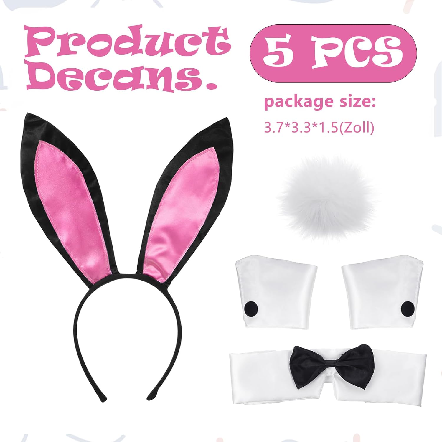 Specifiche del prodotto: Materiale: poliestere con finitura satinata. Contenuto: 1 cerchietto, 1 colletto con papillon, 1 paio di polsini, 1 coda di coniglio. Colore: rosa. Adatto per: adulti e ragazzi Caratteristiche del prodotto: Materiale di alta qualità: durevole e comodo da indossare. Design creativo: attraente motivo coniglio per un look affascinante. Multiuso: si può combinare con altri costumi. Regalo perfetto: ideale per amici, familiari e occasioni speciali. Scenari di utilizzo: feste in costume di Halloween Pasqua e feste di Natale Eventi cosplay e feste di compleanno a tema Carnevale, feste in maschera ed eventi di danza