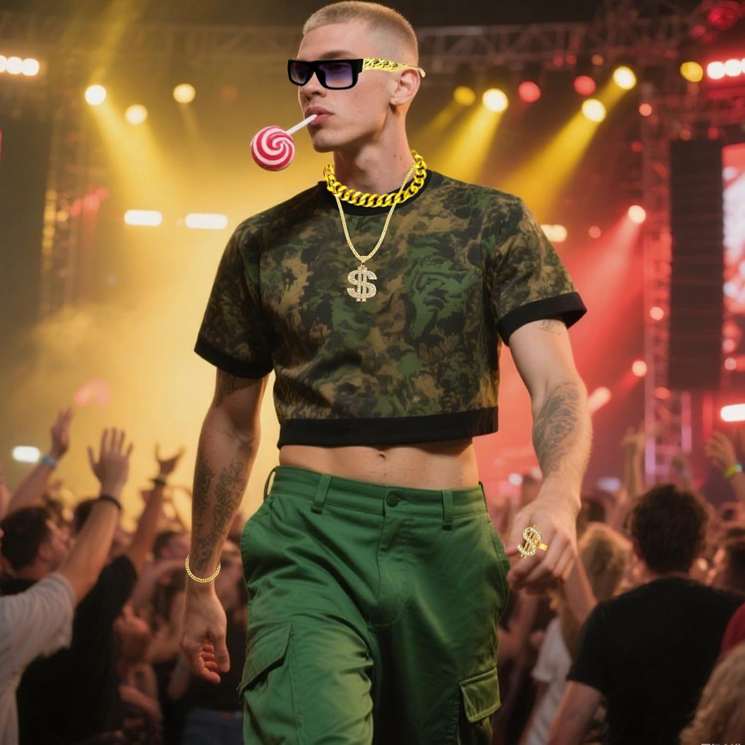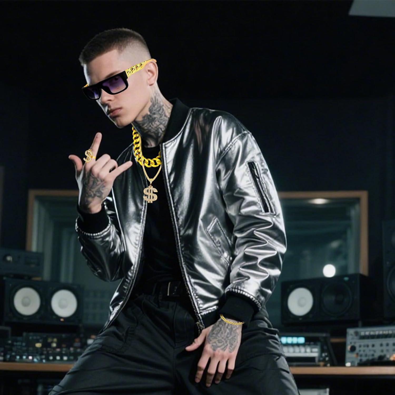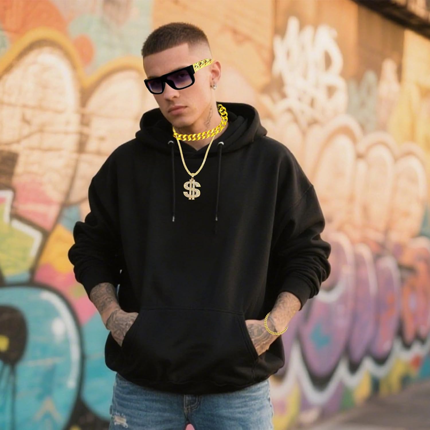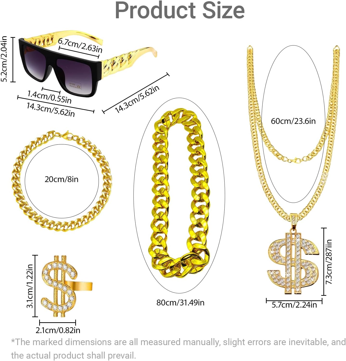 Specifiche tecniche: Materiale: plastica di alta qualità placcata in colore oro. La confezione include: 5 costumi hip hop. Caratteristiche: 1. Il nostro kit per costume hippie include 1 occhiali da sole hippie, 1 catena in oro finto, 1 anello hip hop, 1 collana con simbolo del dollaro, 1 braccialetto in oro finto. Questi sono sufficienti per soddisfare le tue esigenze di accessori per costume hip-hop/discoteca anni '80/90 e si abbinano perfettamente al tuo look retrò hip-hop/rap/discoteca. Tch con il tuo look retrò hip hop/rapper/discoteca. 2. Questi accessori hip hop sono progettati in stile classico retrò. Questi accessori hip hop sono adatti per molte occasioni, come accessori per costumi anni '70/80/90, accessori per costumi hippie, accessori da discoteca, accessori per festival da uomo, costumi da run dmc, costumi da rapper, costume glam rock per bambini, ragazzi, gril, uomini e donne. Note: Si prega di considerare un margine di errore di 0,5 cm a causa della misurazione manuale. A causa della differenza tra i diversi monitor, l'immagine potrebbe non riflettere esattamente il colore dell'articolo.