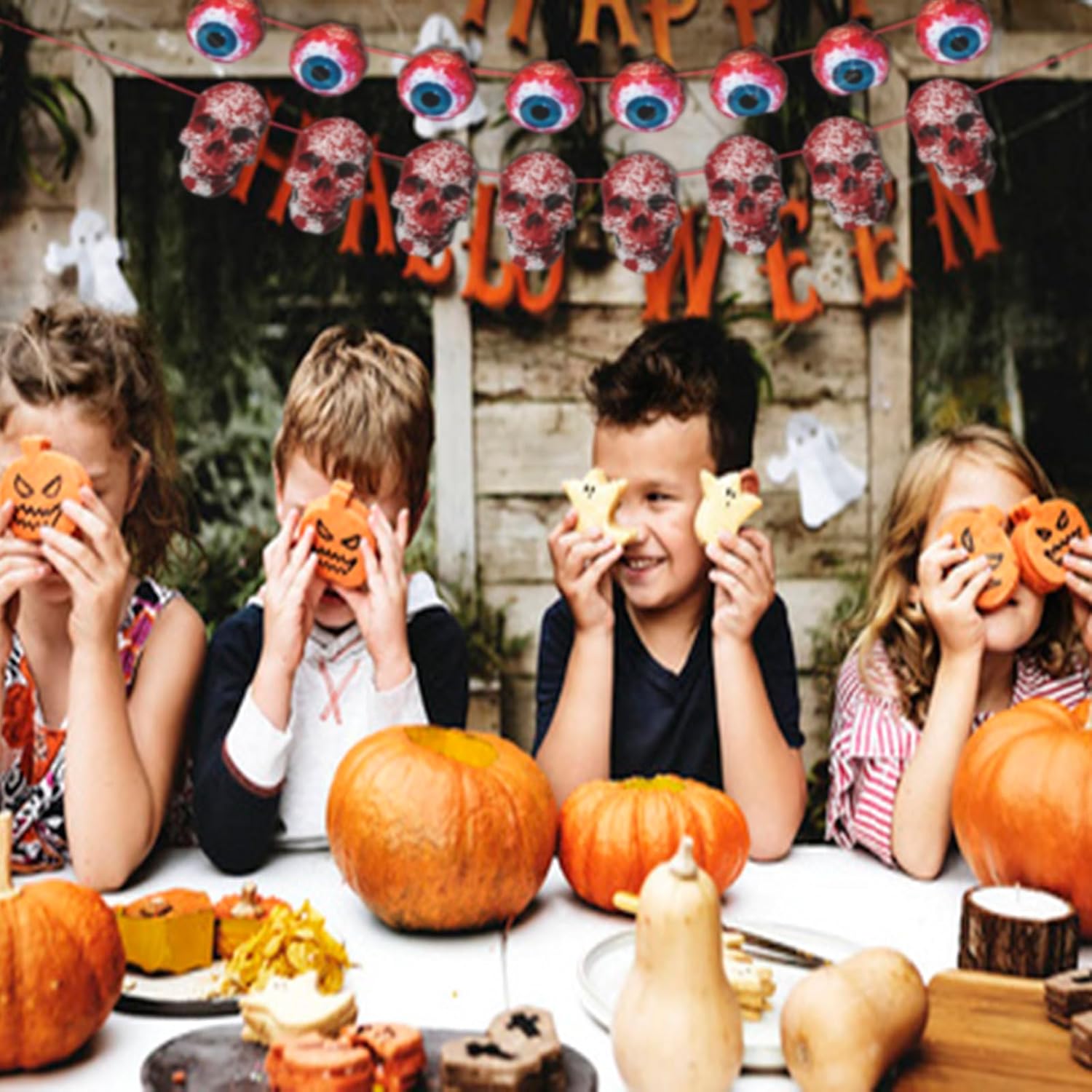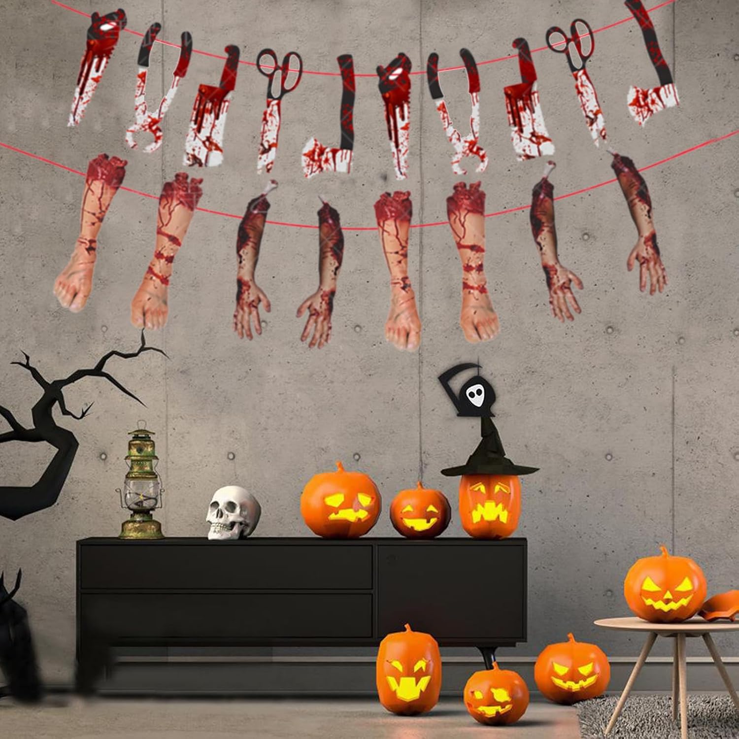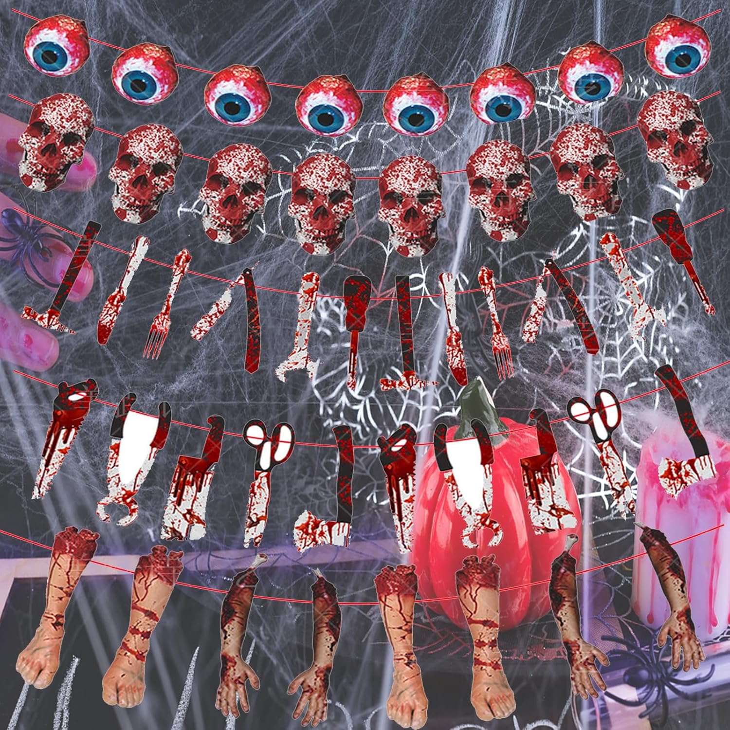 Utilizzo: adatto per decorare feste di Halloween europee e americane, può essere appeso all'esterno e all'interno per creare un'atmosfera bella e spettrale. Design spaventoso e divertente: queste decorazioni di carta di Halloween hanno un design unico e spaventoso con mani e impronte, coltelli e teschi. Aggiungono un'atmosfera divertente ed emozionante a qualsiasi festa o evento di Halloween, rendendoli la scelta perfetta per la decorazione. VARIE MISURE DISPONIBILI: Le decorazioni in carta Halloween sono disponibili in diverse misure per decorare qualsiasi stanza o stanza. Che tu voglia arredare una grande sala banchetti o un piccolo soggiorno, queste decorazioni sono adatte a tutto. Installazione semplice: le decorazioni di carta di Halloween sono dotate di fiocchi e puntine per colla, il che rende l'installazione molto semplice. Possono essere appesi al soffitto o alle pareti oppure utilizzati come sfondo per la festa di Halloween. Convenienti e riutilizzabili: queste decorazioni di carta di Halloween sono convenienti e possono essere riutilizzate anno dopo anno. Sono un modo economico per creare un'atmosfera spettrale ed emozionante alla tua festa di Halloween.
