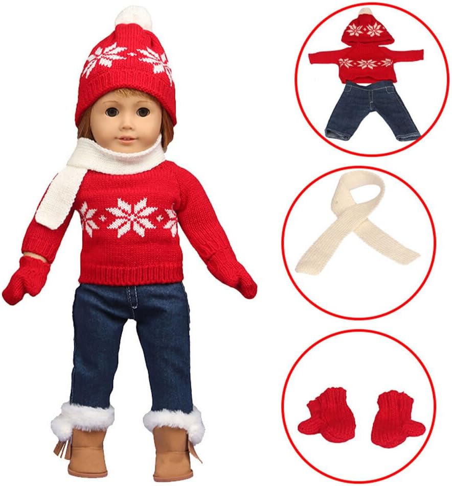 Regalo di Natale Per unico: i vestiti per bambole natalizie per bambole da 18 pollici sono il regalo perfetto per ogni appassionato di bambole. Che tratti di un bambino o di un collezionista adulto, questi outfit sono la scelta per diffondere l'allegria natalizia Completo natalizio: il nostro set di vestiti per bambole di Natale, un delizioso completo che include 1 maglione, 1 sciarpa, 1 cappello, 1 paio di pantaloni, 1 paio di guanti, tutti perfettamente progettati per adornare le bambole da 18 pollici. Rendi la tua bambola molto attraente Design a tema natalizio: questi vestiti per bambole da 18 pollici sono disponibili nella classica combinazione di colori natalizi, design rosso e bianco, hanno un bell'aspetto e una forma carina; Ci sono motivi a fiocchi di neve sui vestiti e sui cappelli, lascia che la tua bambola sia carina e bella Materiali di qualità: realizzati con tessuti di qualità, il maglione, la sciarpa, i guanti, il cappello e i pantaloni vantano una deliziosa morbidezza delicata al tatto. Questi vestiti per bambole da 18 pollici sono tutti realizzati con materiali di qualità Facile da indossare: questi vestiti rendono più facile vestire la tua bambola. Puoi facilmente far indossare questi vestiti alla tua bambola