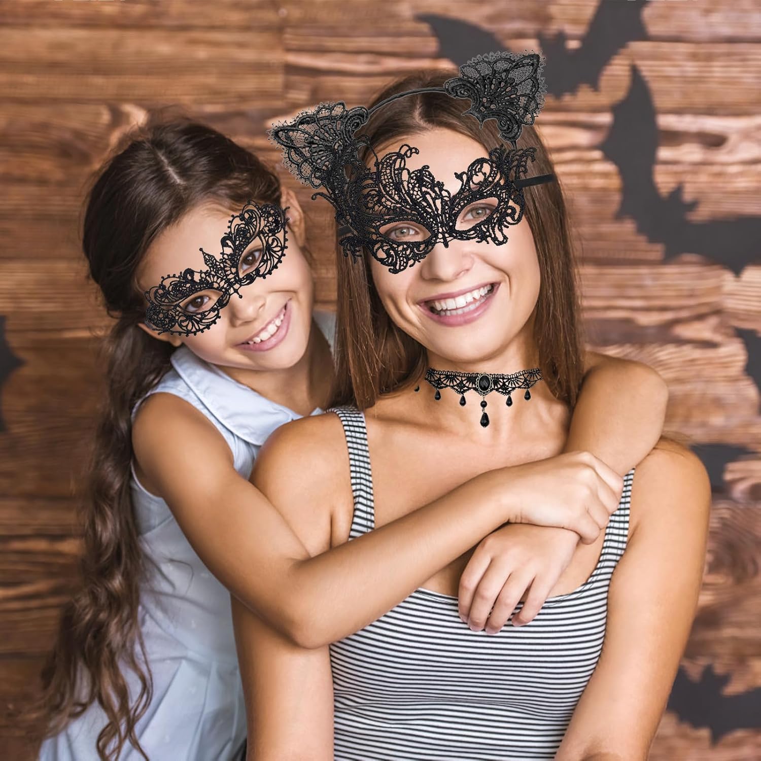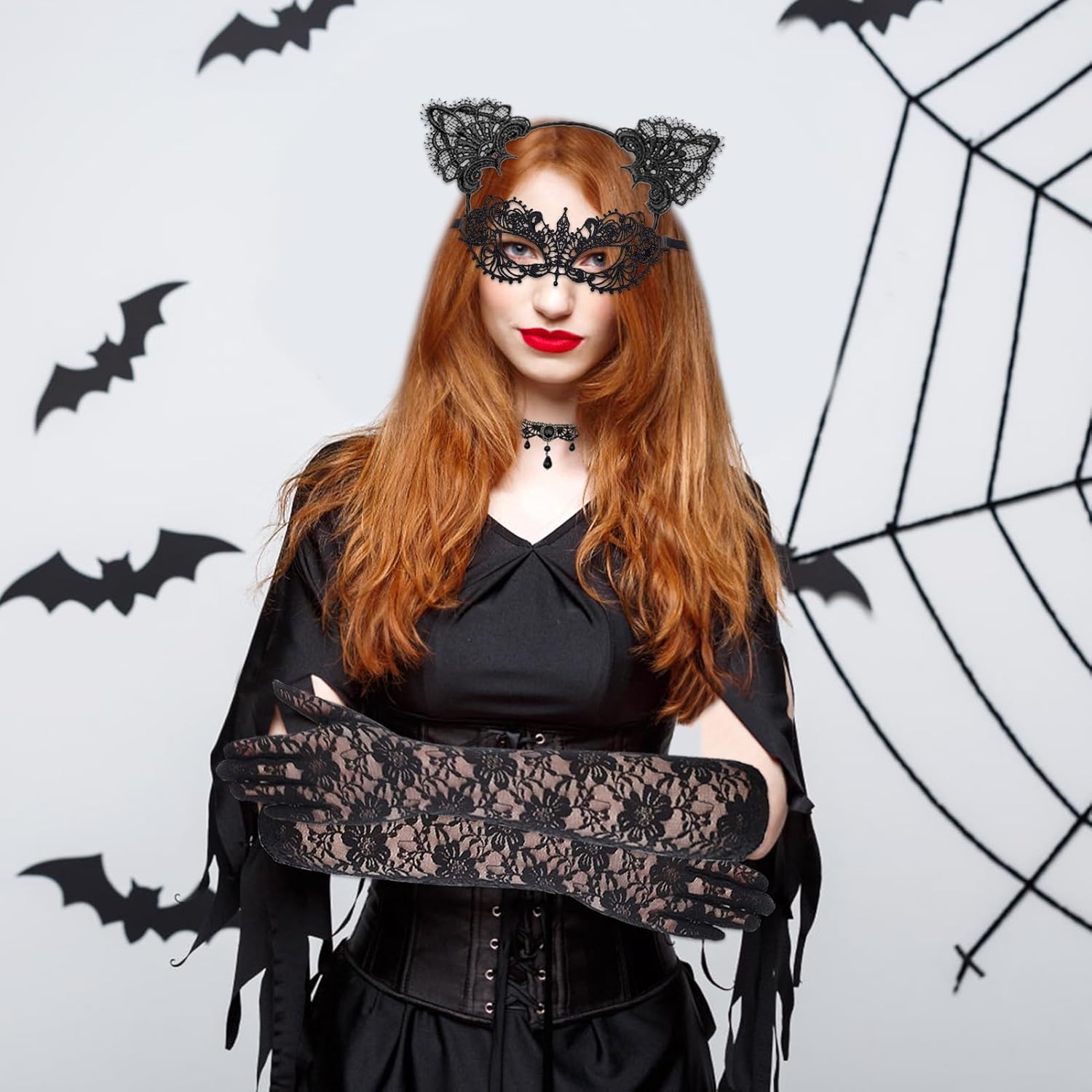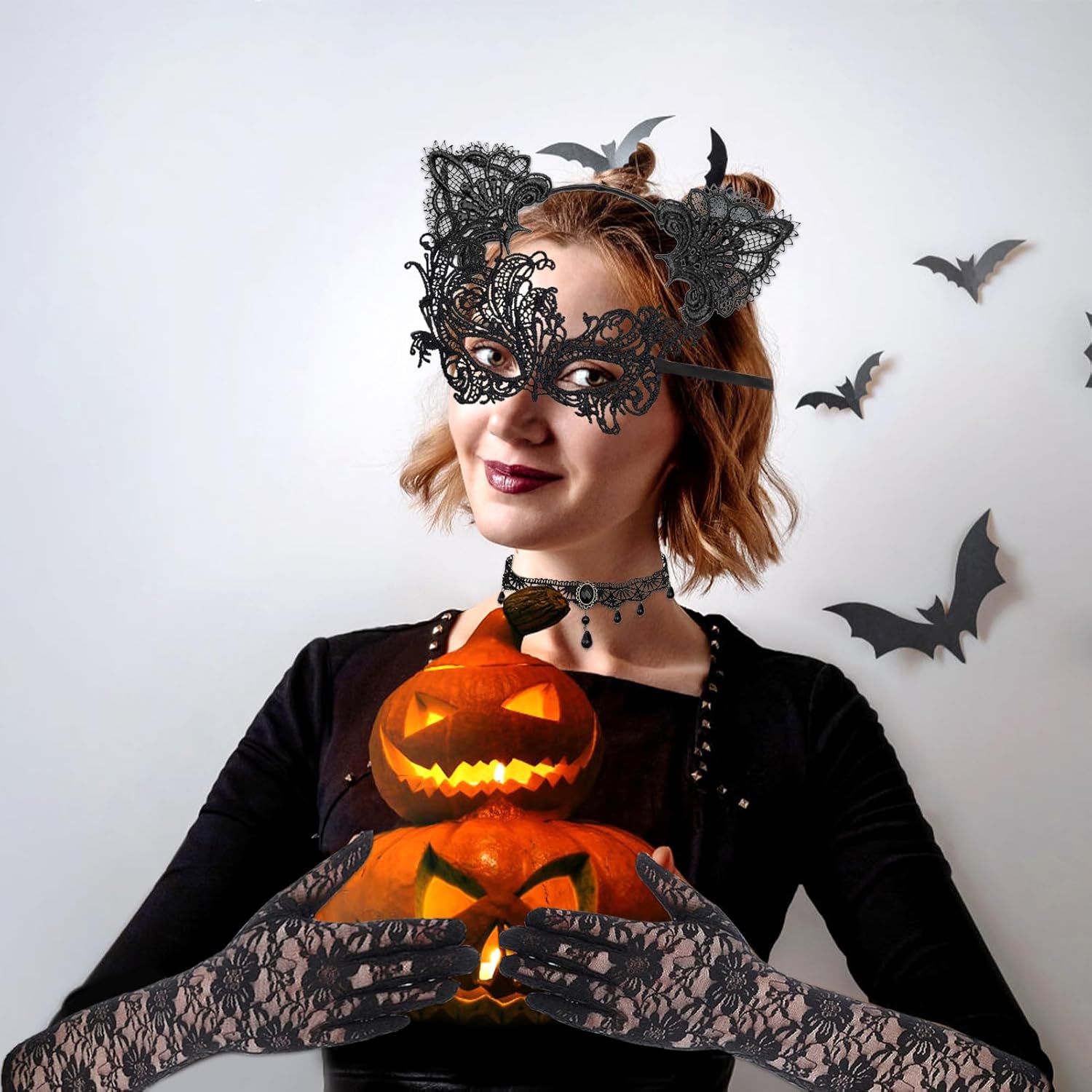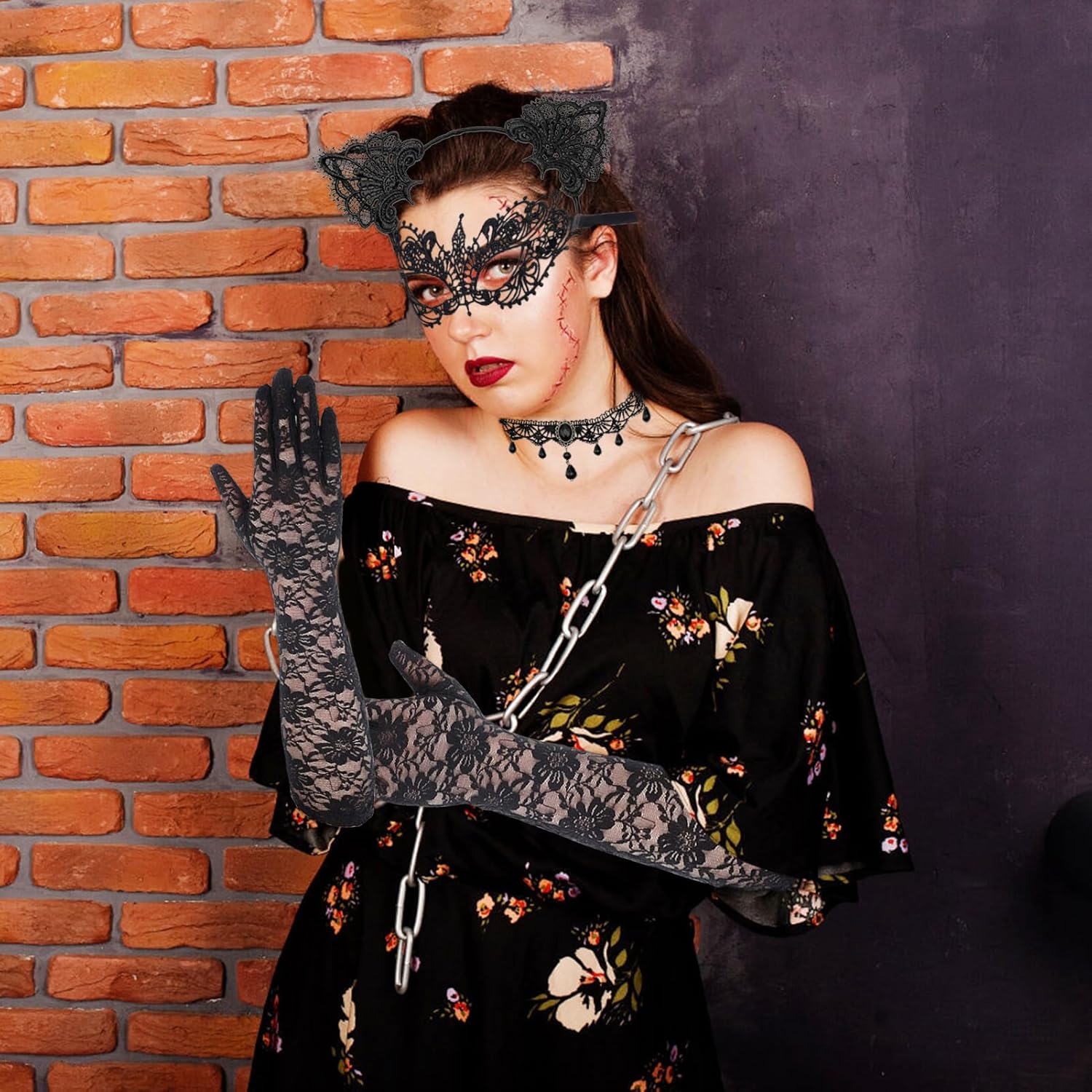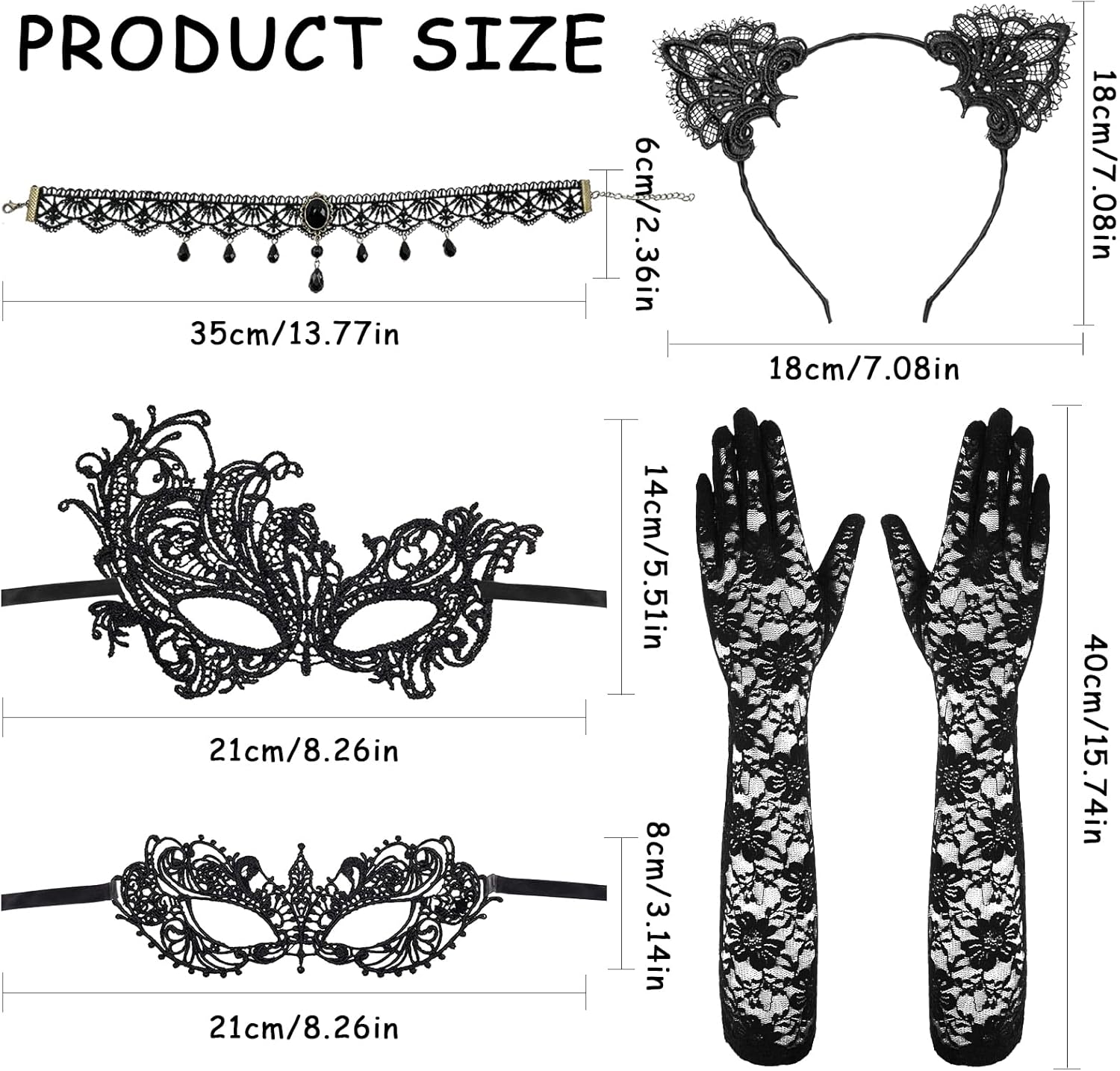 5 pezzi maschera di pizzo nero, fascia per orecchie di gatto in pizzo, colletto di pizzo, guanti di pizzo, costume orecchie di gatto, decorazione di maschere di carnevale in maschera