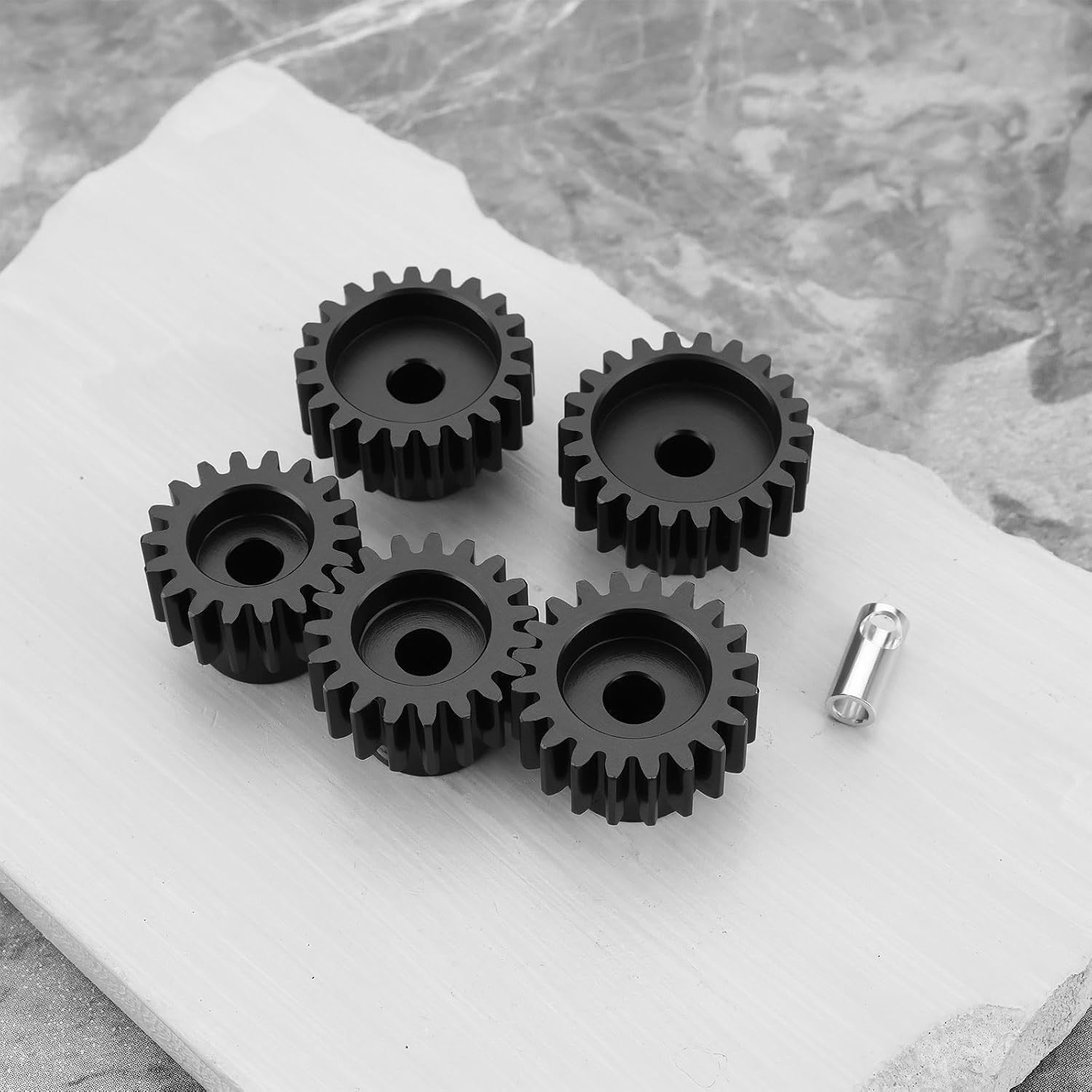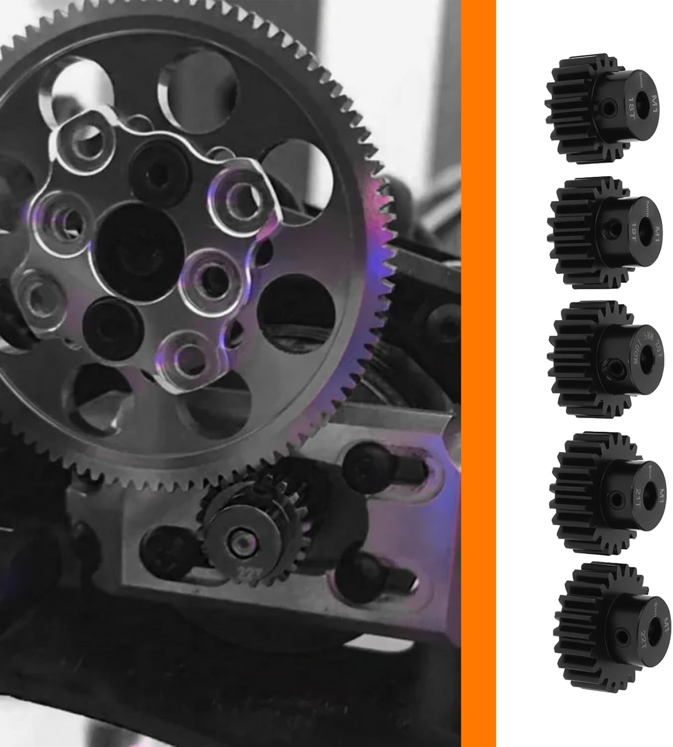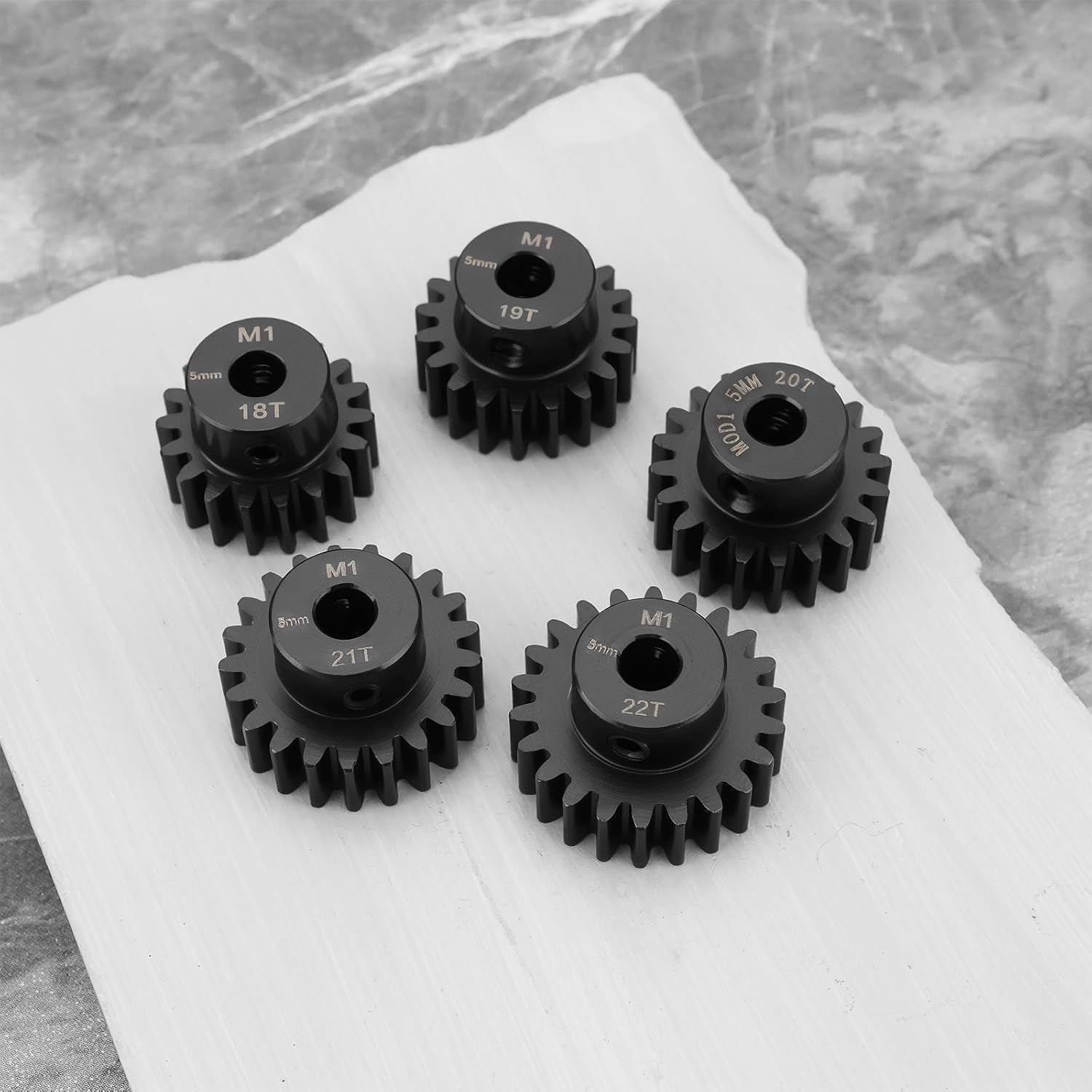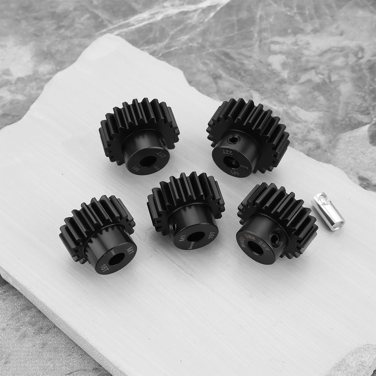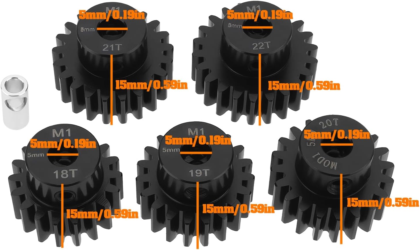 Parametri : Numero di denti : 18T, 19T, 20T, 21T, 22T; Passo ingranaggio : Mod 1; Alesaggio : 5 mm; Altezza : 15 mm. Compatibilità versatile : Compatibili sia con motori RC brushed che brushless, il che li rende ideali per un'ampia gamma di auto RC 1/8 e 1/10. Acciaio temprato : Realizzati in affidabile acciaio temprato, questi pignoni offrono una resistenza superiore e prestazioni durature per i motori RC. Coppia elevata : Progettato per gestire le elevate richieste di coppia delle auto e dei camion RC, garantendo un innesto delle marce fluido ed efficiente. Confezione : Include 5 diverse misure di ingranaggi (18T, 19T, 20T, 21T e 22T) con giunto albero da 5 mm a 3,175 mm, per darti la flessibilità necessaria per ottimizzare le prestazioni della tua auto.