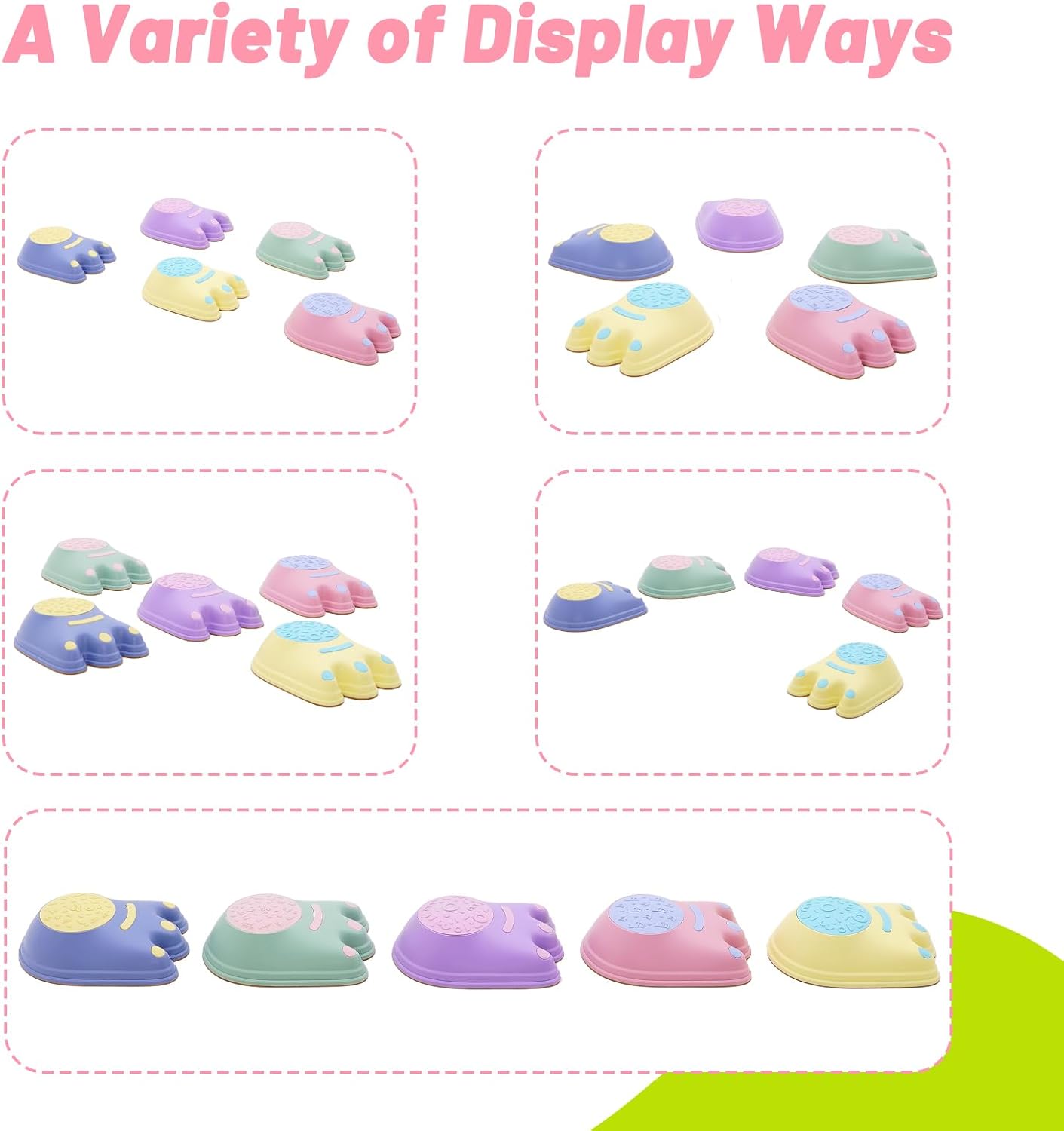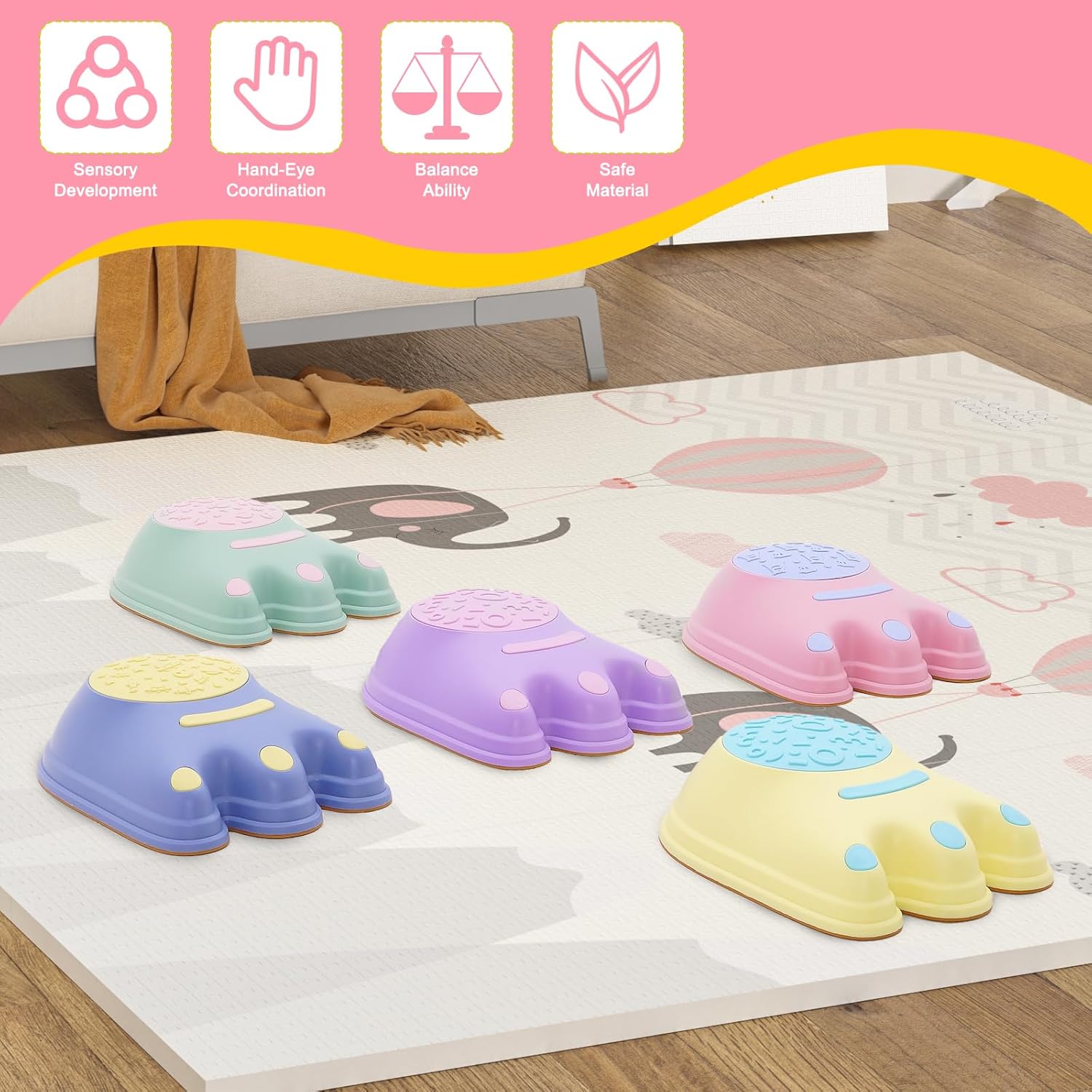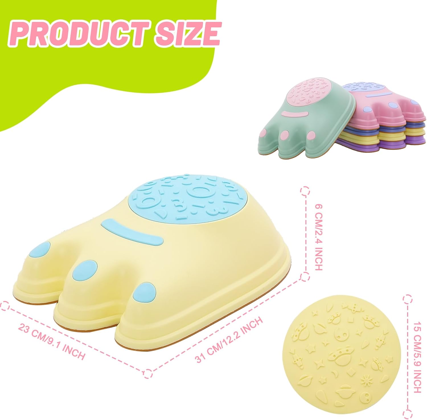 【5 Pietre dell'equilibrio per bambini】 Include 5 pietre dell'equilibrio antiscivolo a forma di impronta, perfette per ragazzi e ragazze dai 3 anni in su. Ottimo giocattolo sensoriale per uso interno ed esterno, aumenta la fiducia nell'equilibrio e nella coordinazione, sviluppa la coordinazione occhio-mano e il riconoscimento dei colori. Il fondo della pietra dell'equilibrio è dotato di strisce antiscivolo per aumentare l'attrito tra i piedi e il terreno per evitare che il bambino scivoli durante l'uso. Con questi trampolini di lancio puoi realizzare tanti giochi educativi perfetti per la classe. Alcune idee includono: percorsi a ostacoli, conteggio e riconoscimento dei colori e altro ancora. Adatto per l'uso in case, asili nido, scuole, asili nido e altri luoghi. 【Sicuro e facile da riporre】 Ogni pietra dell'equilibrio per bambini è realizzata in plastica sicura ed ecologica, e i bordi lisci e arrotondati impediscono ai bambini di graffiarsi, garantendo la loro sicurezza. Quando finisci di giocare, puoi impilarli per risparmiare molto spazio di archiviazione.,Migliora l'interazione genitore-figlio: le nostre pietre di equilibrio possono sostenere il peso di bambini e adulti. Genitori e figli possono giocare insieme in giardino, sul prato e a casa, allenando la capacità di equilibrio dei bambini, migliorando al tempo stesso l'interazione genitore-figlio e rafforzando l'amicizia