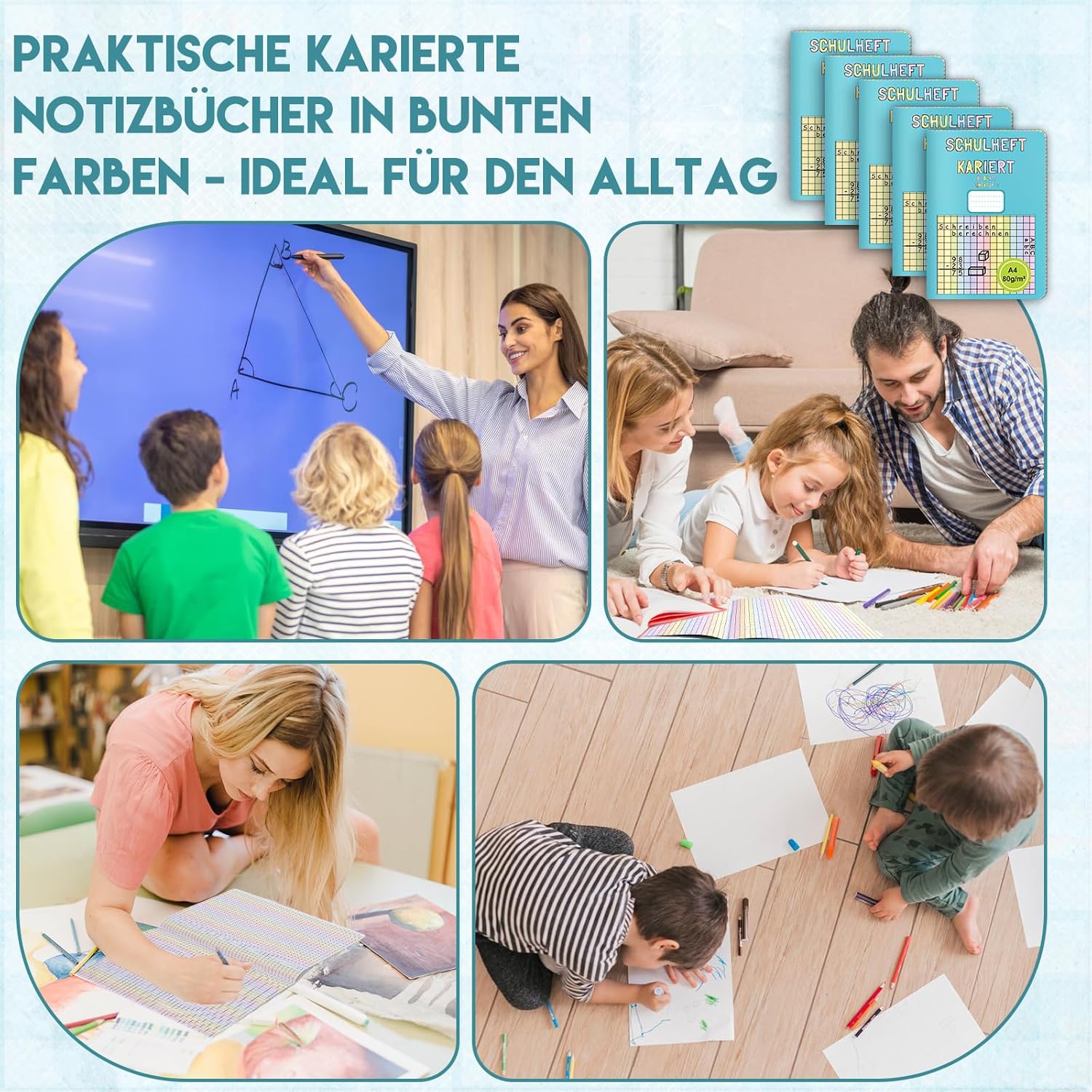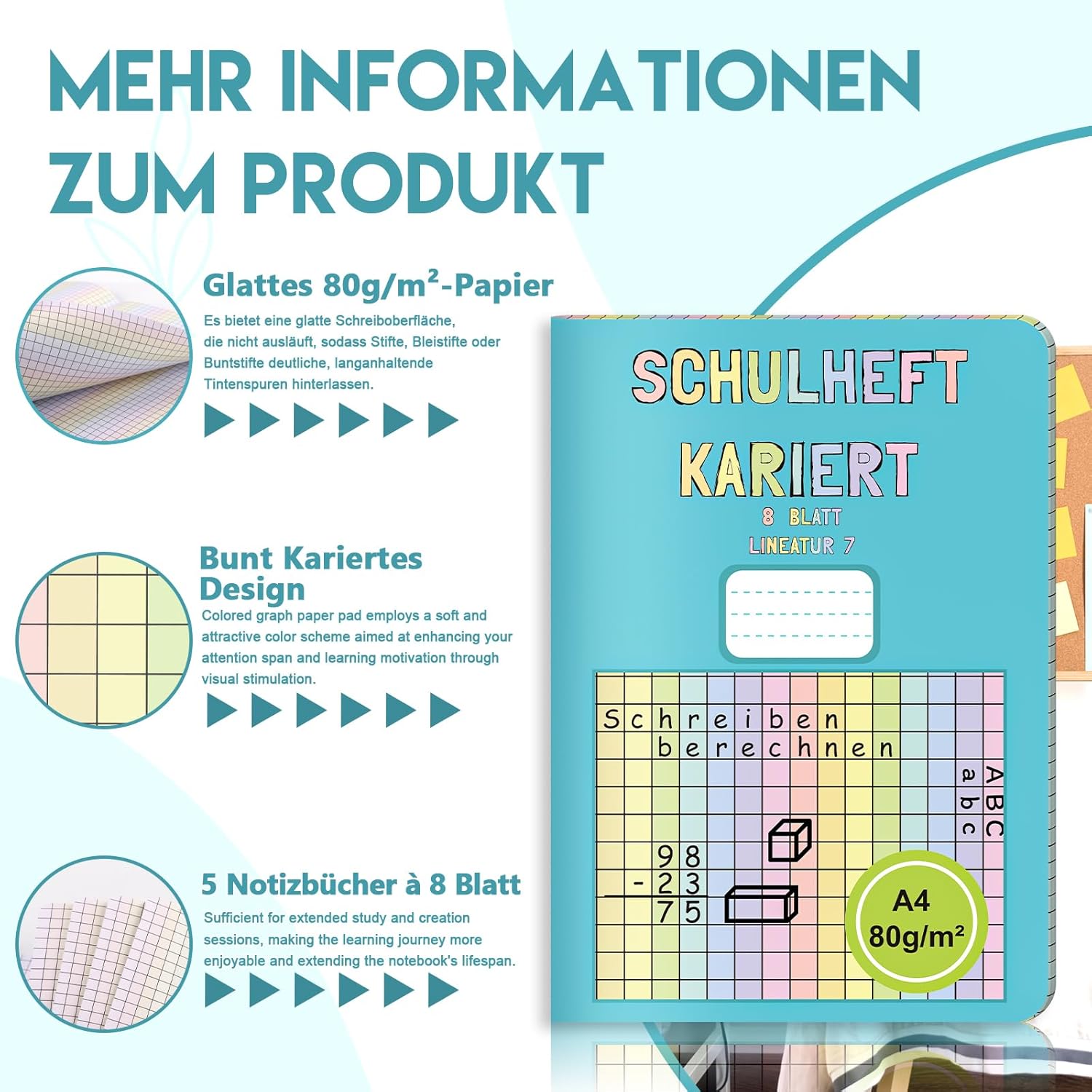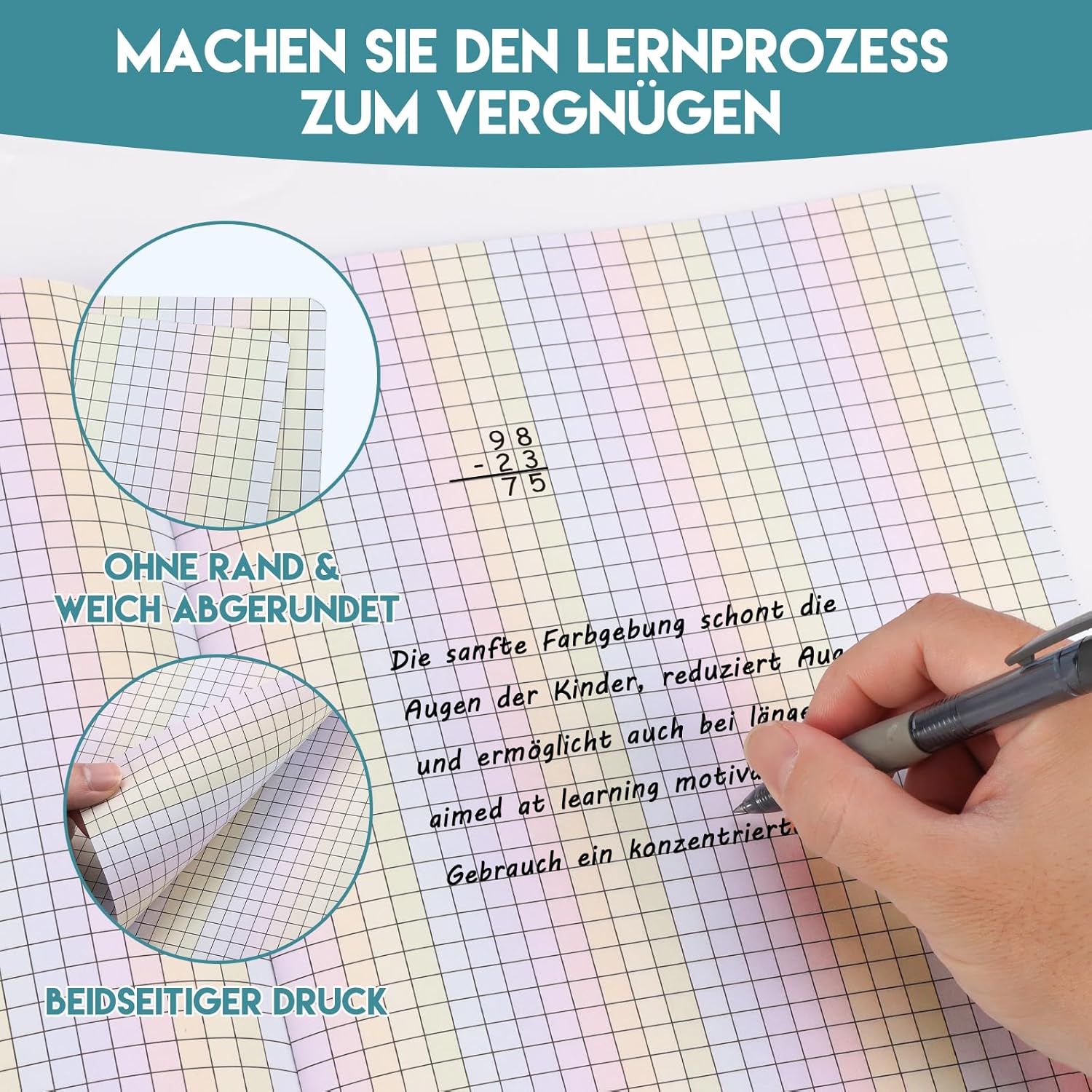 【Applicazioni di apprendimento】Questo set di 5 quaderni colorati A4 a quadretti è realizzato su misura per bambini in età inferiore e un pratico quaderno educativo. È ideale per esercizi di scrittura, calcoli matematici in classe, consolidamento della conoscenza e pittura creativa dopo la scuola. Perfetto come quaderno per matematica 1. Quaderno a scacchi di classe o versatile. Esperienza di scrittura migliorata: le pagine interne del quaderno A4 a quadretti rigatura 7 sono costituite da 80 g di carta A4 di alta qualità per la stampa a colori su entrambi i lati. I colori delicati proteggono gli occhi dei bambini, riducono l'affaticamento degli occhi e consentono una scrittura concentrata anche dopo un uso prolungato. Durevole e affidabile: la busta di carta da 250 g di rame di questo quaderno educativo è resistente alla stampa esterna. La rilegatura a punto sella assicura che il taccuino a quadretti rimanga robusto anche in caso di uso frequente nello zaino della scuola. Così il quaderno A4 a quadretti lineatura accompagna in modo sicuro 7 bambini nella vita scolastica. Rotondo sicuro degli angoli: gli angoli rotondi adatti ai bambini del quaderno scolastico formato A4 a quadretti proteggono le mani piccole da lesioni. Questo dettaglio ben congegnato rende il quaderno di matematica 1. Classe non solo più sicura, ma anche visivamente accattivante, così il quaderno di apprendimento diventa il compagno popolare. Quadratura da 7 x 7 mm: i lati senza bordi del quaderno A4 a quadretti lineatura 7 con quadri colorati offrono un perfetto orientamento. Sia come libretto di matematica 1. Quaderno a quadretti di classe o creativo: la rigatura 7 favorisce il lavoro concentrato e fa desiderare l'apprendimento. Il colore del quaderno scolastico A4 a quadretti supporta in modo ottimale i primi passi a scuola.