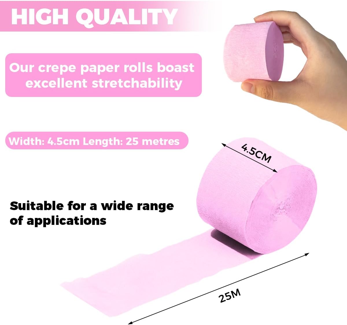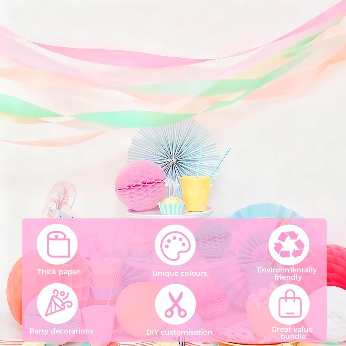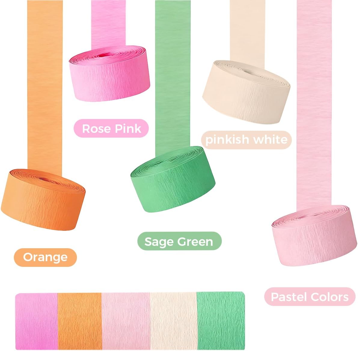 Rotoli di carta crespa: stelle filanti di carta crespa realizzate con materiali riciclabili ed ecologici di prima qualità, sono morbidi e facili da modellare. Con una larghezza di 4,5 cm (circa 1,8 pollici) e una lunghezza di 25 metri (circa 82 piedi), è facile da appendere, ruotare o arricciare. Facile da usare e versatile, può essere riutilizzato più volte ed è sicuro per l'ambiente. Colori splendidi: i nostri nastri per mascheratura arcobaleno sono disponibili nei colori rosa, arancione, rosa rossa, verde salvia e pastello, che consentono combinazioni e abbinamenti liberi per creare senza sforzo decorazioni personalizzate di grande impatto visivo che soddisfano le esigenze di stile di diversi scenari. Squisite decorazioni per le feste: il nastro adesivo decorativo in carta è adatto per compleanni, matrimoni, fidanzamenti, battesimi, anniversari, lauree e feste estive. Può anche aggiungere vitalità alle feste pasquali e primavera-estate, oltre a servire come decorazione domestica per abbellire camere da letto, soggiorni e aule, creando senza sforzo una festa per gli occhi visivamente ricca e dinamica. Applicazioni fai da te: non solo può essere appeso al soffitto per creare effetti di nappe o fungere da sfondo per fiori e luci, ma può anche diventare uno sfondo fotografico da sogno per catturare momenti indimenticabili. È ideale anche per lavoretti genitori-figli e progetti fai-da-te condivisi con gli amici per rafforzare i legami emotivi e alleviare lo stress attraverso la creatività. Installazione semplice: ogni set contiene 5 rotoli di carta crespa arcobaleno in diversi colori, ciascun rotolo ha una lunghezza di 25 metri. Ciò fornisce ampio materiale per decorare grandi sale per feste o organizzare con cura gli ambienti locali. È un accessorio conveniente per decorare porte, finestre e pareti che soddisfa senza sforzo la maggior parte delle esigenze decorative risparmiando tempo e fatica.