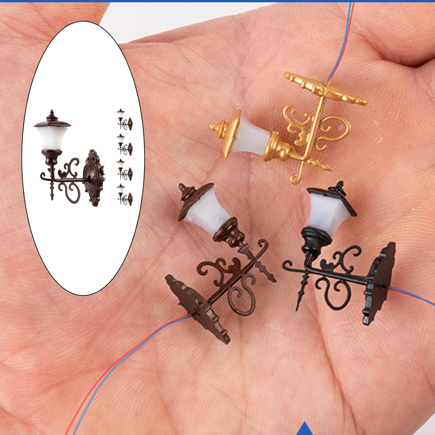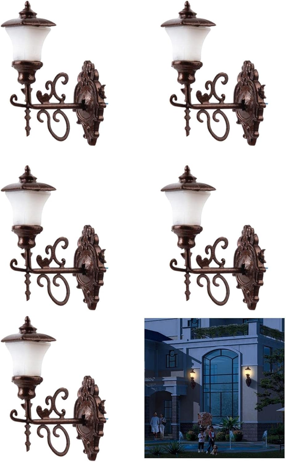 5 pezzi in scala 1:87 HO modello fai da te lampada da parete per strada lampada da giardino in miniatura luci LED. Adatto per la maggior parte dei kit di scenari ferroviari. Perfetto per mini giardino fatato, modello di tavolo architettonico in sabbia, miniature fai-da-te, decorazioni paesaggistiche. I migliori regali per l'arredamento del tuo modello. Voltaggio: compatibile 3 V CA o CC.