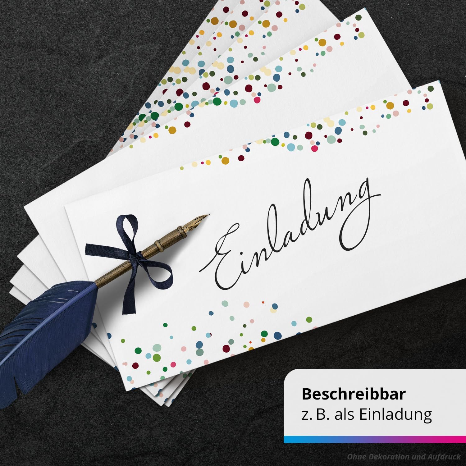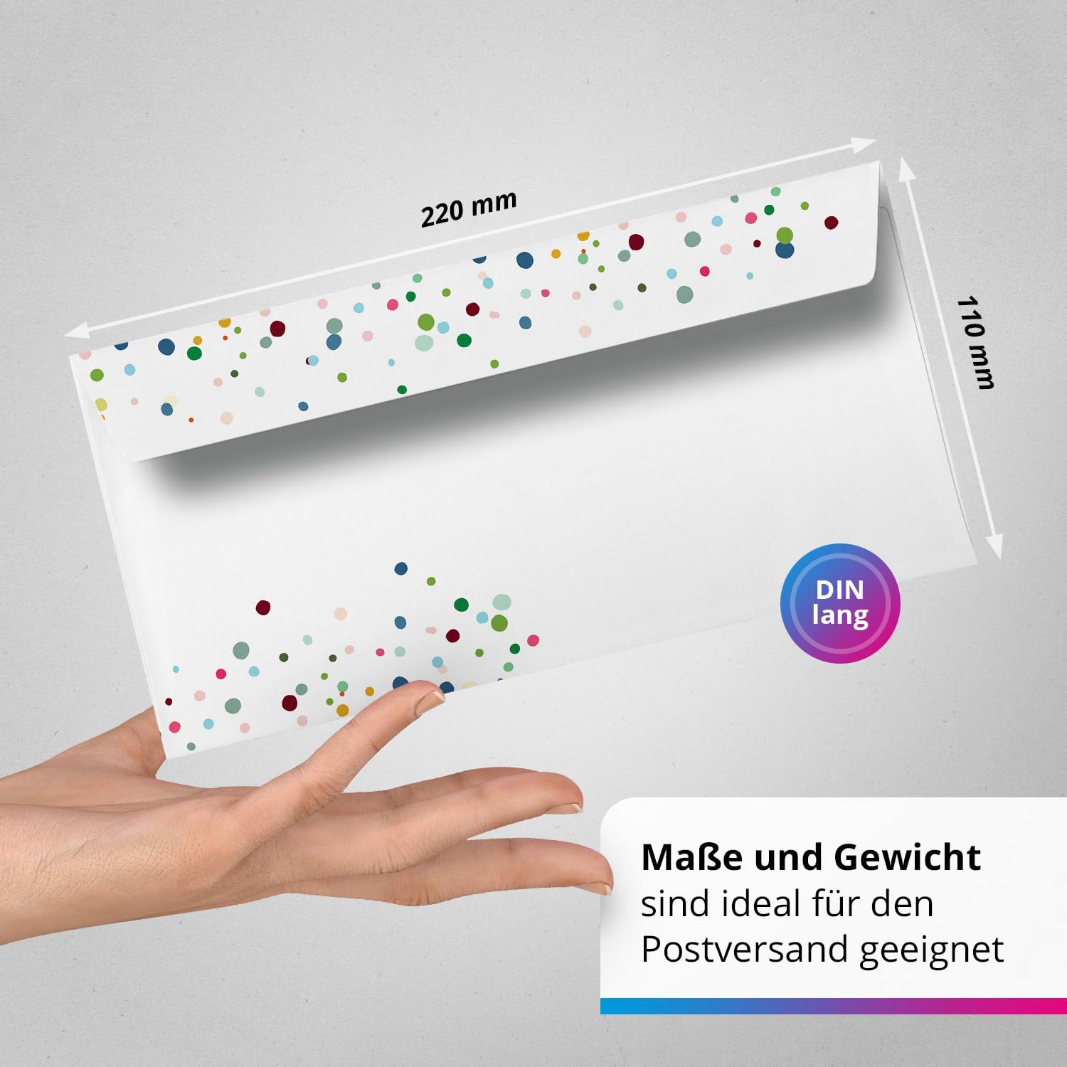 Qualità premium? Le nostre buste di design in formato DIN lungo (circa 110 x 220 mm) entusiasmano per il design di alta qualità e raffinato. Per la migliore qualità possibile, utilizziamo solo la migliore carta offset. Stampate su 90 g/m², le buste sono senza finestra, stampate e scrivibili. Utilizzo versatile: Sia per il vostro business (lettere commerciali), una lettera creativa, come lettera personale, per inviti di compleanno o matrimonio. Le nostre buste con motivo offrono molte possibilità! Design con motivo a buste. Le nostre belle buste DIN lunghe hanno un design bellissimo, moderno e accattivante, sono sempre stampate sul davanti e sul retro, autoadesive, con strisce adesive e senza finestra. Ben protetto? Le nostre buste sono confezionate in una custodia richiudibile per voi nel nostro laboratorio. In questo modo è possibile prelevare solo singole buste, richiuderle e conservarle in modo pratico. Clienti soddisfatti? Siamo soddisfatti solo se siete entusiasti. Se non siete convinti dei nostri prodotti, potete contattarci entro i primi 30 giorni e riceverete un rimborso del prezzo di acquisto! Per ulteriori domande siamo sempre a vostra disposizione? alle vostre domande sarà risposto rapidamente e indivudualmente entro 24 ore.