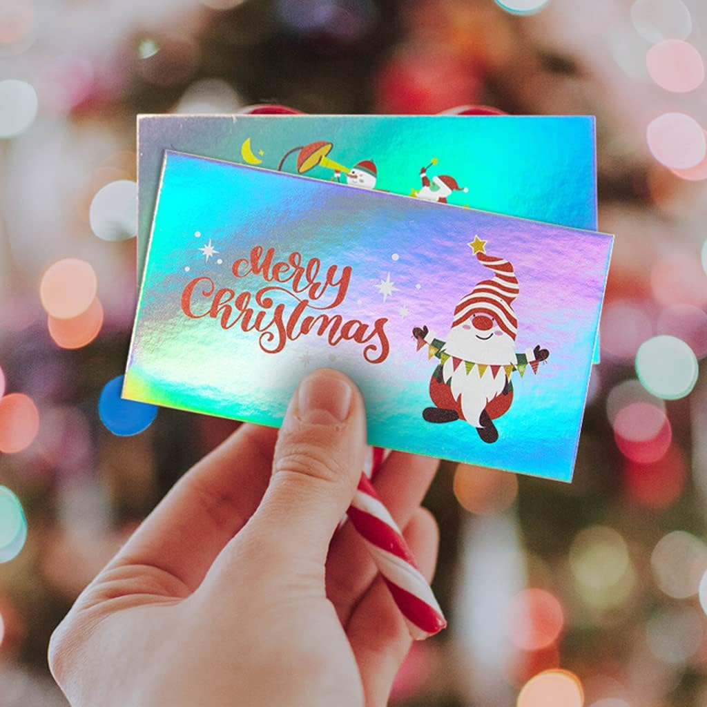 Perfettamente progettato con raffinatezza e presentazione elegante ed efficace. Splendidamente stampato con colori ricchi e tipografia raffinata. La giusta dimensione, comoda da trasportare e riporre. Misura 3,54x1,97 pollici quando piegato e tirato in avanti a metà per piegarlo facilmente e trasformarlo in un biglietto per appunti ordinato. Ideale per biglietti di auguri di Natale e Capodanno, inviti per feste, biglietti di auguri personali o aziendali, partecipazioni di nozze e molto altro ancora. Realizzato con una carta di carta di alta qualità per una maggiore durata. Ogni biglietto è dettagliato in modo professionale utilizzando colori vivaci e caratteri vibranti ed eleganti senza sbavature.