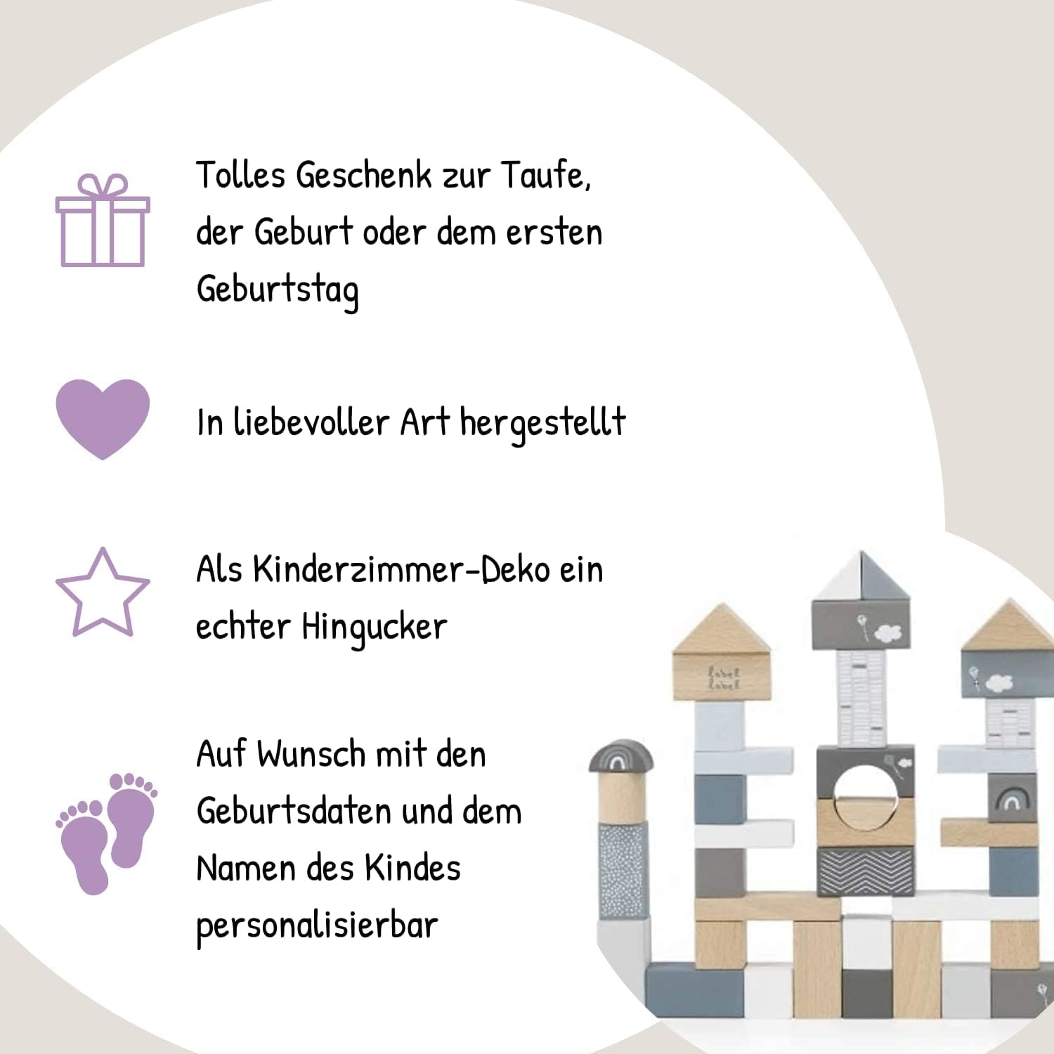 Descrizione prodotto Ciao, bello che tu sia lì Siete alla ricerca di un regalo creativo che accompagni i bambini a lungo, dalla prima selezione alle costruzioni fantasiose? I mattoncini in legno Mainely (50 pezzi) in blu – personalizzati con nome e data di nascita combinano materiale di alta qualità con un design curato. Piccoli costruttori impilano, bilanciano, contano e inventano sempre nuove idee. La robusta scatola portaoggetti mantiene tutto insieme, perfetto come regalo per nascita, battesimo o 2° compleanno per ragazzi e ragazze. Perché questo regalo entusiasma Inizia immediatamente: 50 pietre a presa facile da impilare, filare, ordinare e contare, senza batterie, senza app, 100% fantasia. Apprendimento visibile: riconoscere colori e forme, trovare l'equilibrio, definire i modelli – rafforza le capacità motorie, la coordinazione occhio-mano, la concentrazione e le abilità matematiche precoci. Tranquillità e stile: delicate tonalità di blu con legno naturale creano un'atmosfera di gioco amichevole e si adattano bene alla cameretta dei bambini moderni. Ordine facile: la robusta scatola raccoglie tutti i pezzi dopo la partita, per uno scaffale ordinato e genitori soddisfatti. Ben fatto, costruito per molti anni di gioco. Materiale e finitura: legno levigato liscio con colori a base d'acqua adatti ai bambini, piacevole al tatto senza spigoli vivi, ideale per le mani piccole. Design e utilizzo: mix di mattoncini di diverse dimensioni per torri, sentieri, personaggi e città fantasiose; silenzioso, piacevole sensazione di gioco senza tremolii. Combinabile in modo versatile: integra binari in legno, figure ecc. – dal cantiere al mondo delle fiabe tutto è possibile. Farlo personalmente. Opzioni: nome (consigliato fino a circa 12 caratteri) o nome e date di nascita: discretamente sulla scatola o su una piccola targhetta con il nome. Look armonioso: centriamo e ridimensioniamo la didascalia per un aspetto calmo e di alta qualità per abbinare la tavolozza blu. Uso pratico: nelle famiglie con più bambini o nella kita si confonde meno frequentemente; come regalo il set diventa un pezzo unico. Perché i bambini (e genitori) lo adorano Esperienze di successo: motivare ogni torre stabile e ogni serie di successo – "Posso farlo!" rafforza la fiducia in se stessi e la resistenza. Lingua e fantasia: denominare i colori, confrontare le forme, inventare storie in strutture – così crescono il vocabolario e la creatività. Per tutti i giorni: resistente, piacevolmente silenzioso e veloce da ordinare, ideale per scaffali da gioco, tavolo da salotto o per visitare la nonna e il nonno. Personalizza oggi, veloce in casa tua Scegli il nome (e le date di nascita su richiesta), facciamo il resto: un set di costruzione robusto ed elegante che viene giocato volentieri e mantiene l'ordine ed è splendidamente personale. Ordina ora e crea grandi ricordi dai piccoli momenti di gioco. Facts Block Prodotto: mattoncini Mainely in legno blu – 50 pezzi personalizzati con nome e date di nascita Numero di pezzi: 50 pezzi (mix di blocchi/blocchi) Colore: tonalità blu/pastello con accenti in legno naturale. Età consigliata: a partire da circa 2 anni (sotto supervisione) Materiale: legno, vernici a base d'acqua; bordi arrotondati Contenuto: 50 mattoncini di legno + scatola resistente. Utilizzo: impilare, ordinare, modellare, costruire liberamente; decorativo nella stanza dei bambini Manutenzione: pulire con un panno asciutto o leggermente umido; conservare in luogo asciutto. Personalizzazione: nome (fino a circa 12 caratteri) o nome e date di nascita; Posizionamento su scatola/placca EAN: 4262548570766. Avviso di sicurezza Da utilizzare sotto la supervisione di un adulto.