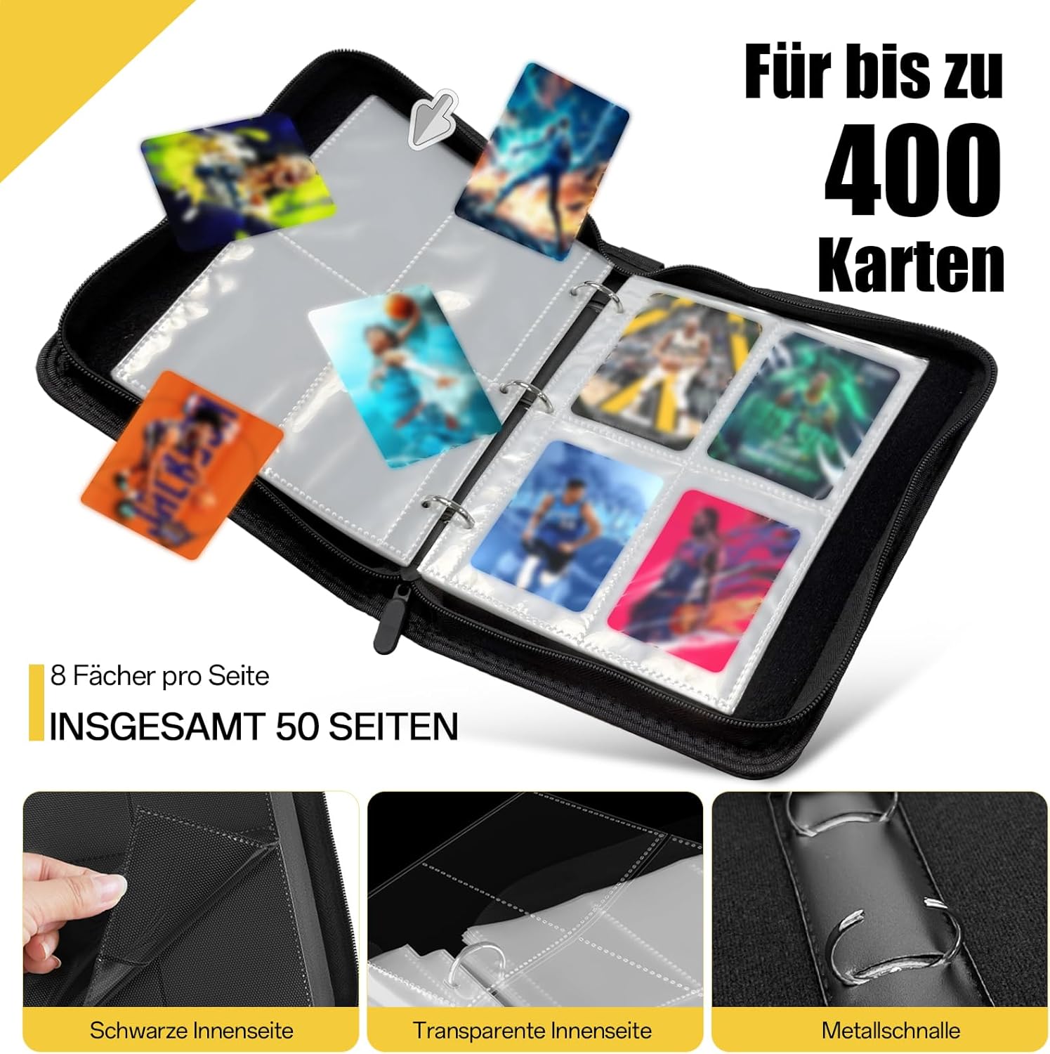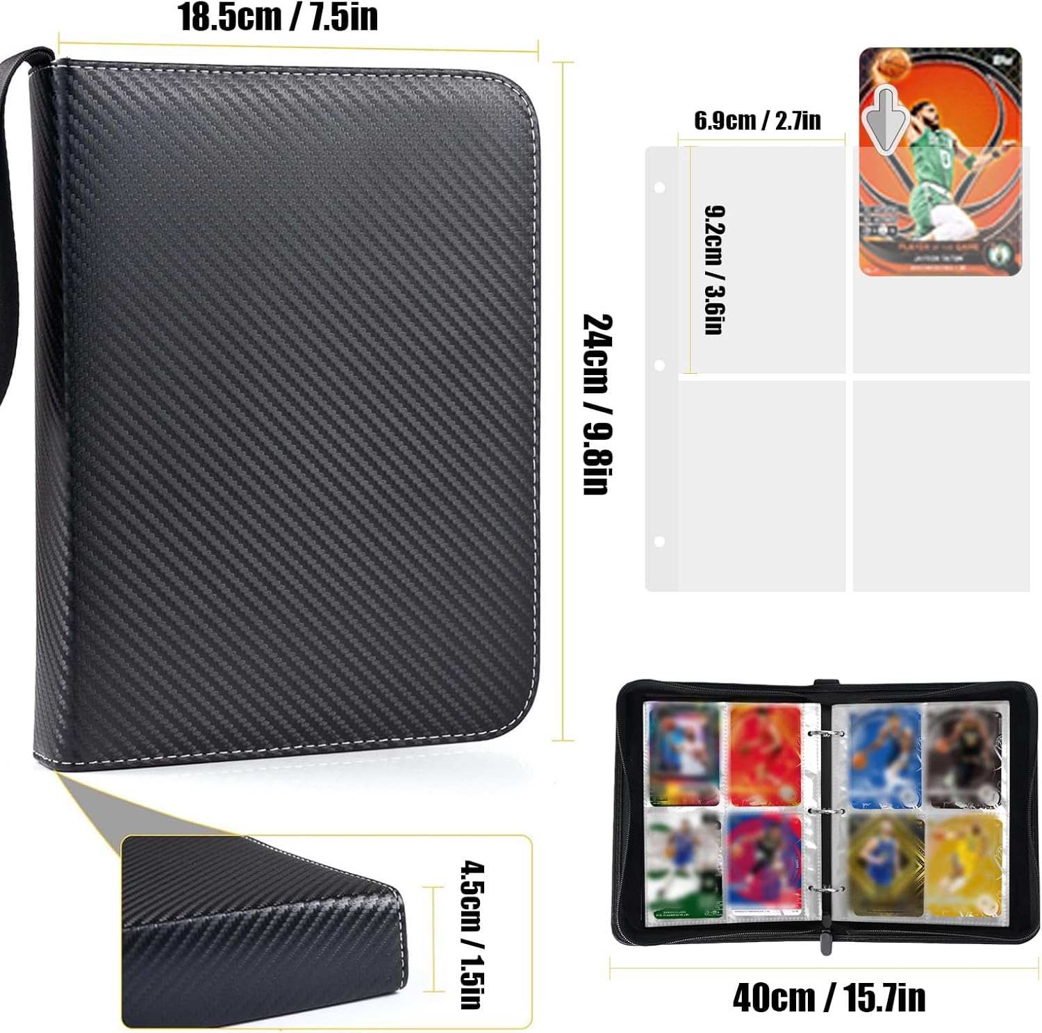 Contiene 400 carte: questo album da collezione misura 24 x 18 x 4,5 cm e dispone di 4 pagine tascabili con 50 tasche a doppia faccia in cui le carte possono essere conservate in modo sicuro su entrambi i lati. Dimensioni standard della carta: ogni borsa misura 9,2 x 6,8 cm ed è progettata per un'elevata capacità. Si adatta facilmente a tutte le carte collezionabili di dimensioni standard, tra cui carte da gioco, carte sportive (calcio, baseball) e carte fotografiche. 【Copertura strutturale in PU】 Realizzato in pelle PU resistente, resistente all'abrasione e ha una struttura liscia. All'interno, le pellicole trasparenti in plastica PP garantiscono un inserimento regolare delle carte e una maggiore protezione. Chiusura lampo e cinturino da polso: una cerniera sicura impedisce che le carte scivolino o si danneggiino. Con pratico cinturino da polso per un facile trasporto e uso quotidiano. Regalo ideale: con la sua classica copertina effetto lino e il suo design minimalista, questo raccoglitore per carte è il regalo perfetto per bambini e adulti che amano collezionare biglietti, ideale per compleanni, Natale e altre occasioni speciali.