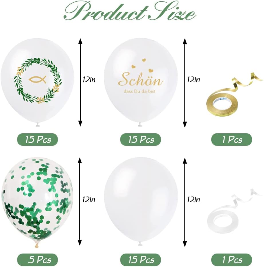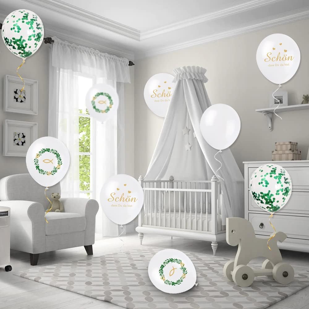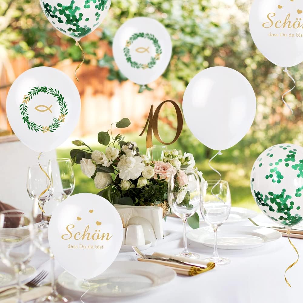 La confezione include: riceverai 50 palloncini decorativi per battesimo, contenenti 15 palloncini bianchi, 15 palloncini bianchi con disegno di pesci dorati e ghirlanda di foglie, 15 palloncini bianchi con "Schön Dass Du da Bist", 5 palloncini coriandoli verdi, 1 nastro bianco 1 nastro dorato. 【Design unico】Aggiungendo il motivo del pesce Cristo e della ghirlanda verde, si adatta meglio al tema del battesimo della comunione; il testo “Felice che tu sia qui” aggiunge un simpatico sottofondo, sarà una comunione indimenticabile! 【Materiale di alta qualità】 I nostri palloncini sono realizzati in lattice, abbastanza spessi da non rompersi facilmente. può supportare l'inflazione di aria ed elio. I nostri palloncini dal design unico sono perfetti per festeggiare la Prima Comunione. 【Decorazione perfetta per la comunione】 Decorazione perfetta per battesimo, comunione, cresima, decorazione della prima comunione, matrimonio, ecc. Aggiungi atmosfera e ricordi indimenticabili a varie occasioni. 【Suggerimenti caldi】 Il palloncino può essere riempito con aria ed elio e ogni palloncino sarà abbastanza grande dopo l'inflazione. Si prega di non gonfiare eccessivamente il palloncino per evitare esplosioni accidentali.
